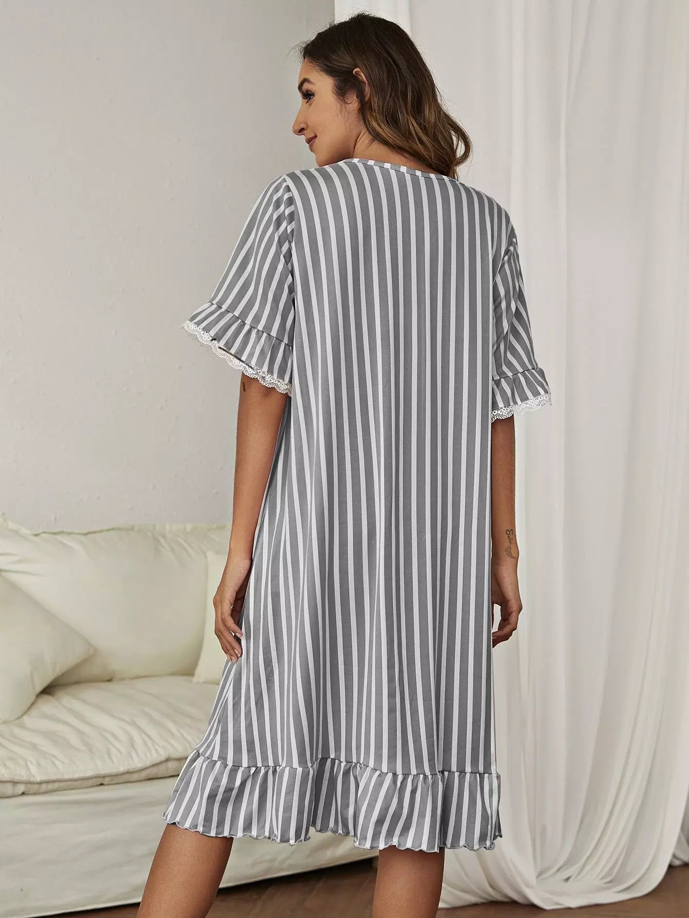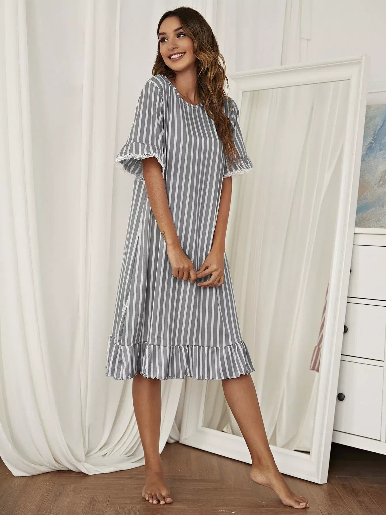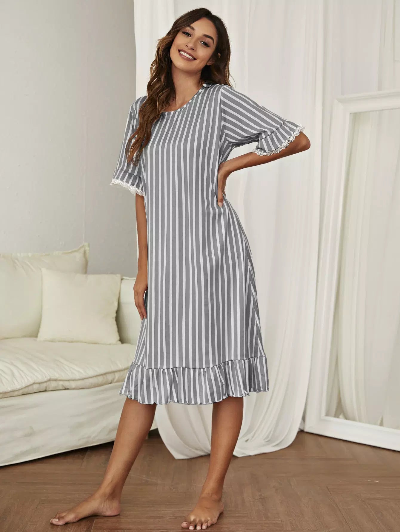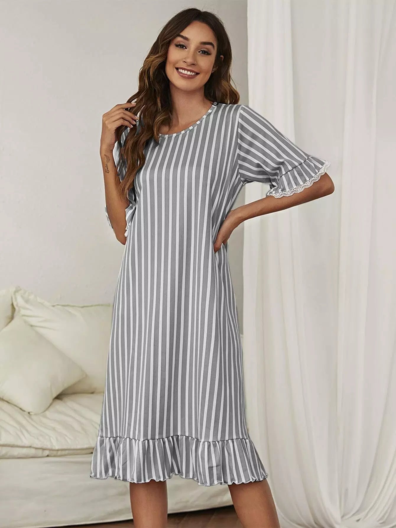 Striped Lace Trim Ruffle Night Dress