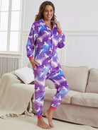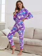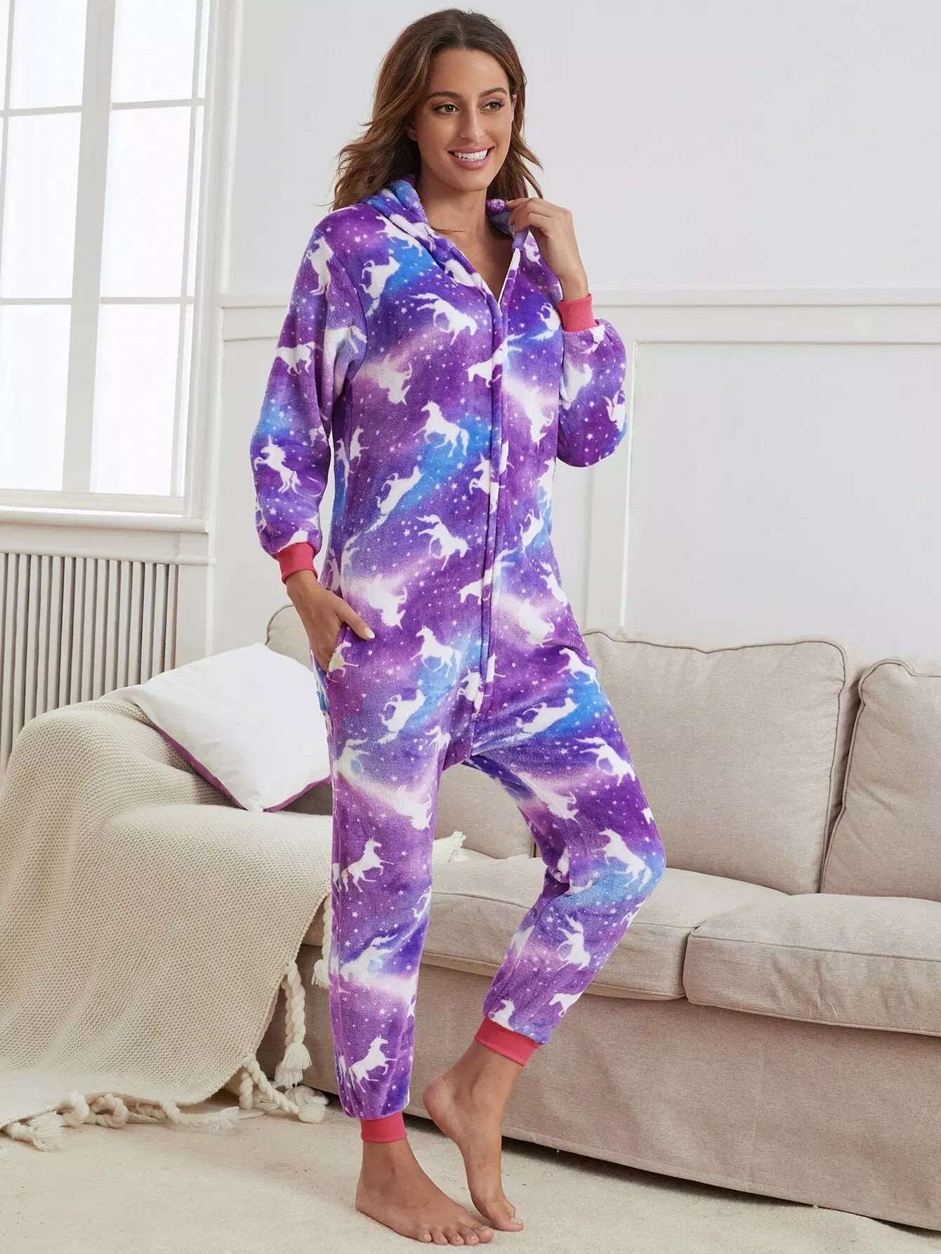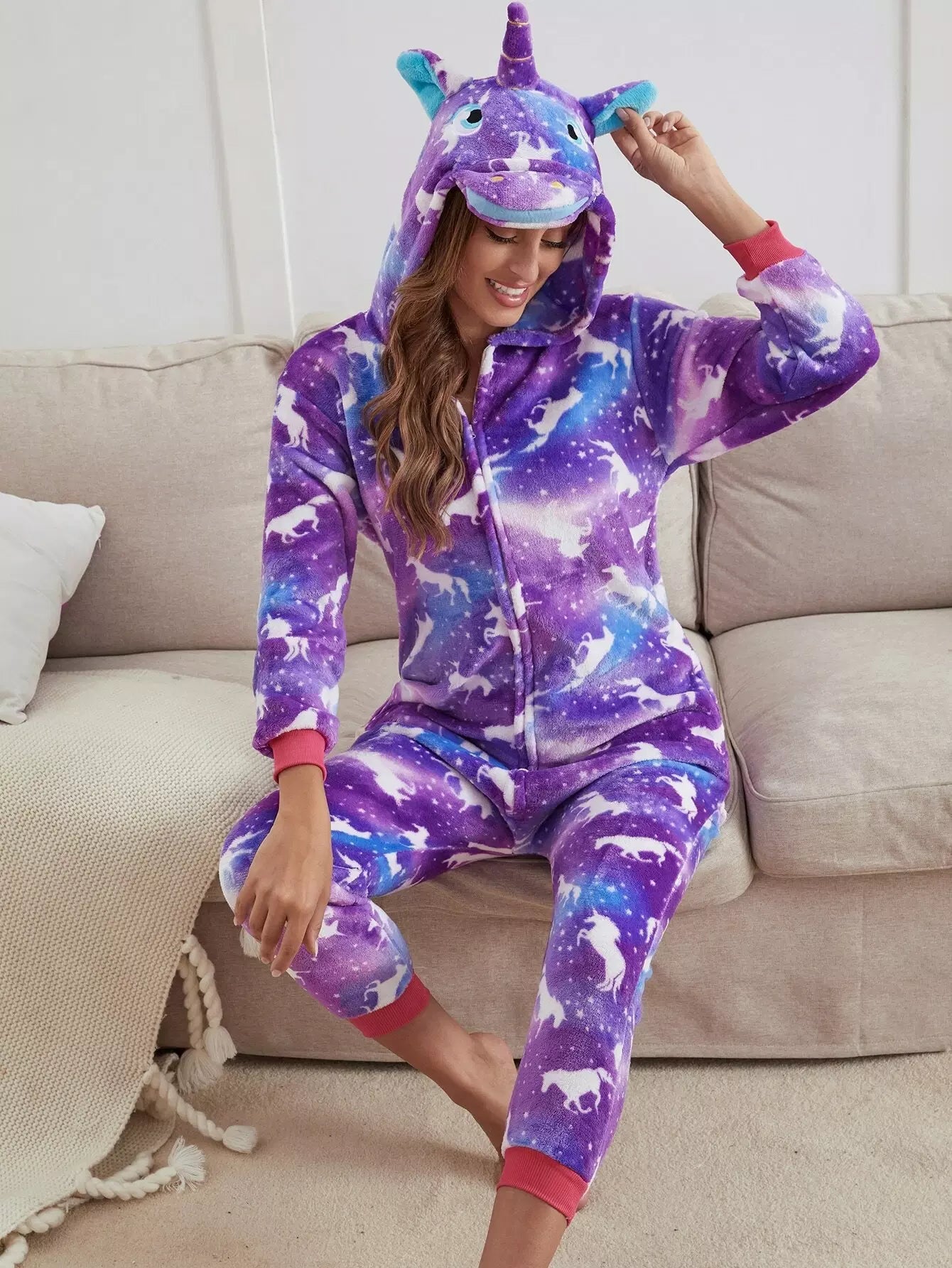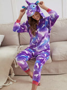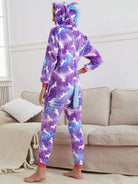 Unicorn Print Tie Dye 3D Ear Design Hooded Flannel Sleep Jumpsuit