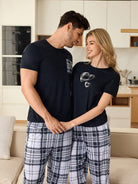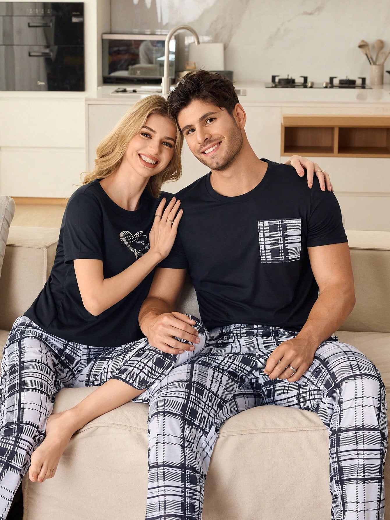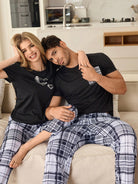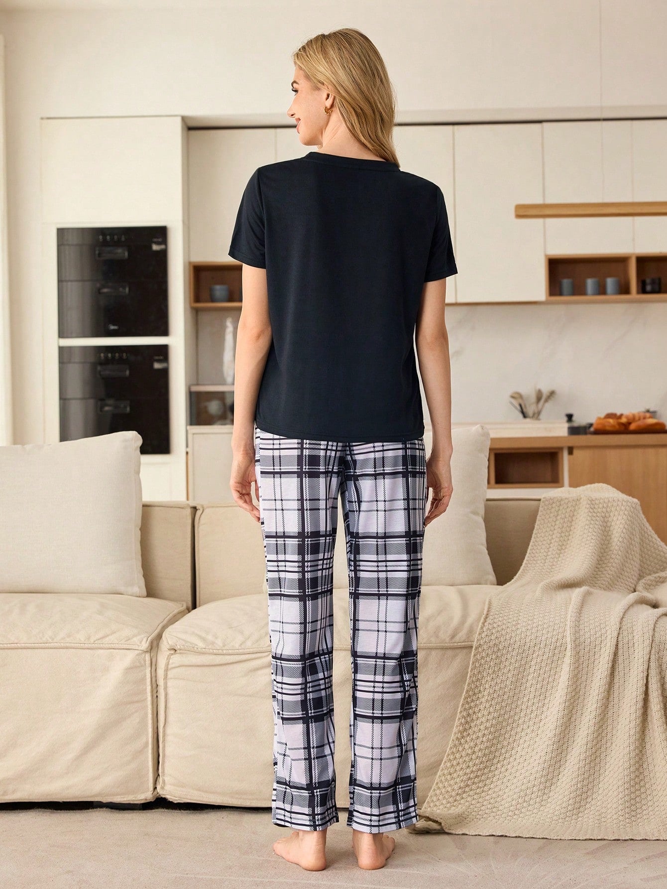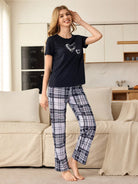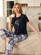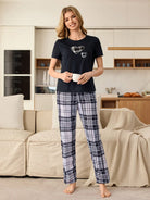 Women Heart Print Short Sleeve Top And Plaid Pants Pajama Set