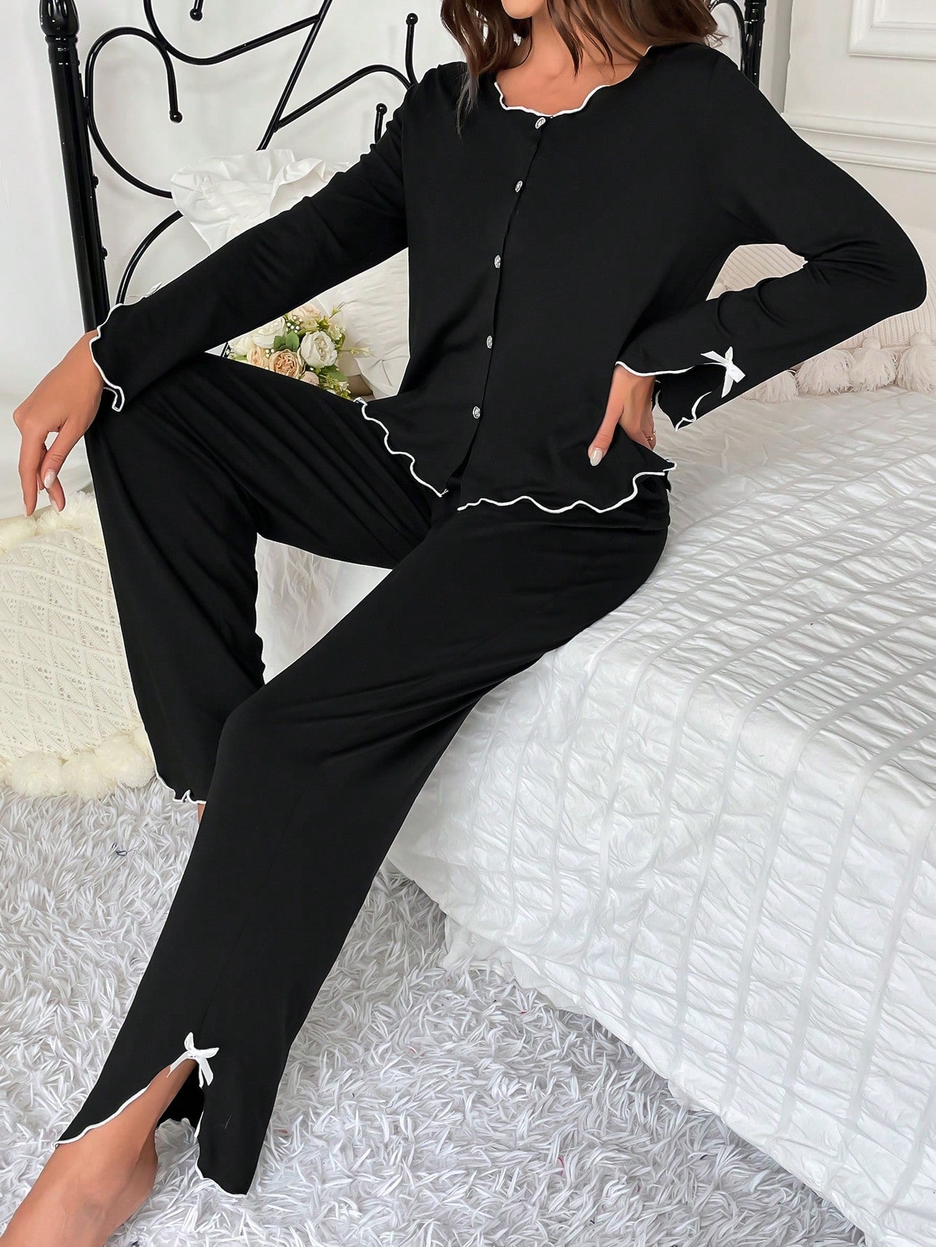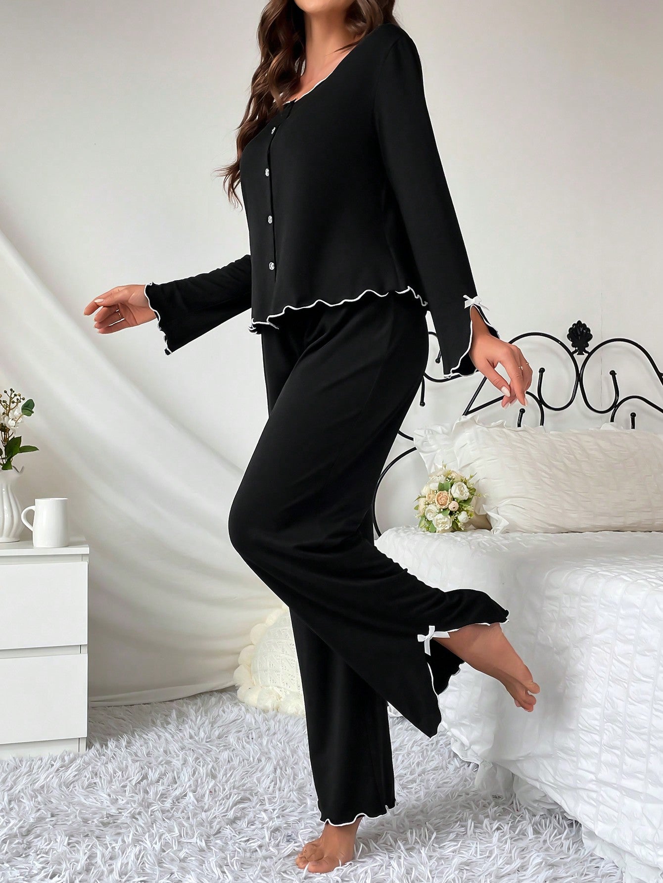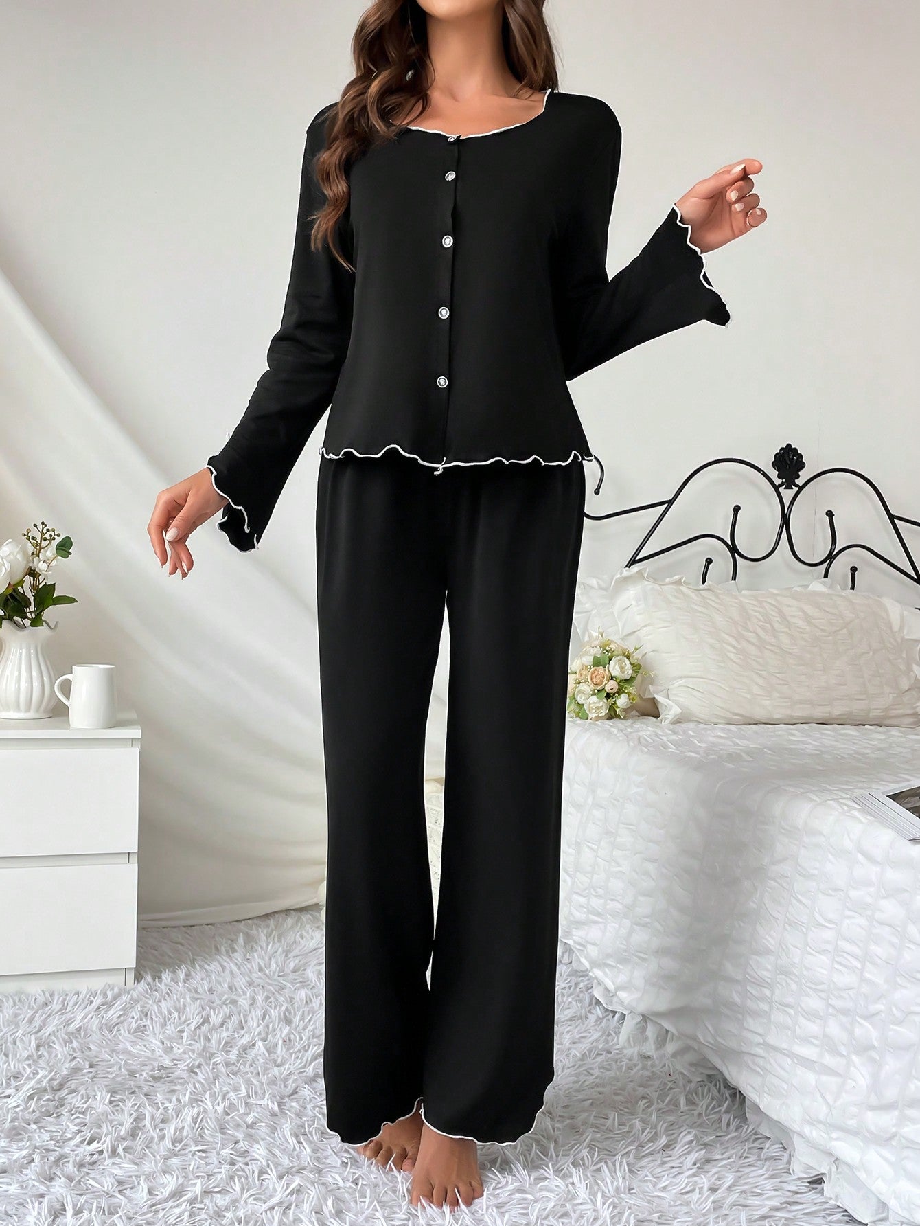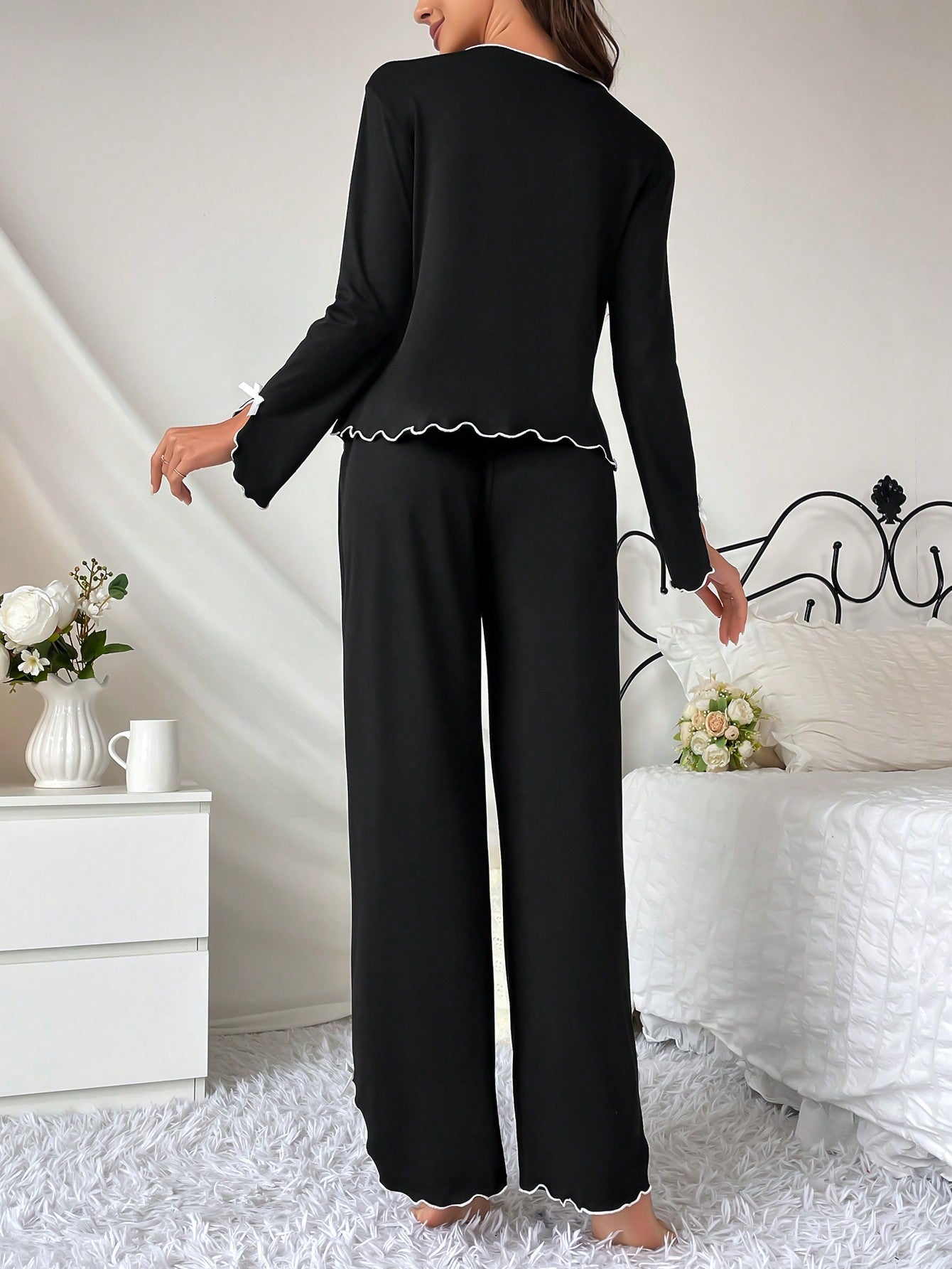 Women's Lettuce Trim Homewear Lounge Set Outfit Cozy And Elegant Details