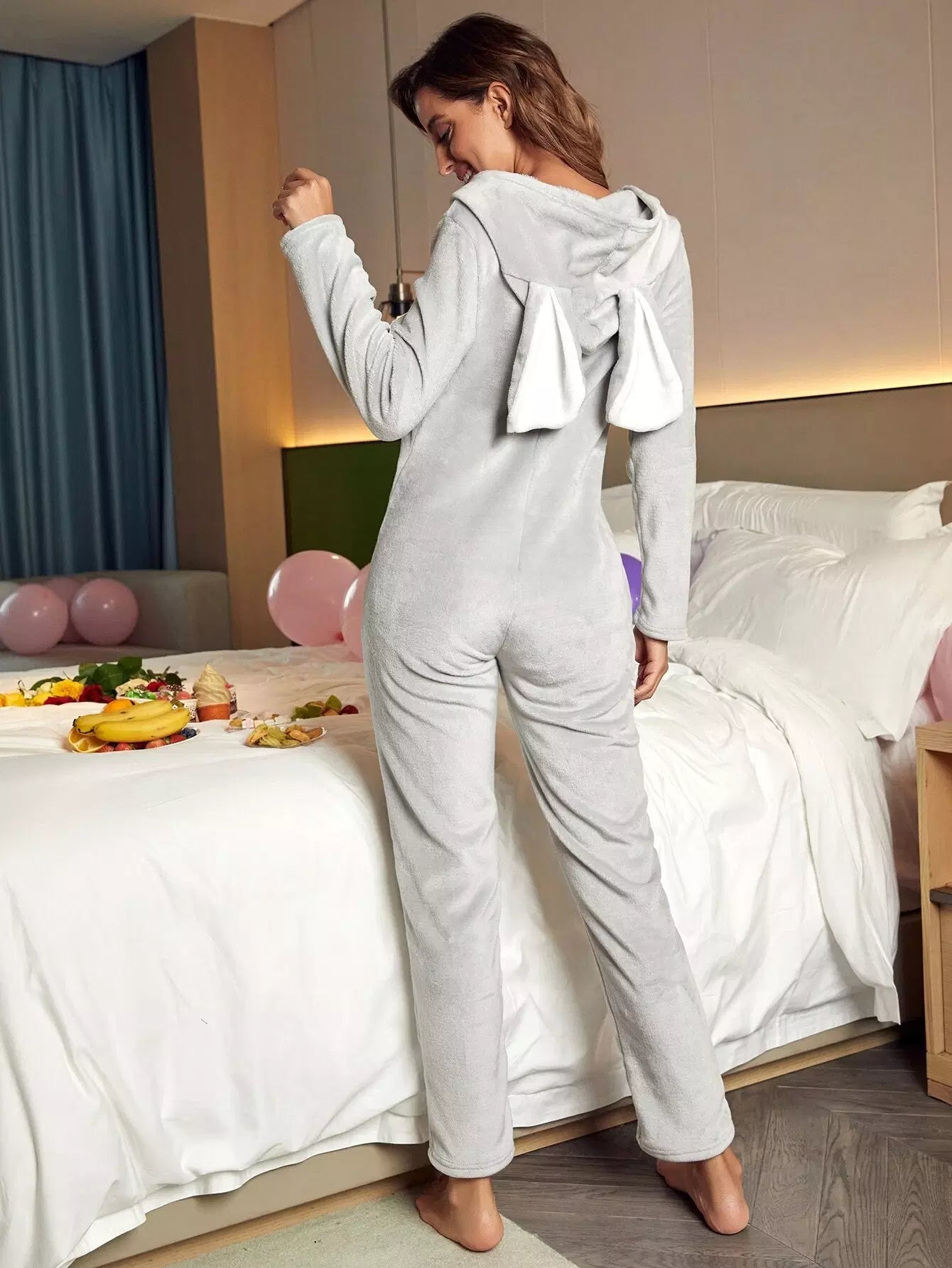 Zip Up Two Tone 3D Ears Design Hooded Flannel Sleep Jumpsuit