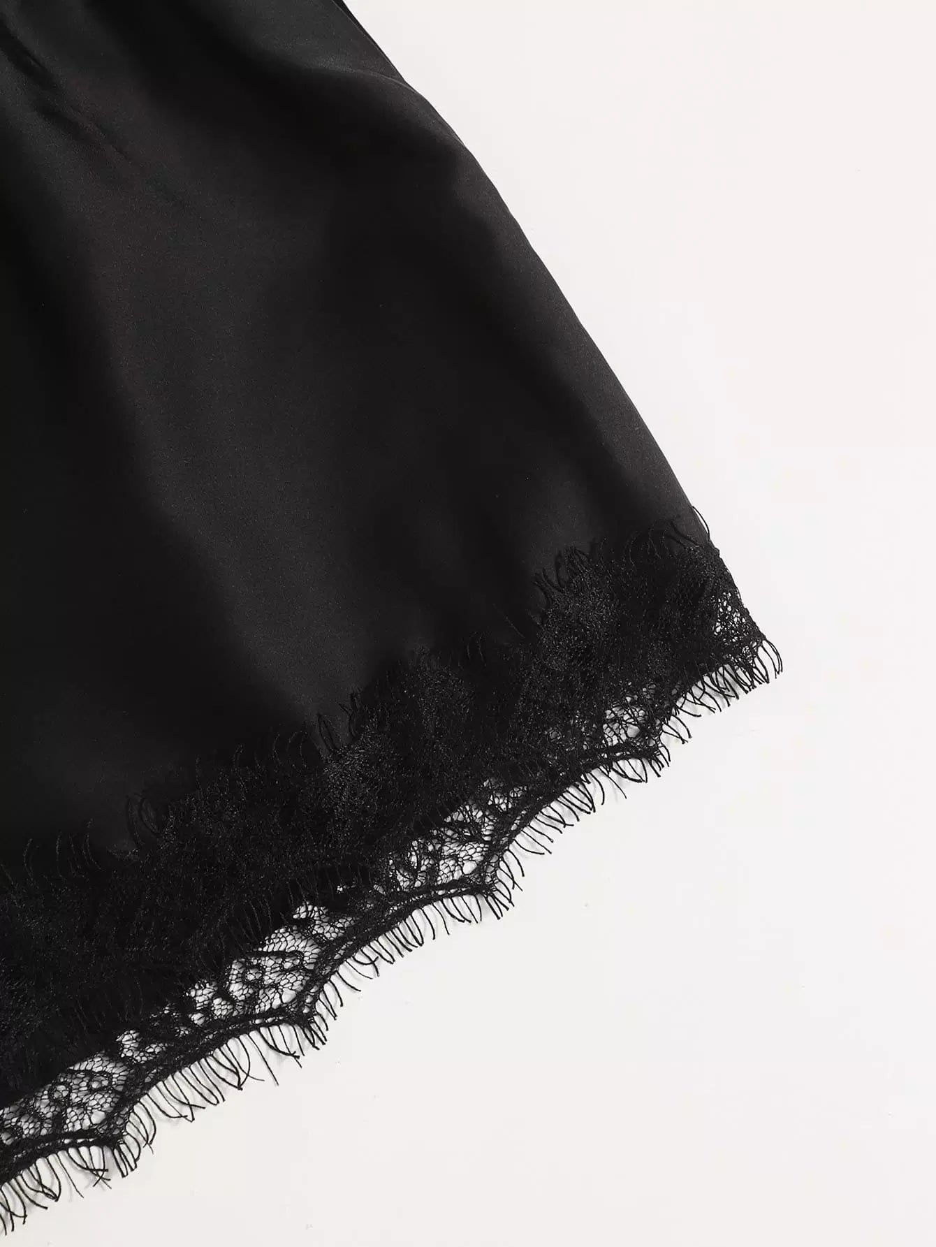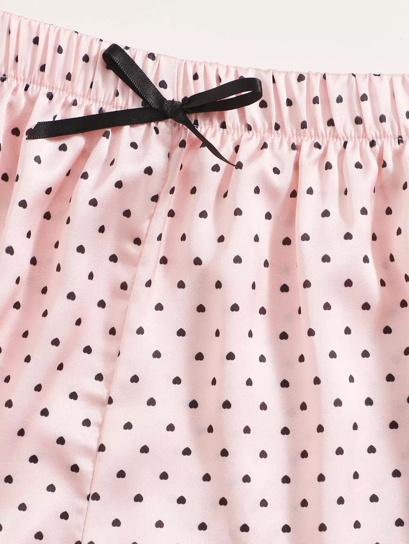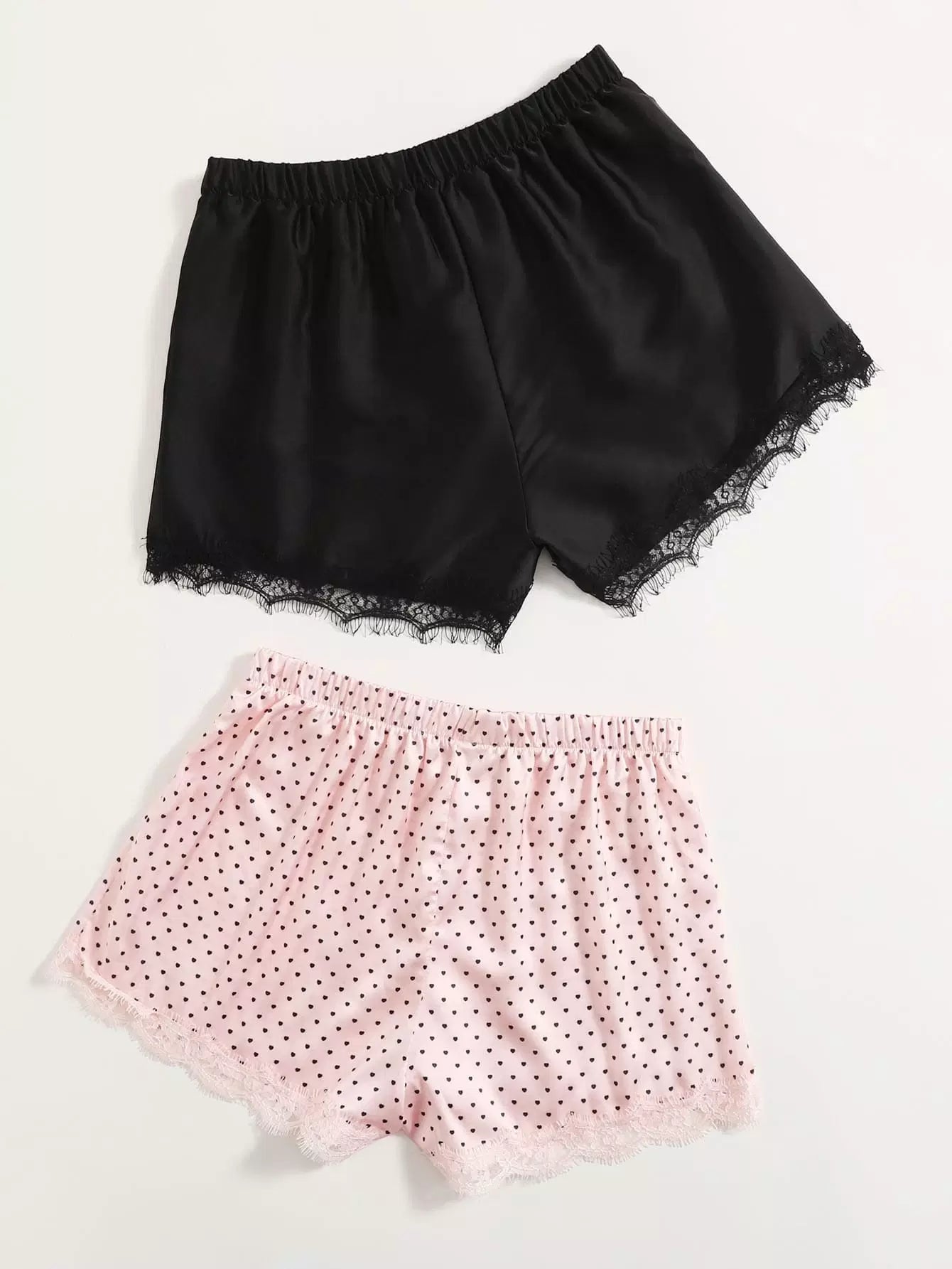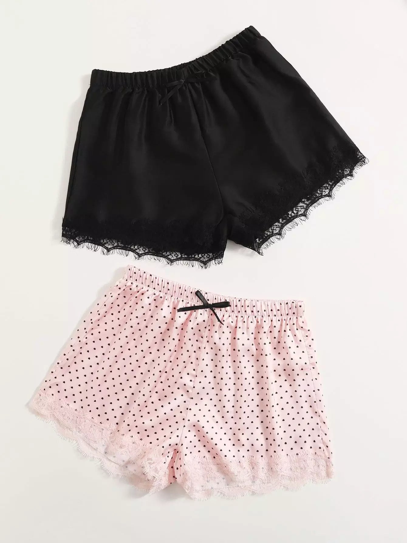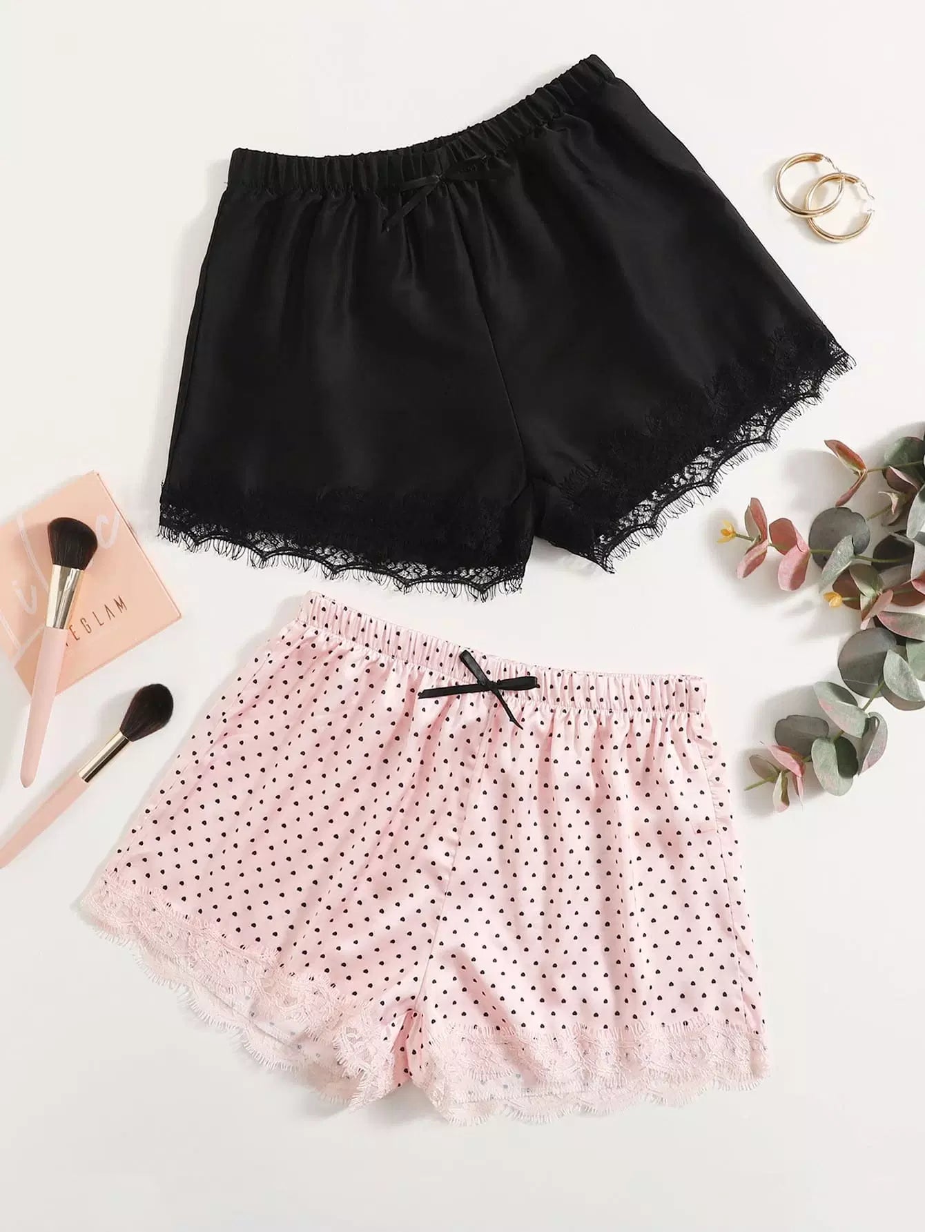 2pcs Polka Dot Bow Front Contrast Lace Night Shorts