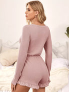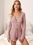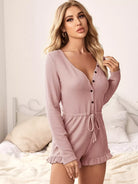 Waffle Knit Drawstring Ruffle Hem Lounge Romper