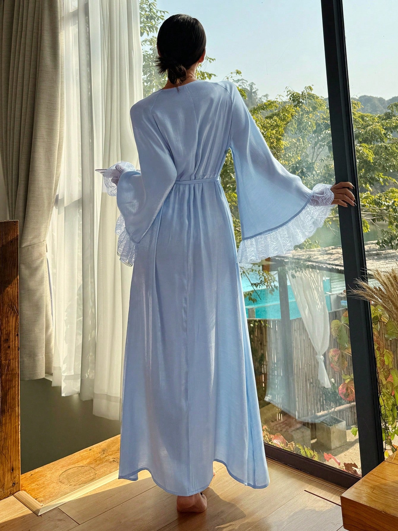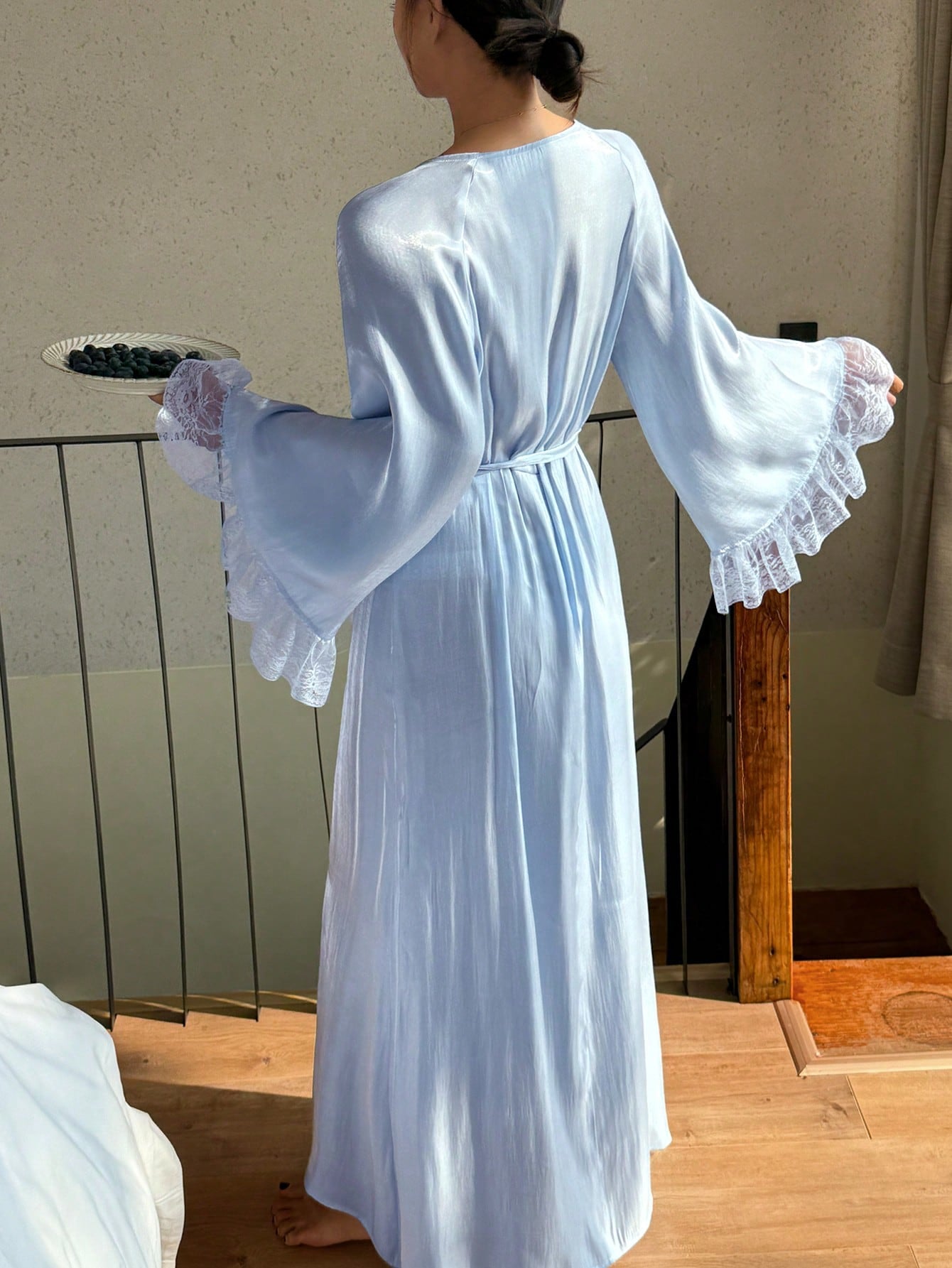 DAZY Women's Lace Patchwork Lightweight Silky Raglan Sleeve Robe With Self-Tie Belt Pajama