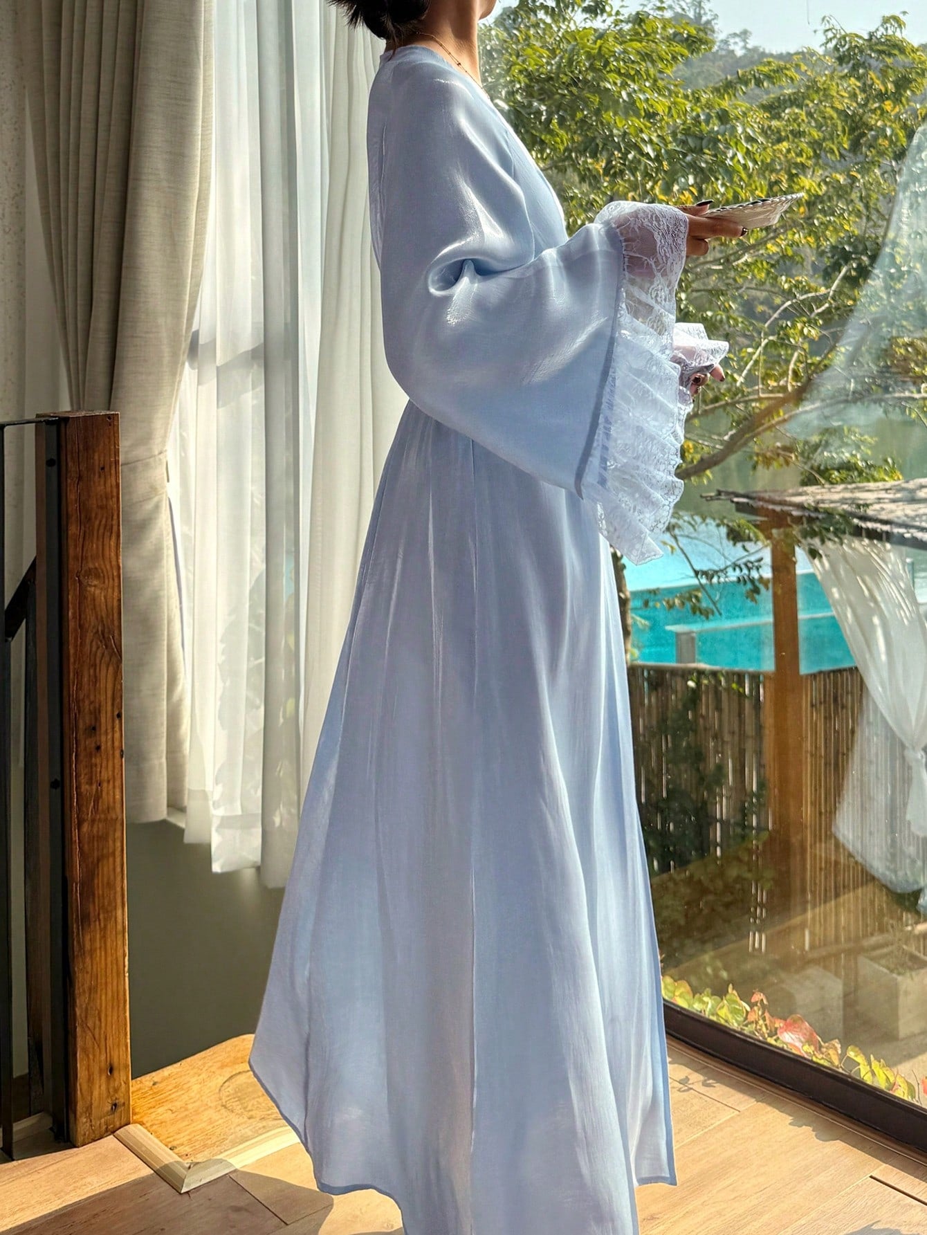 DAZY Women's Lace Patchwork Lightweight Silky Raglan Sleeve Robe With Self-Tie Pajama Without Belt
