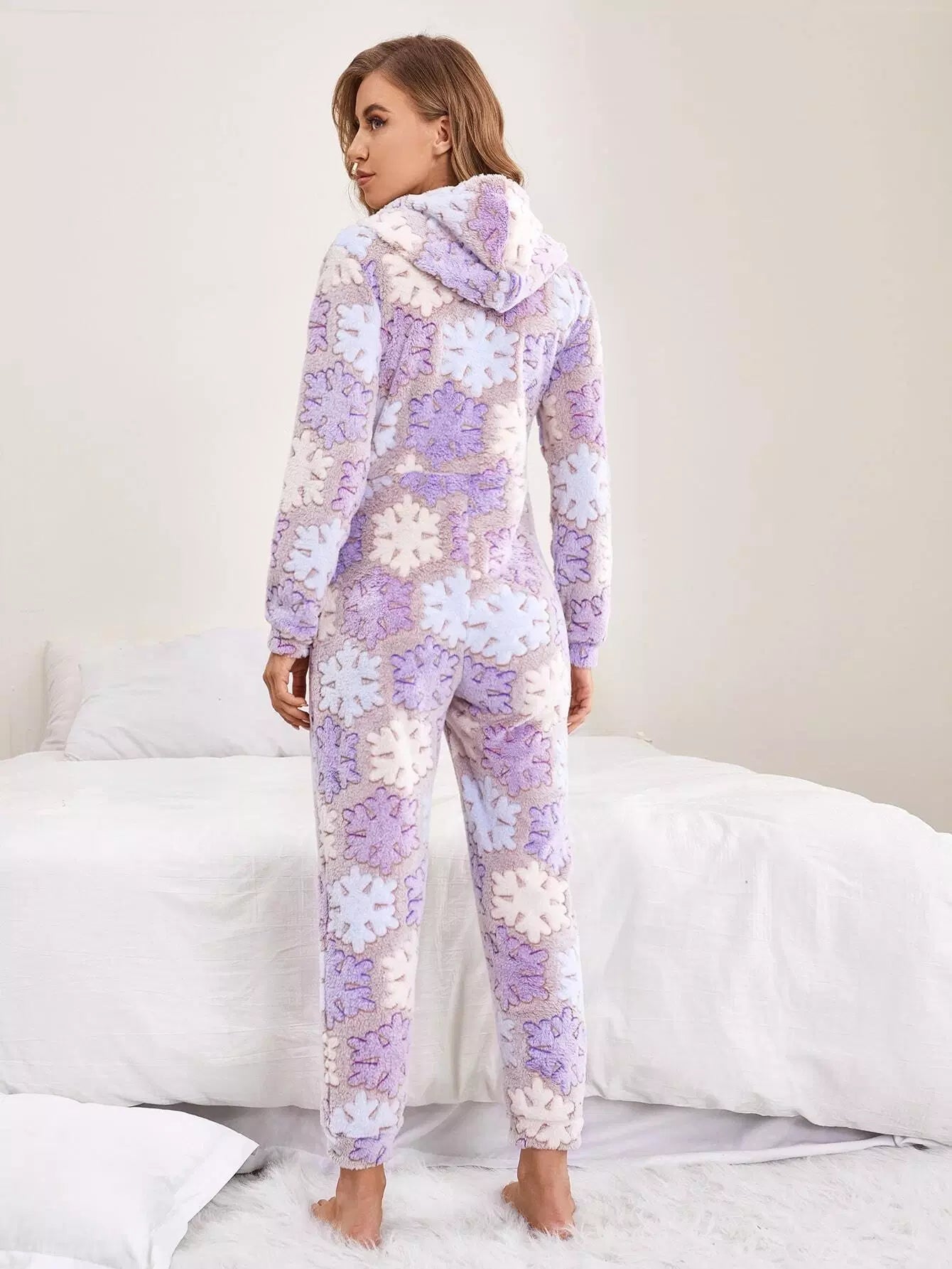 Snowflake Print Zipper Front Hooded Flannel Plush Onesie
