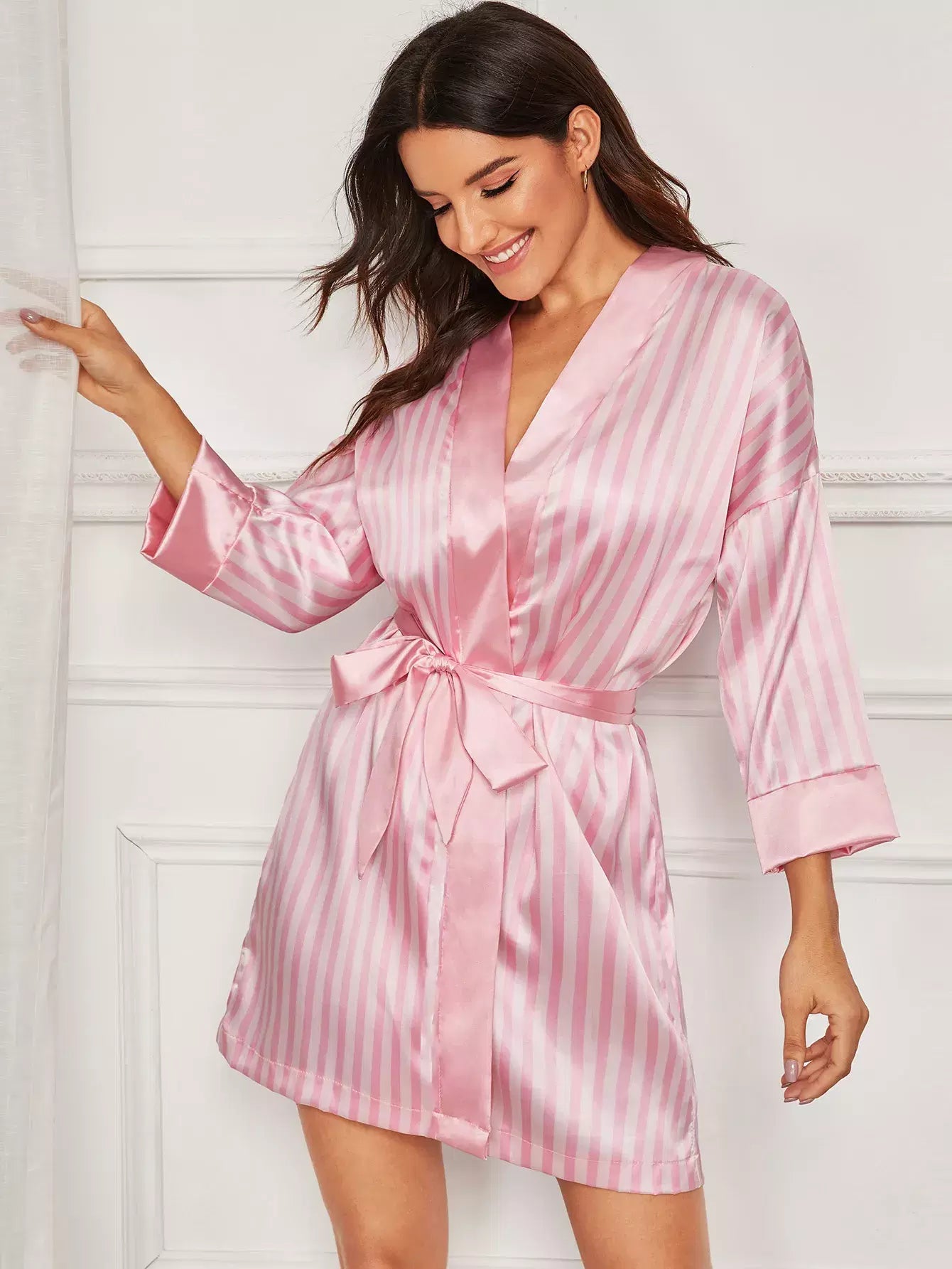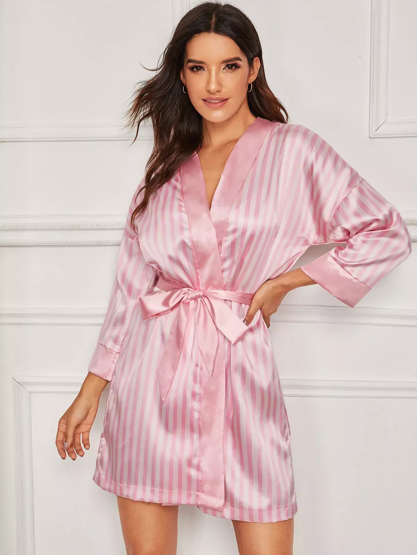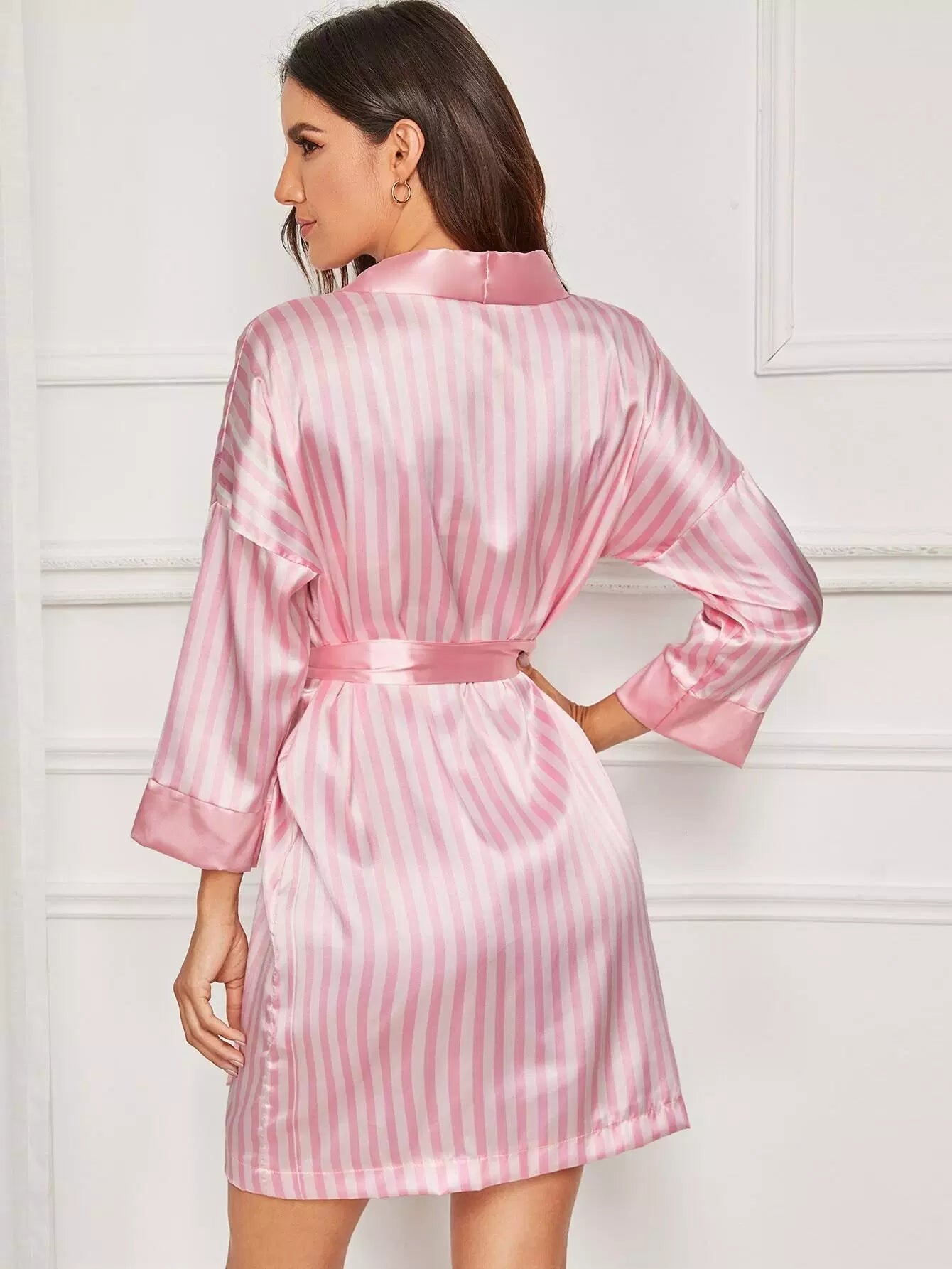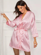 Women - Striped Self Belted Satin Robe