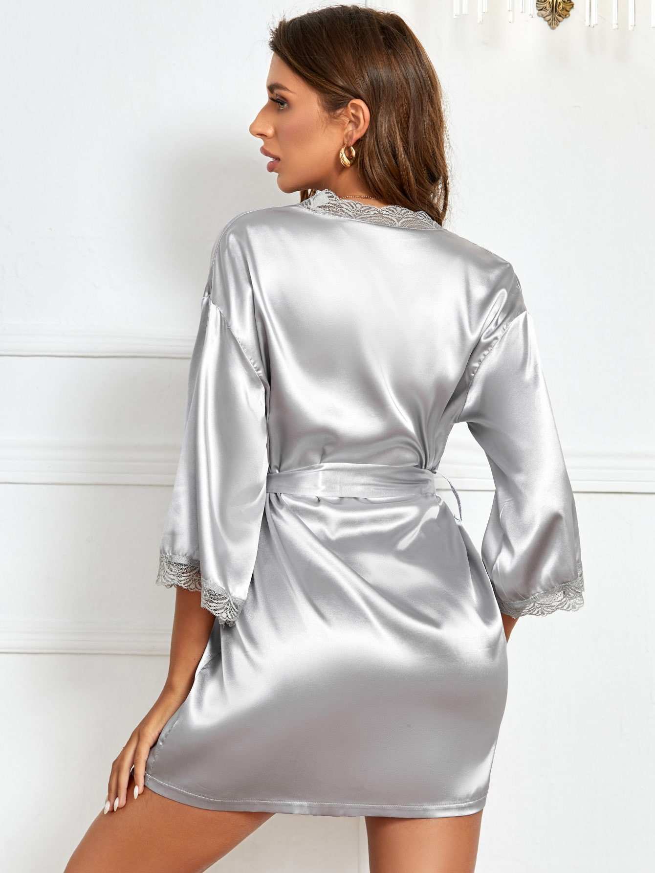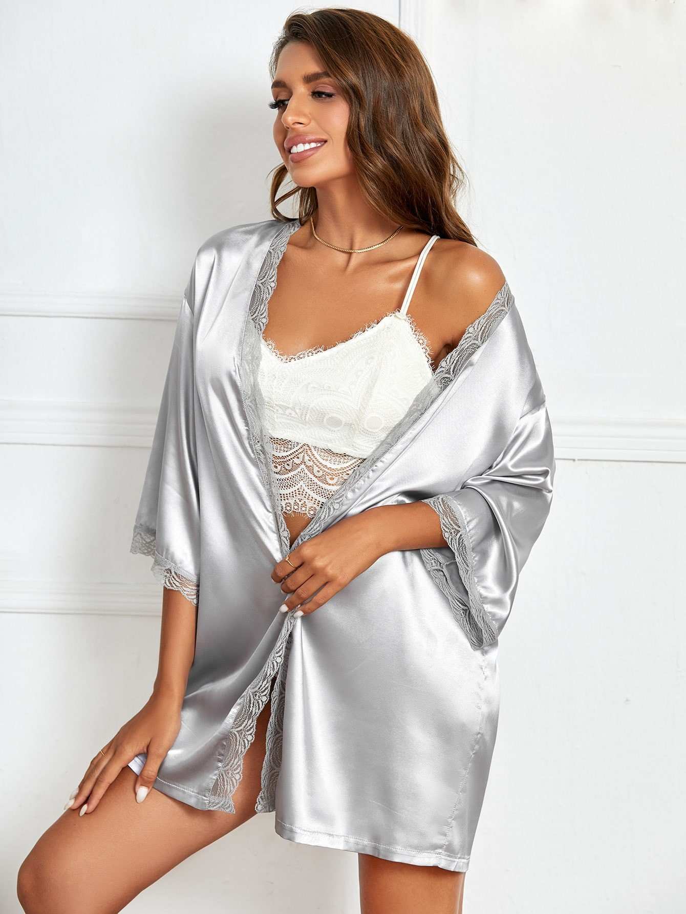 Satin Contrast Lace Night Robe Without Belt