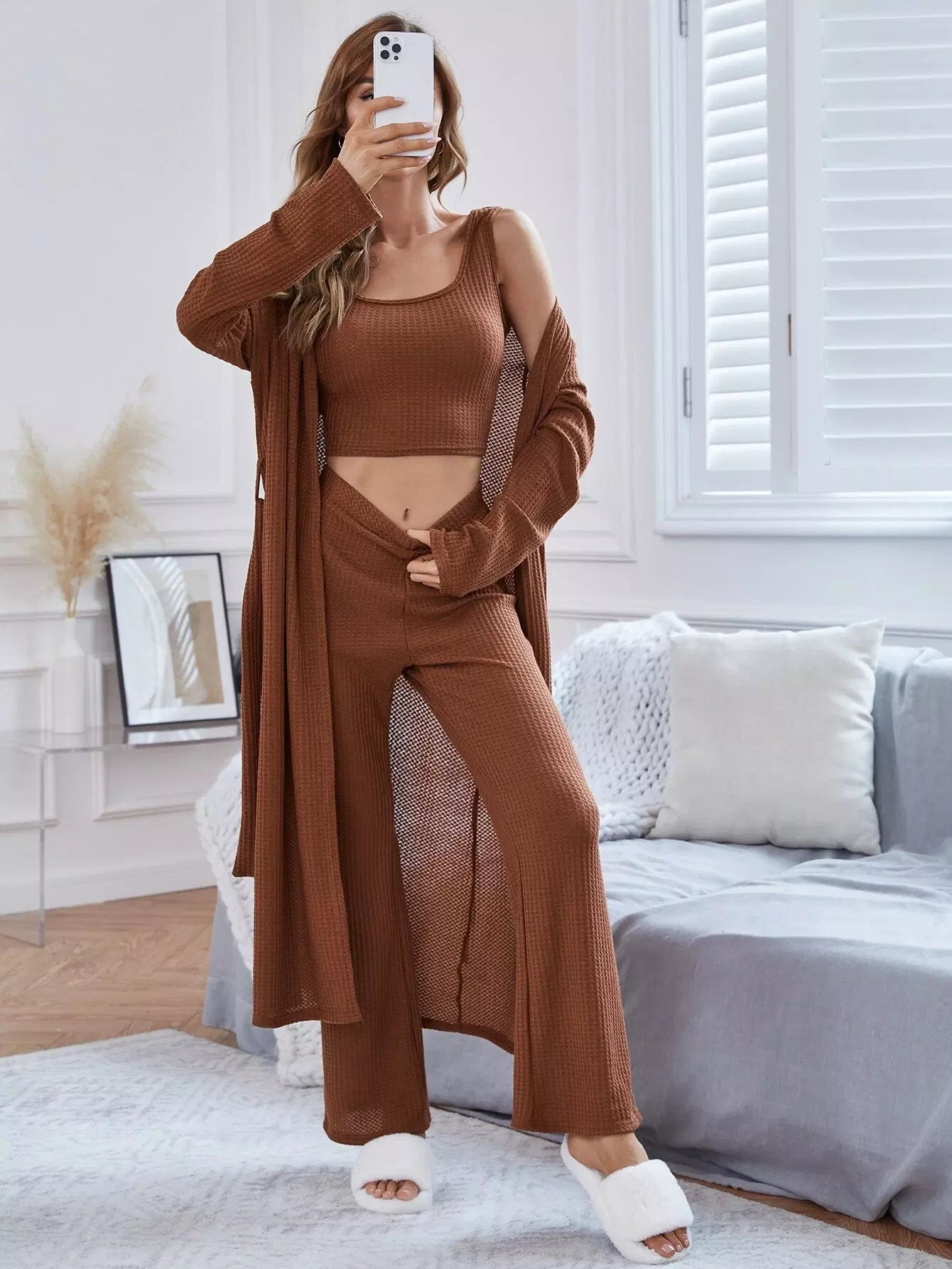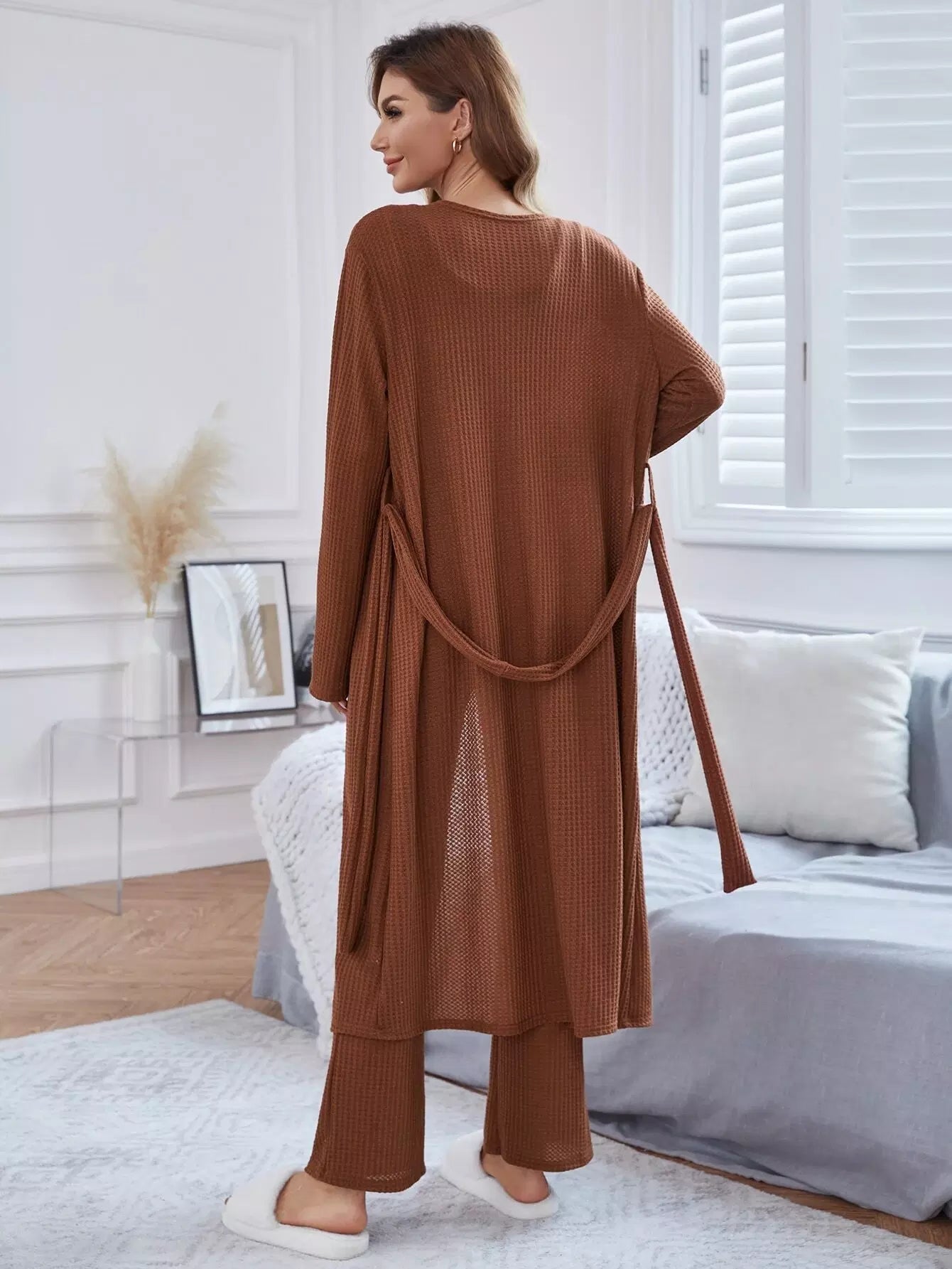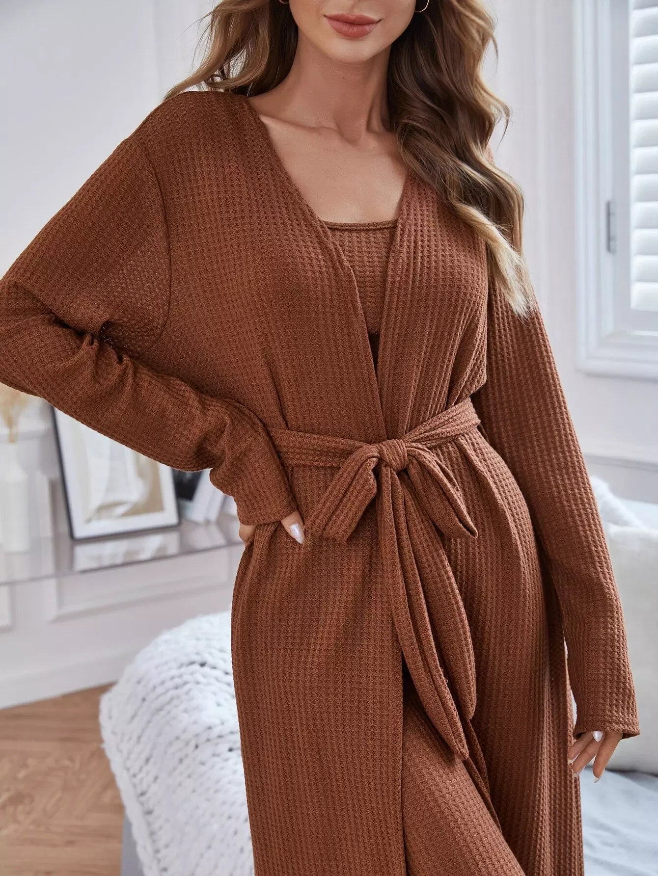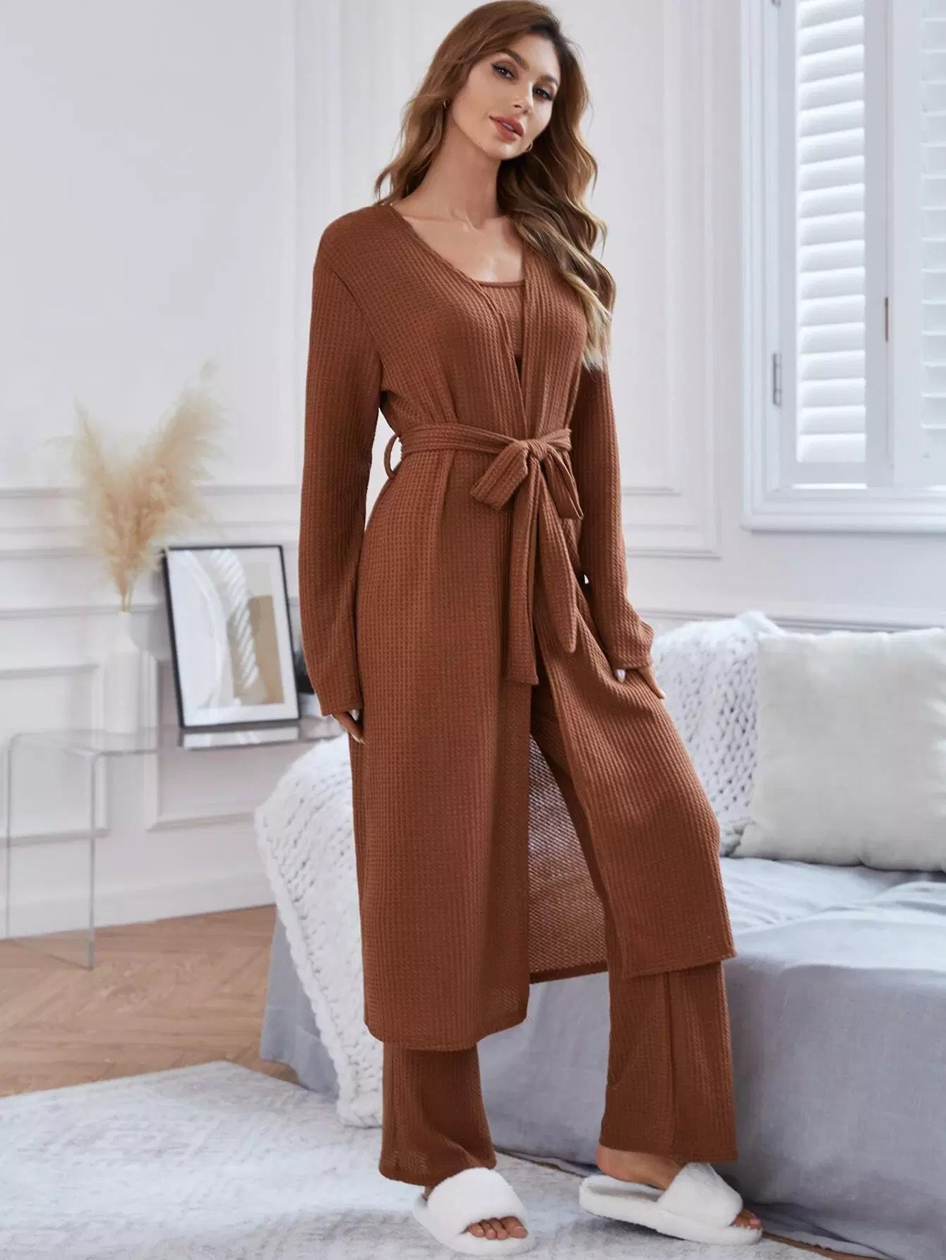 Open Front Robe & Tank Top & Pants Lounge Set Without Belt
