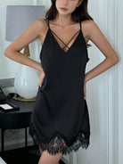 women DAZY Strappy Crossed Hollow Out Satin & Lace Patchwork Sexy Backless Camisole Nightgown Pajama
