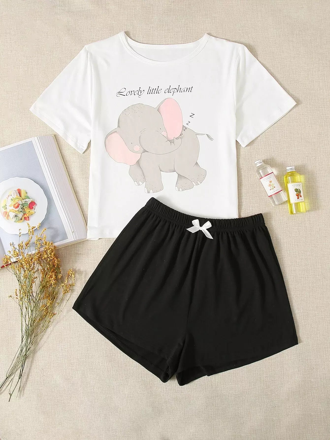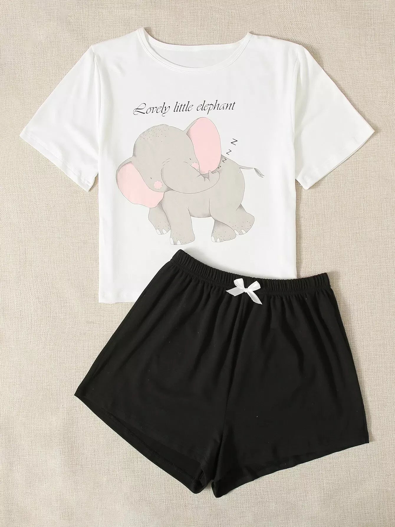 Women - Cartoon Elephant And Slogan Graphic Pajama Set
