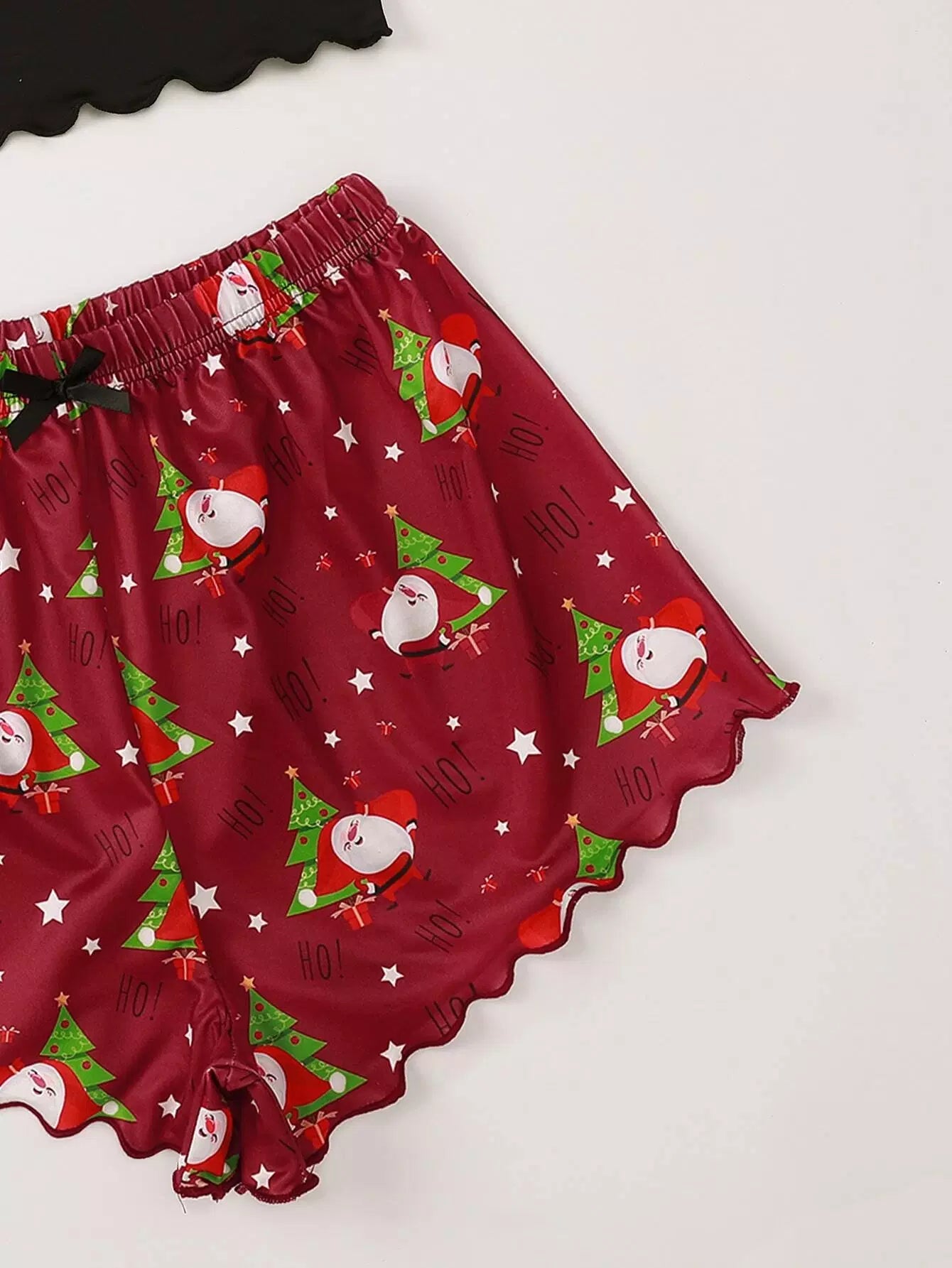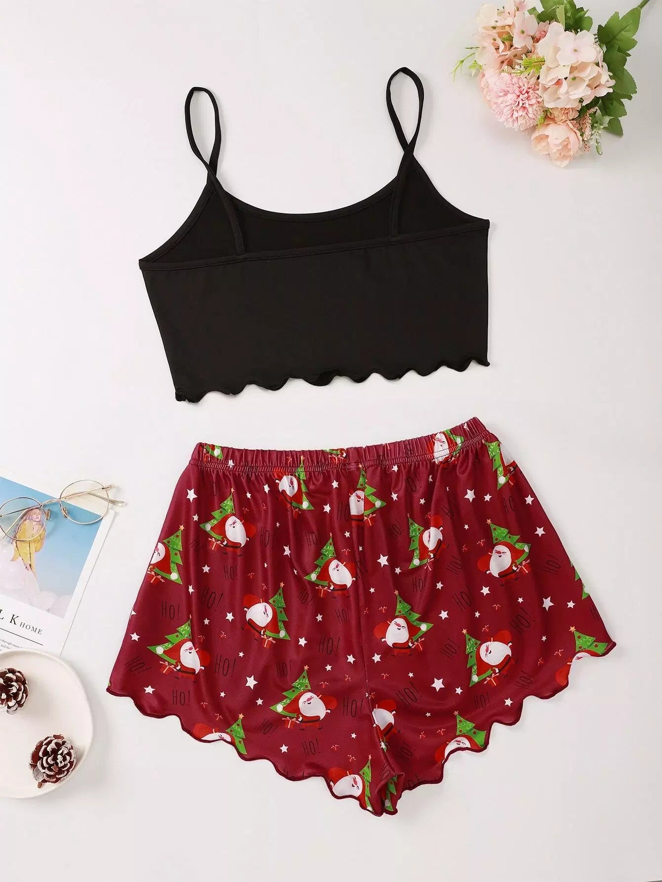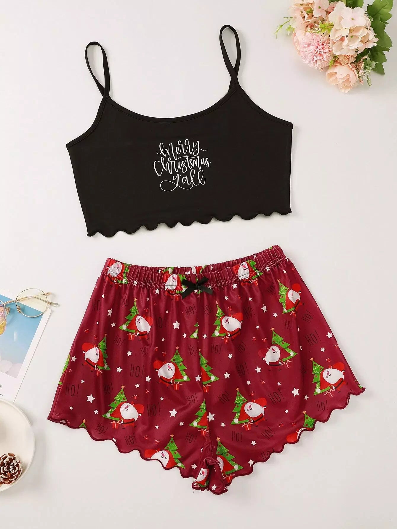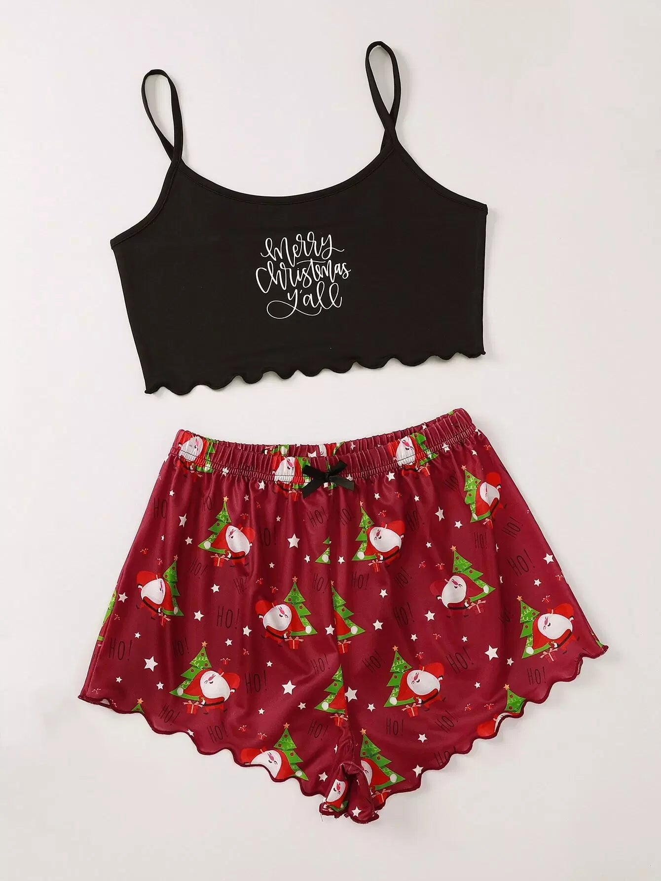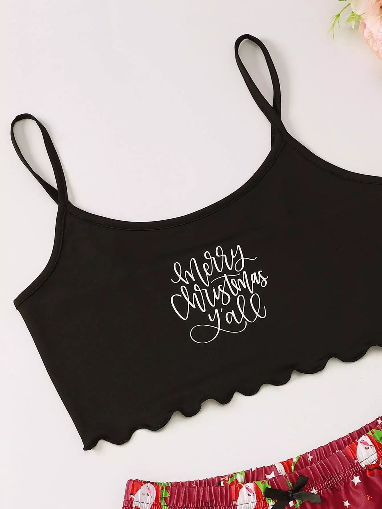 Christmas & Slogan Graphic Lettuce Trim Cami PJ Set