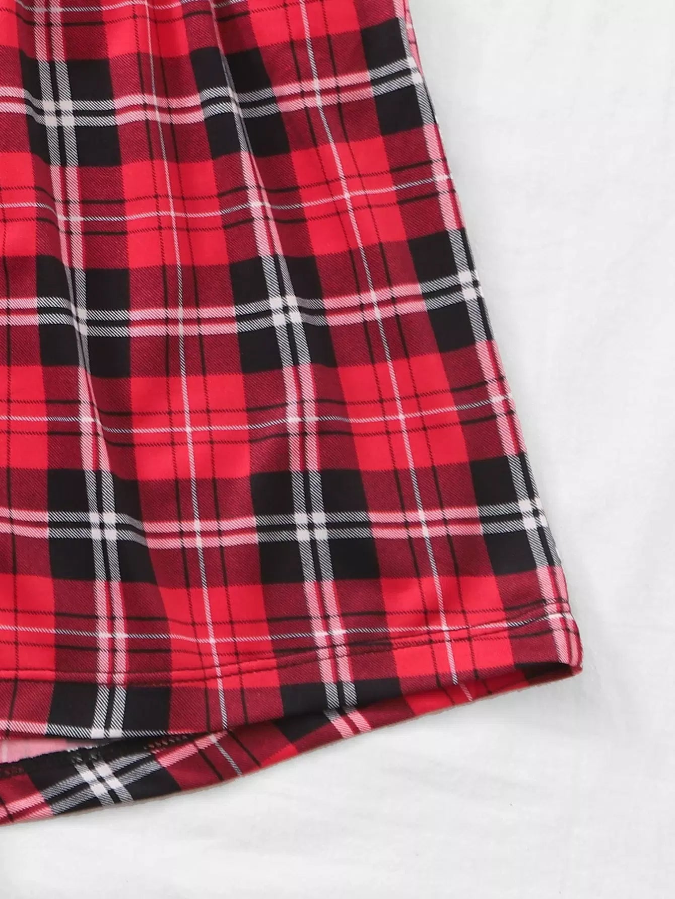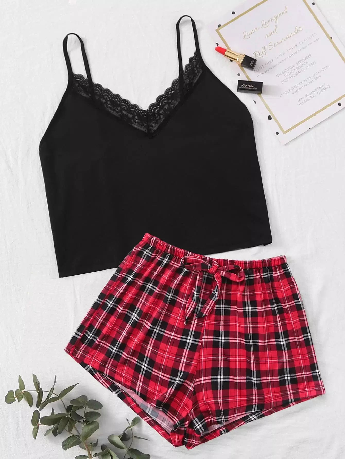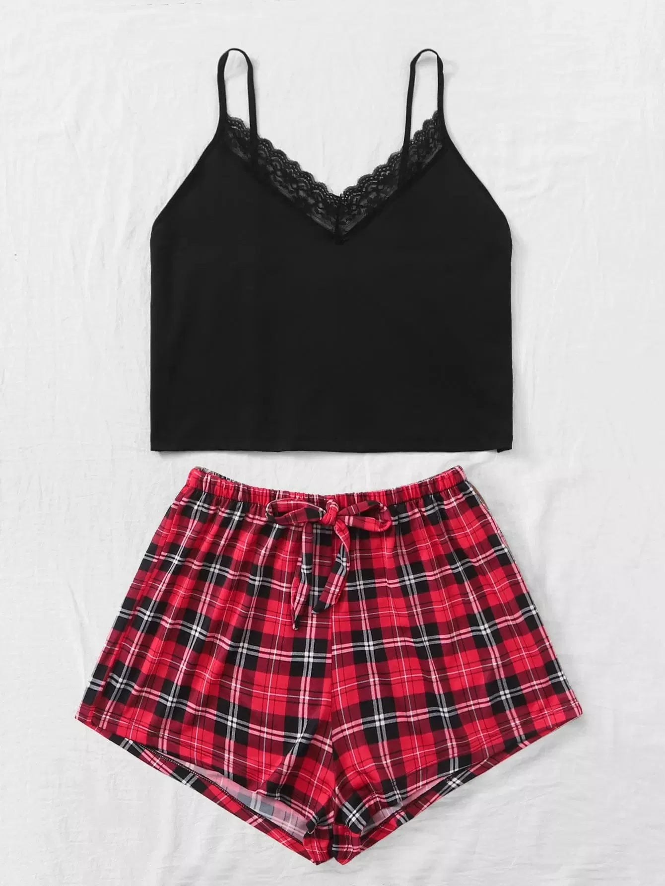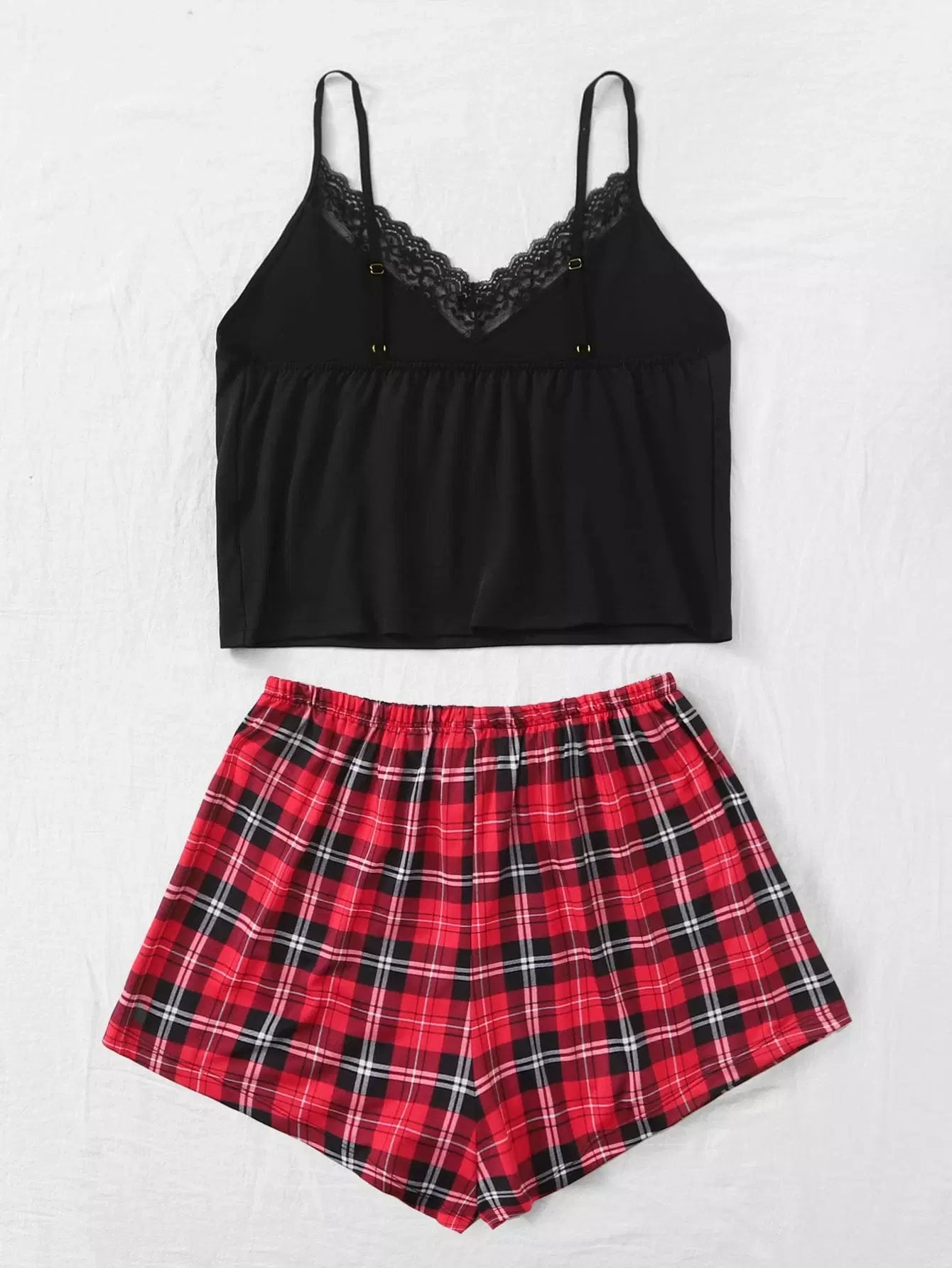 Contrast Lace Cami Top With Tartan Plaid Shorts PJ Set