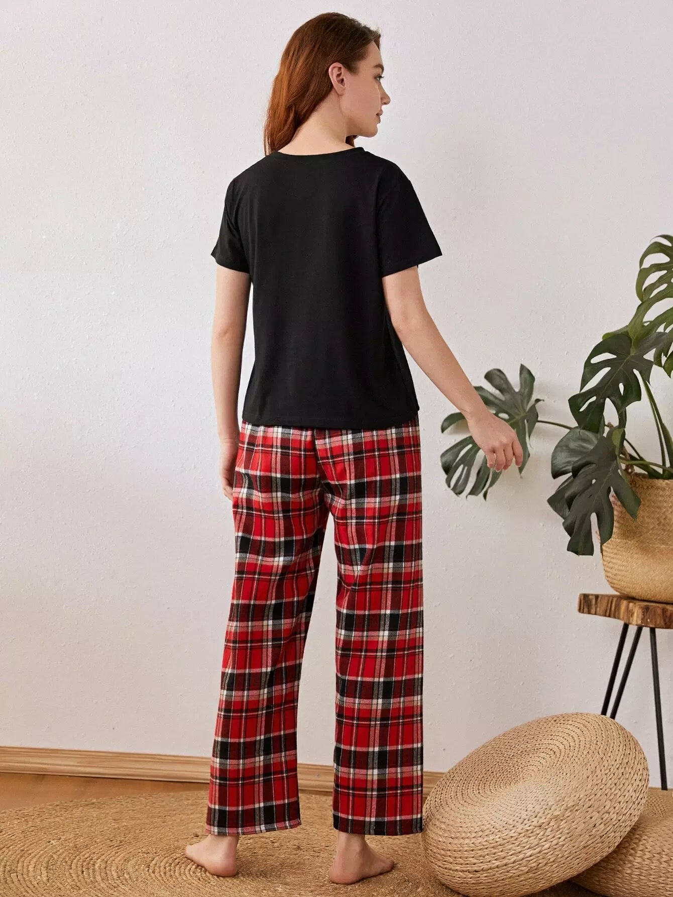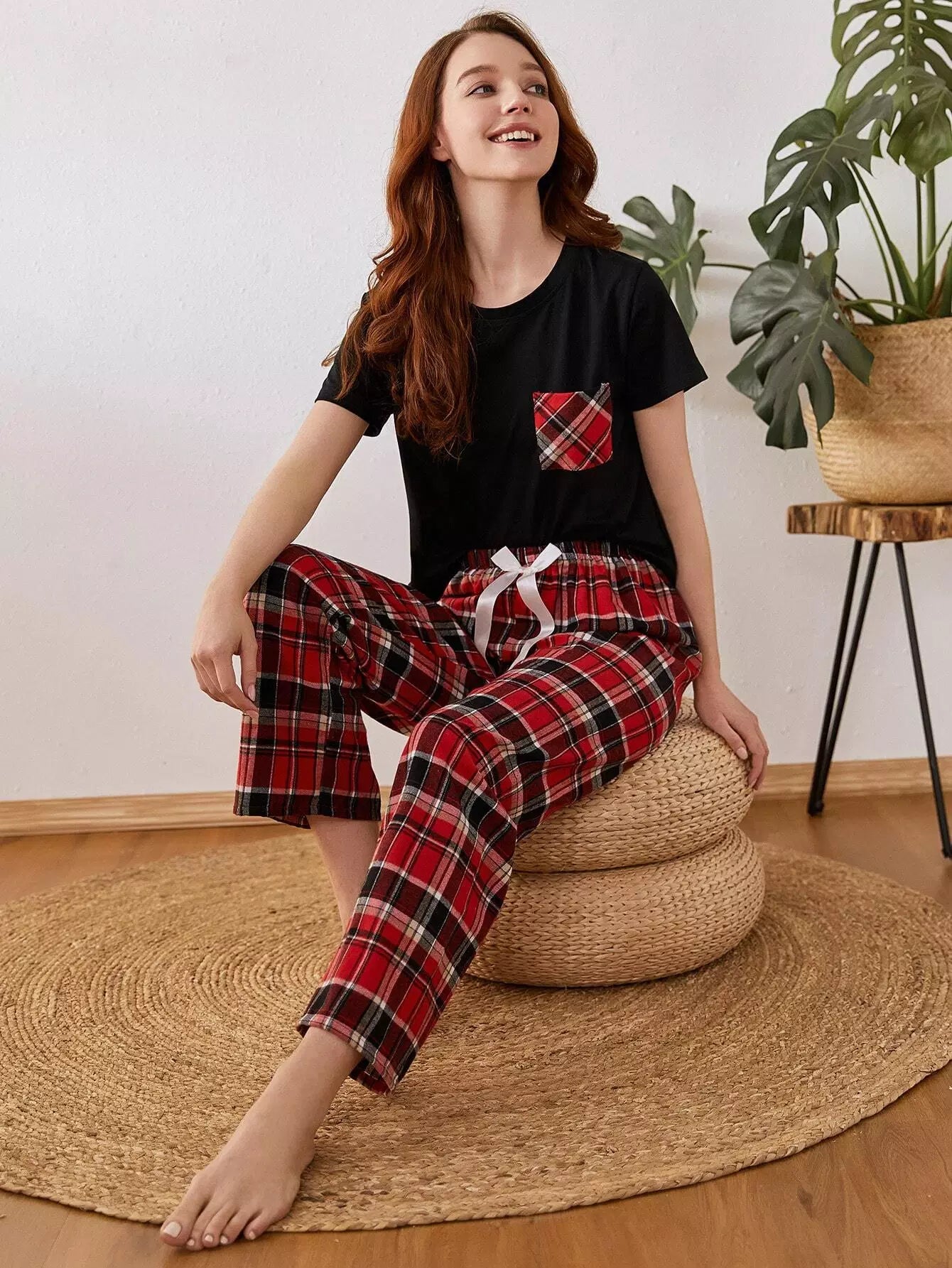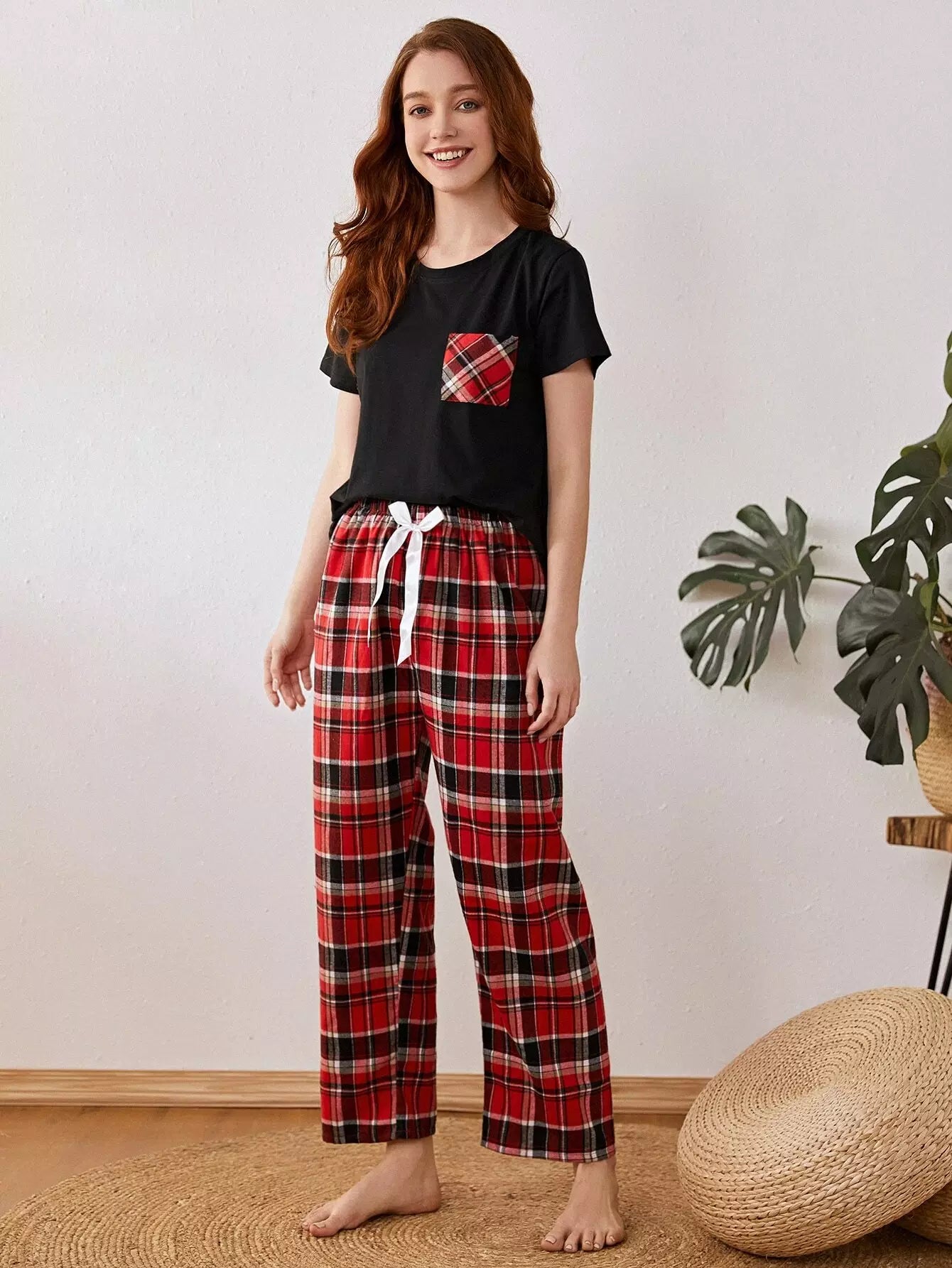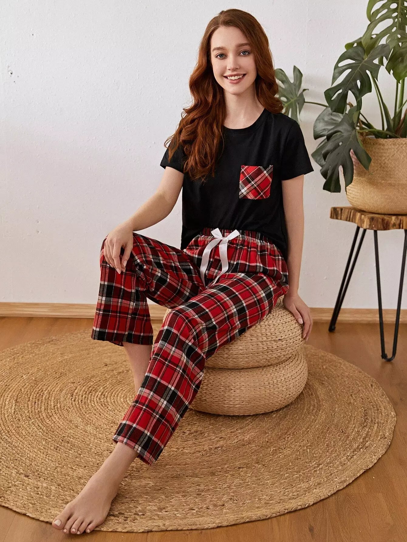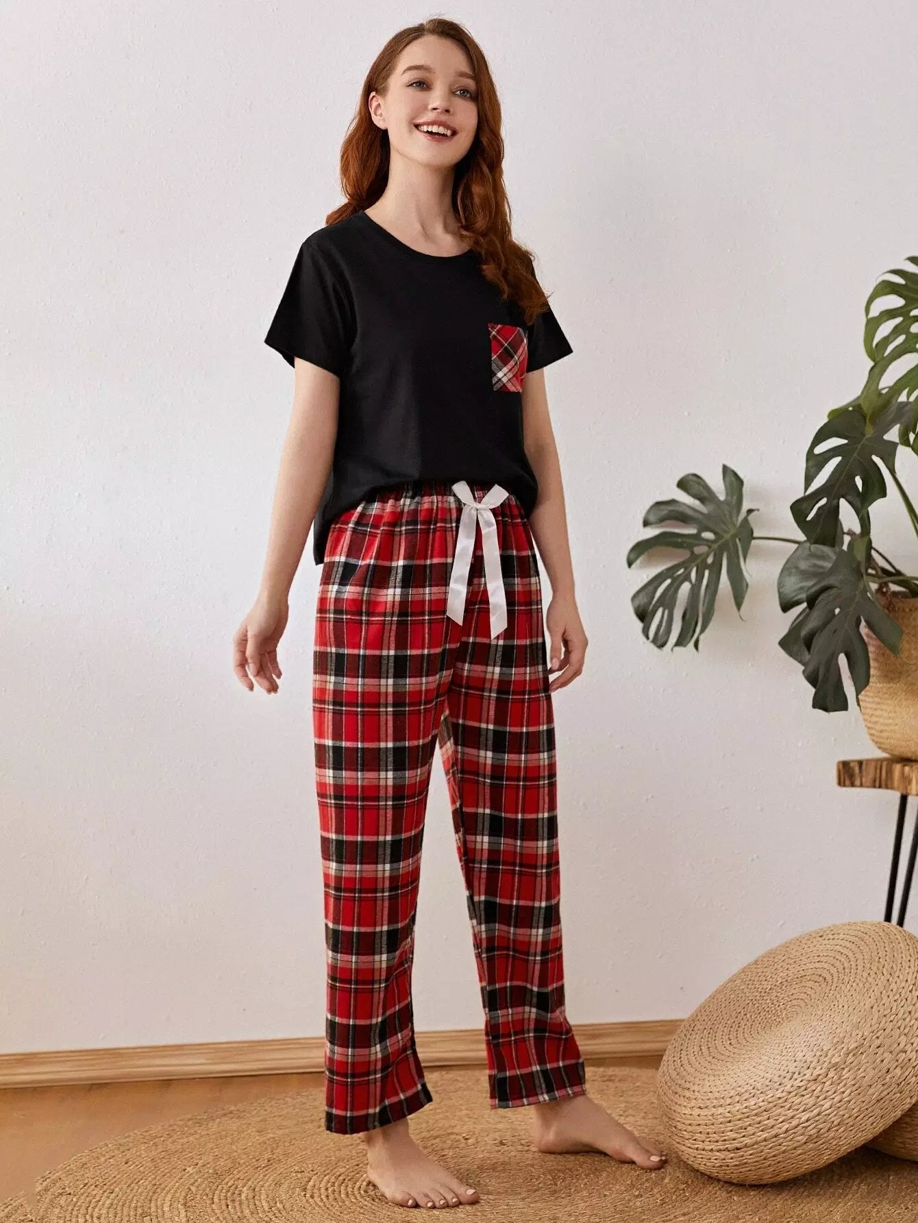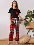 Contrast Pocket Tee & Plaid Pants Pajama Set