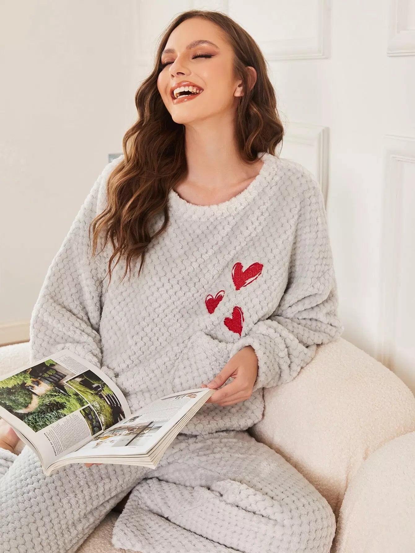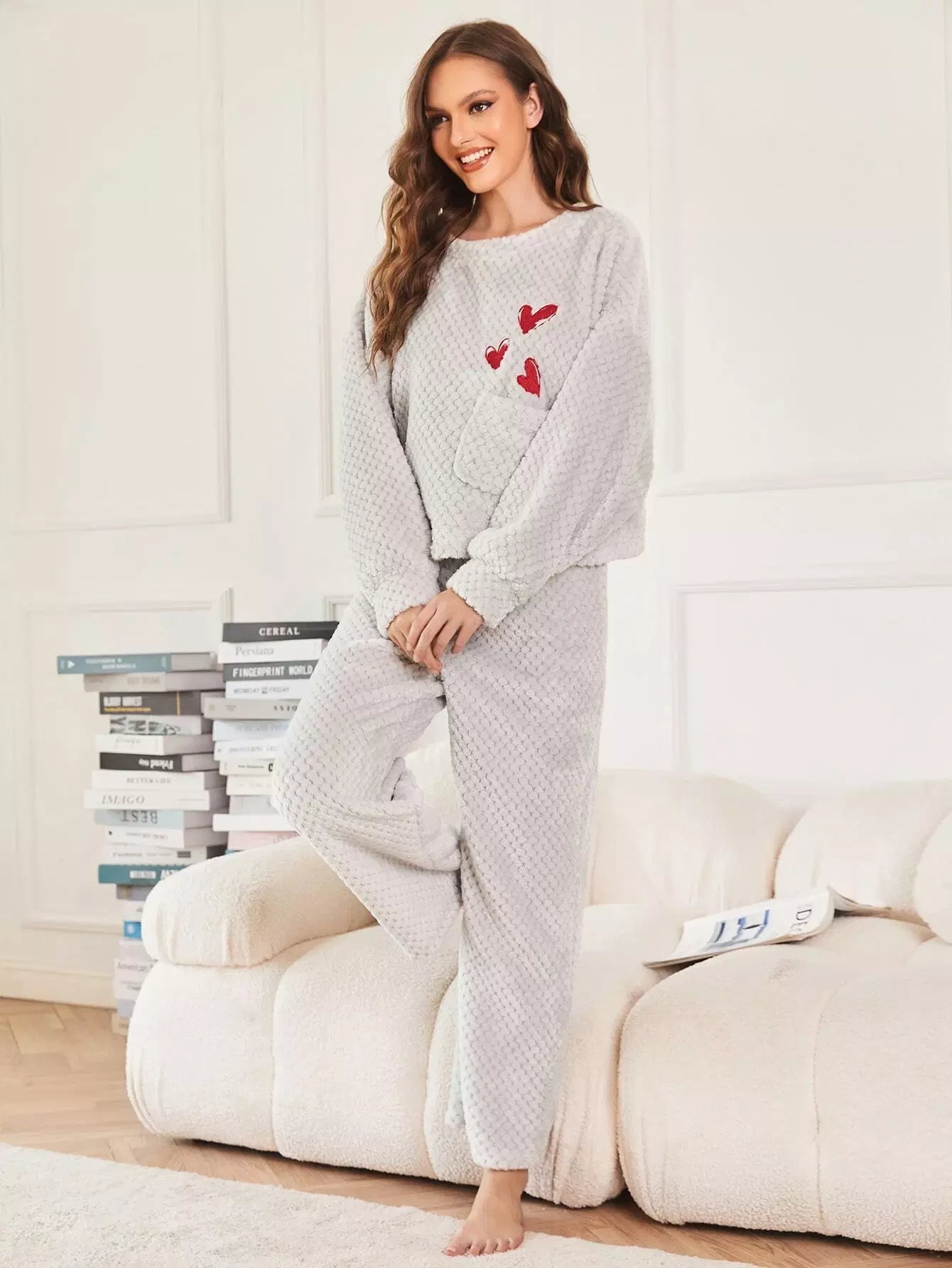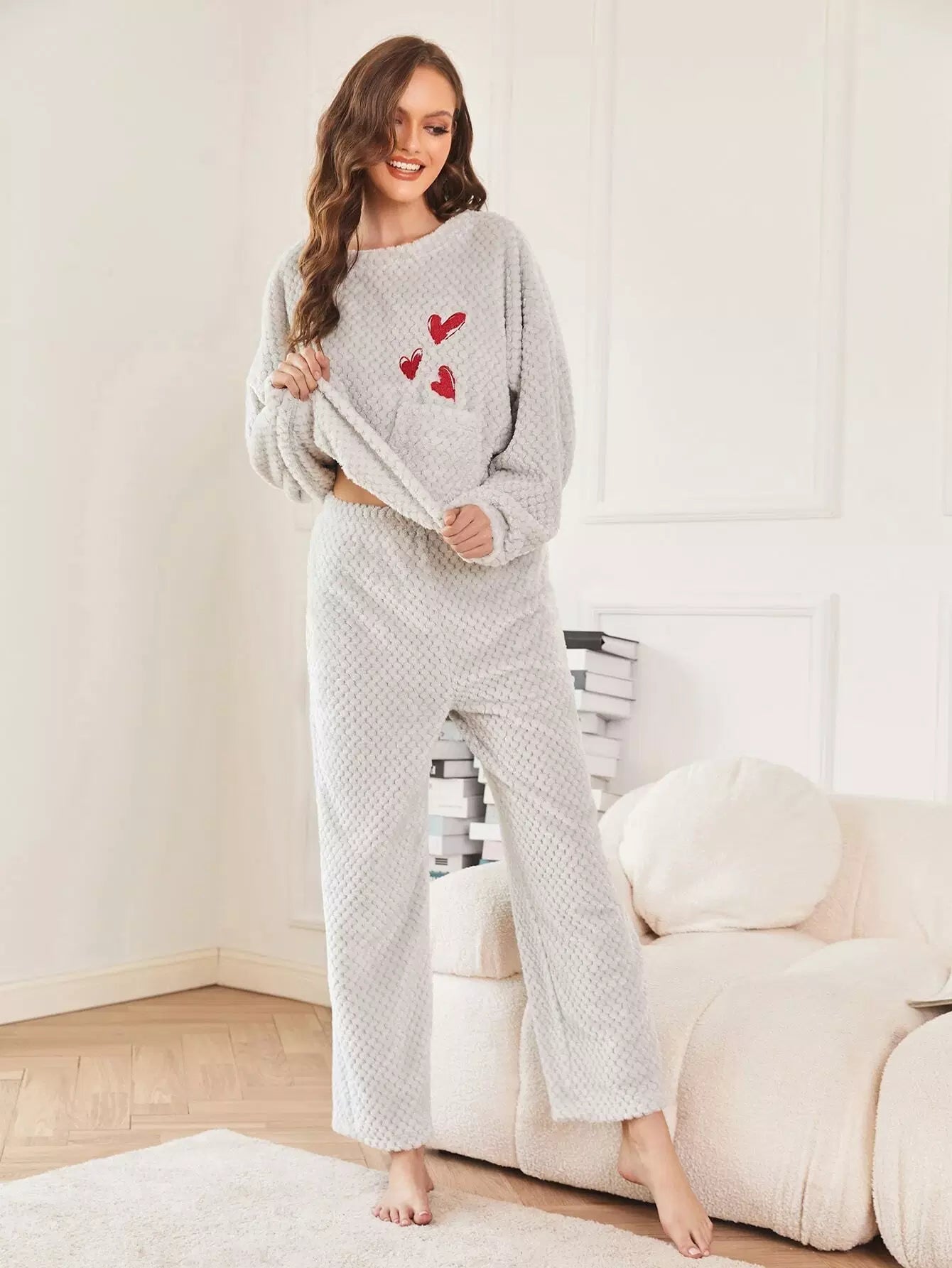 Heart Embroidered Pocket Front Drop Shoulder Flannel PJ Set