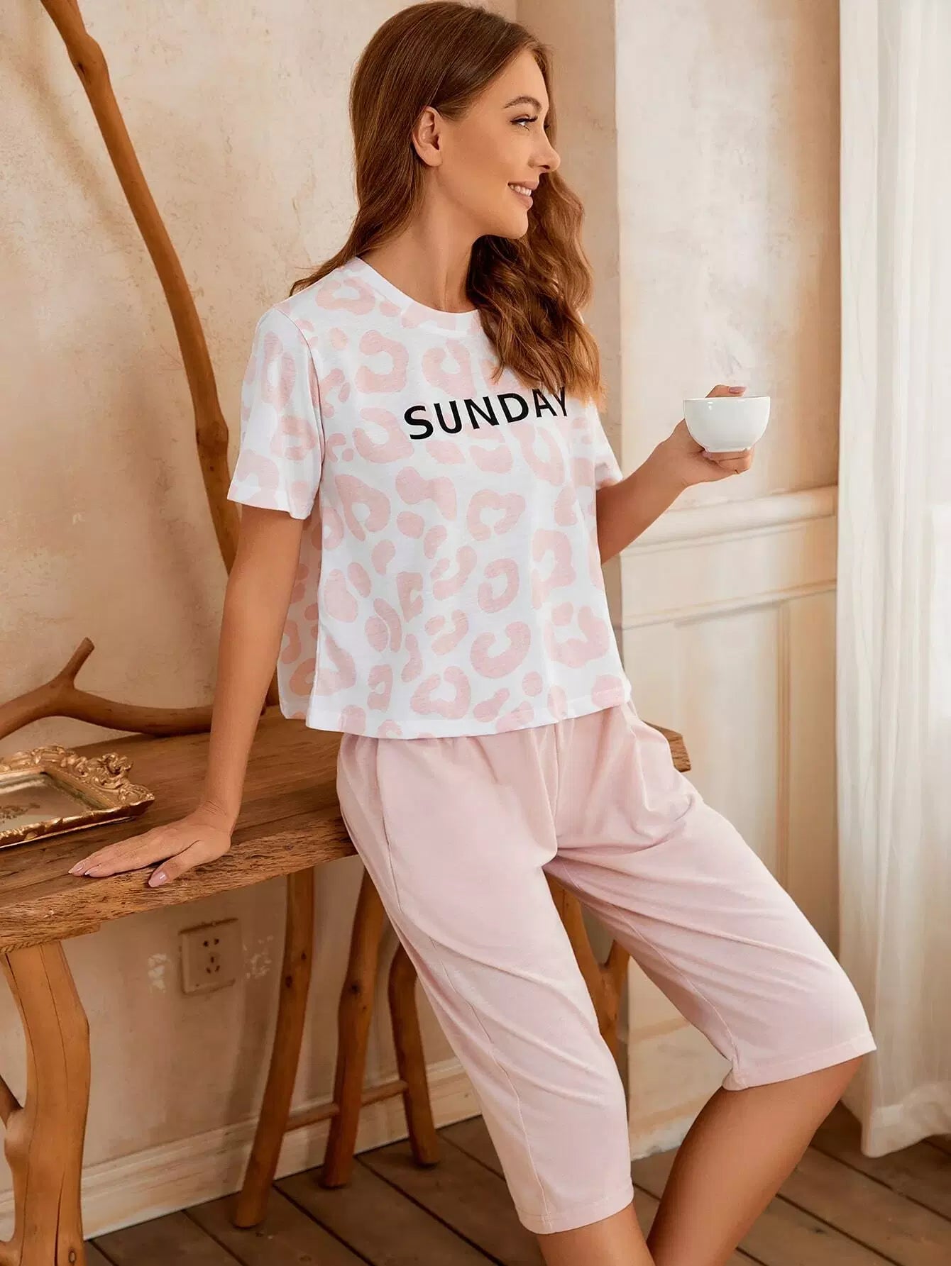 Leopard Letter Graphic Tee & Pants Pajama Set