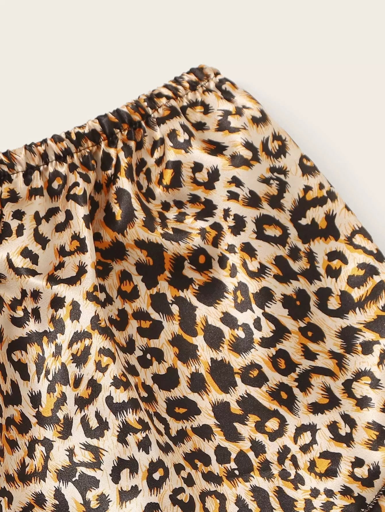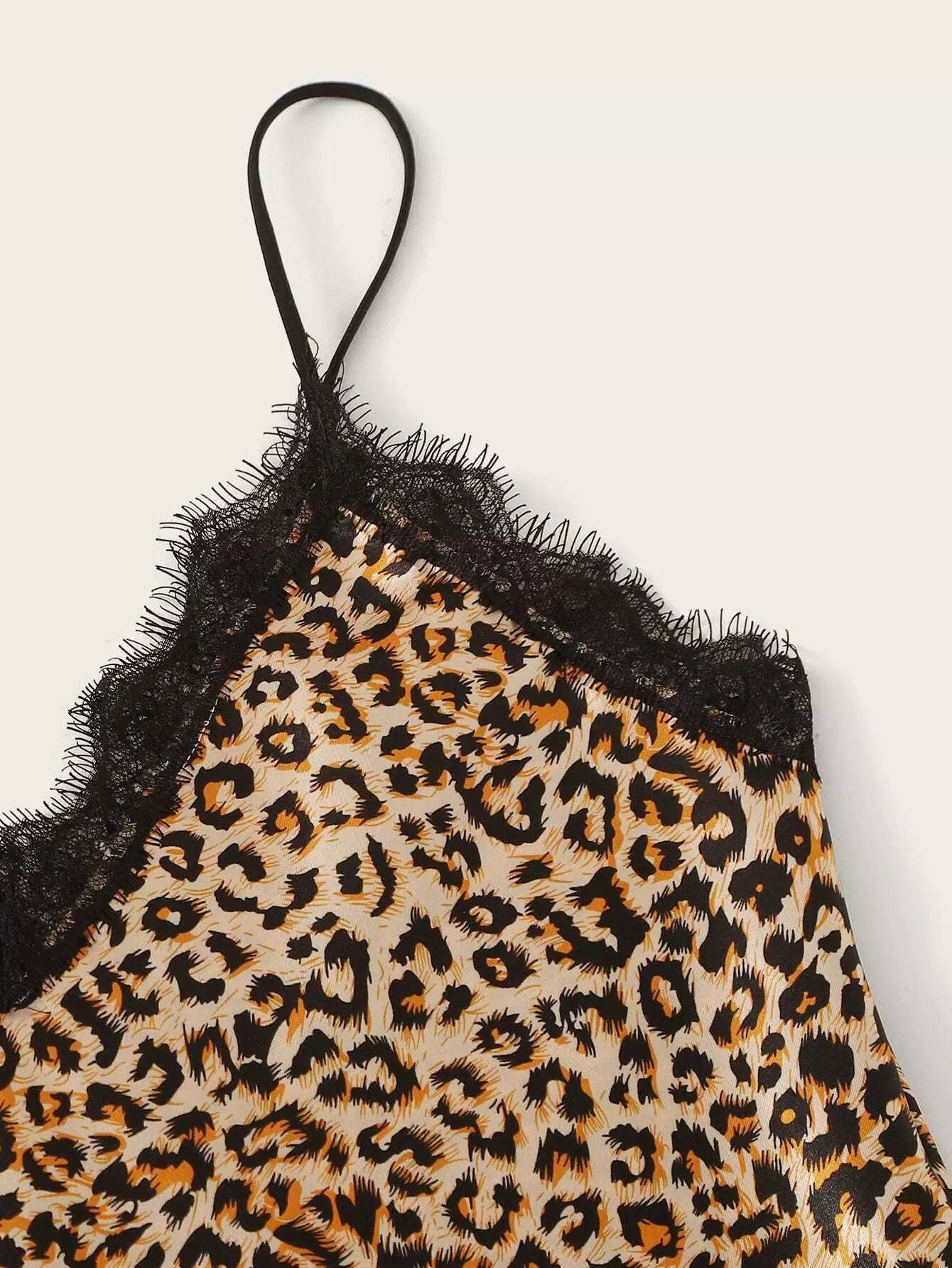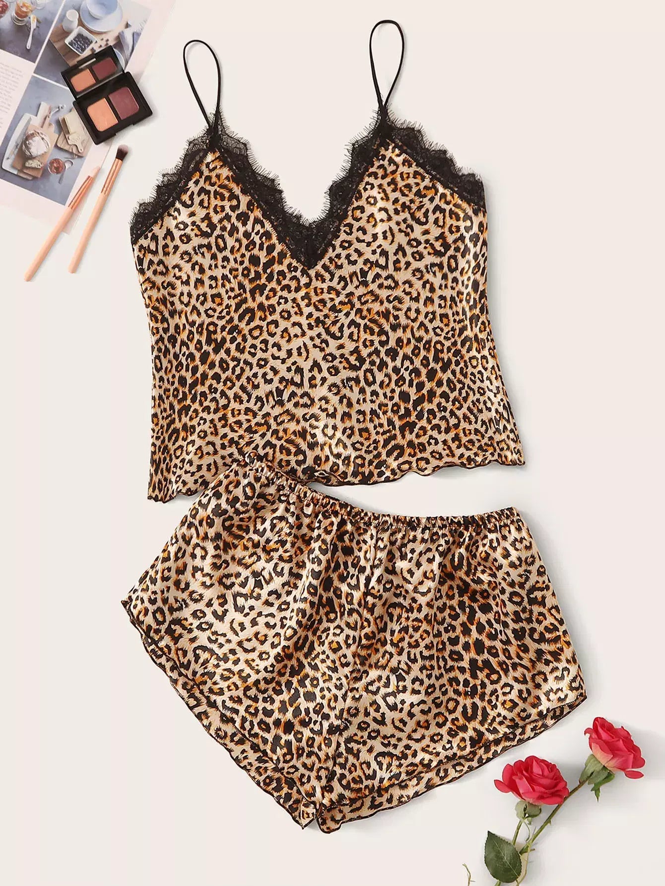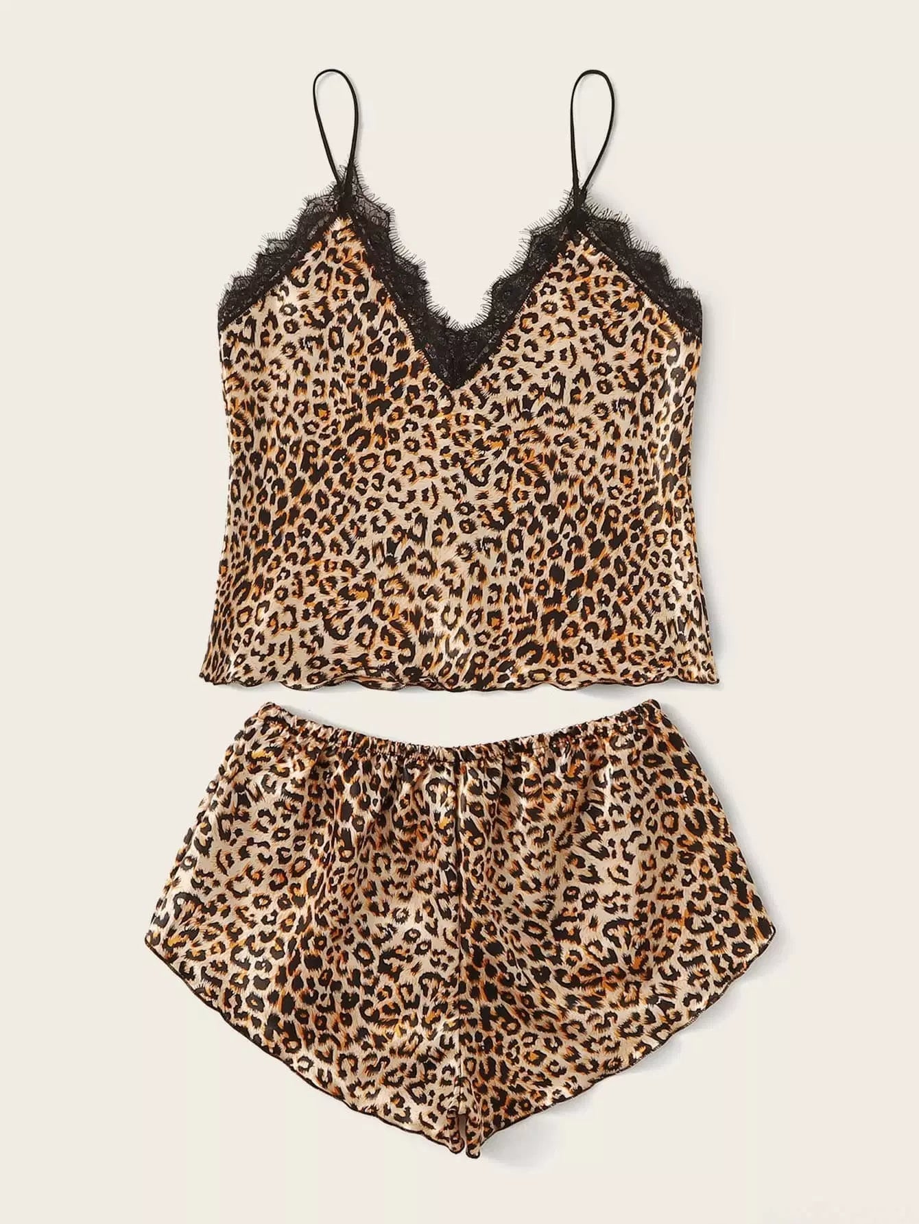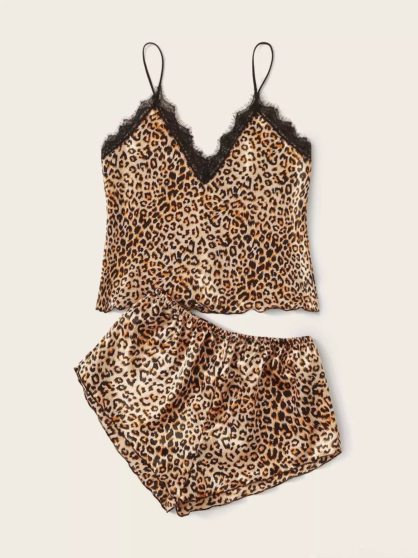 Leopard Print Lace Trim Satin Cami PJ Set