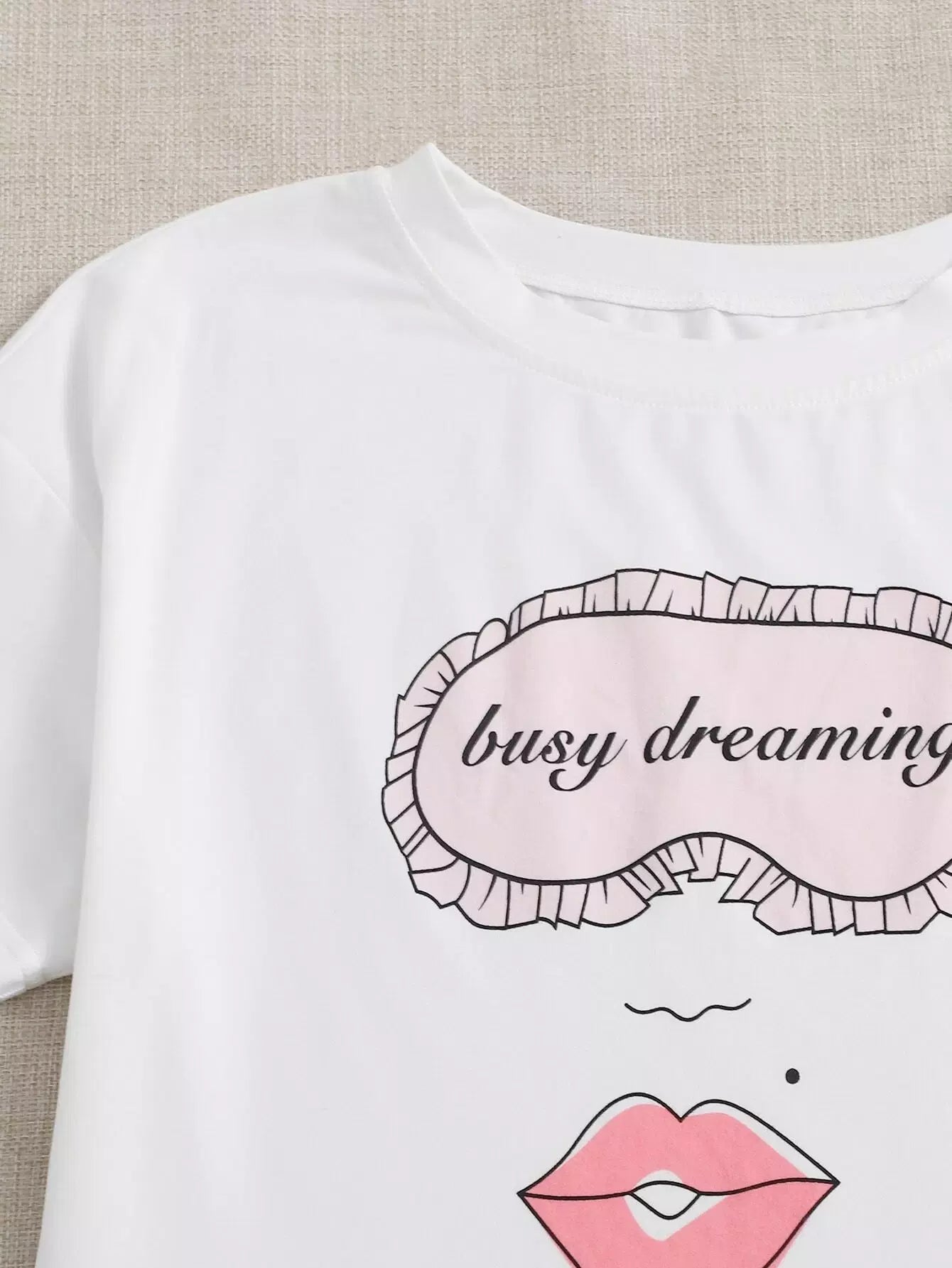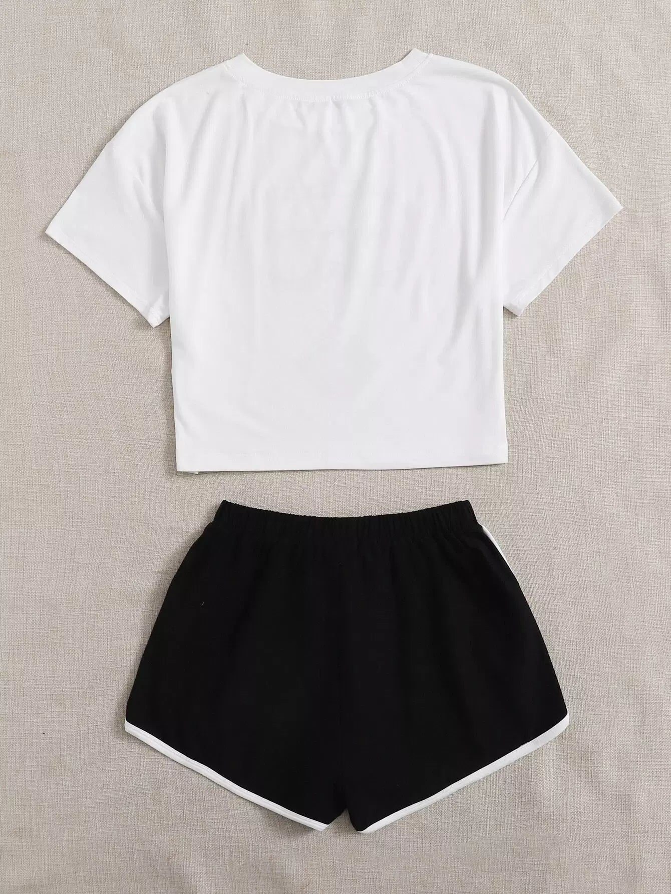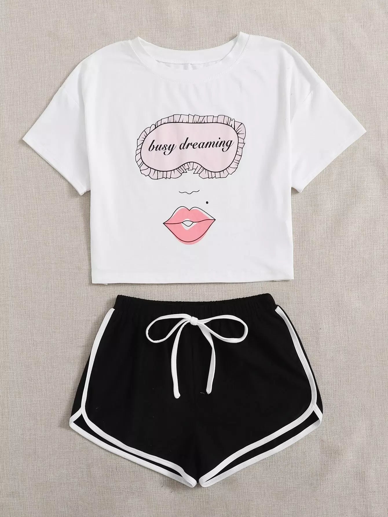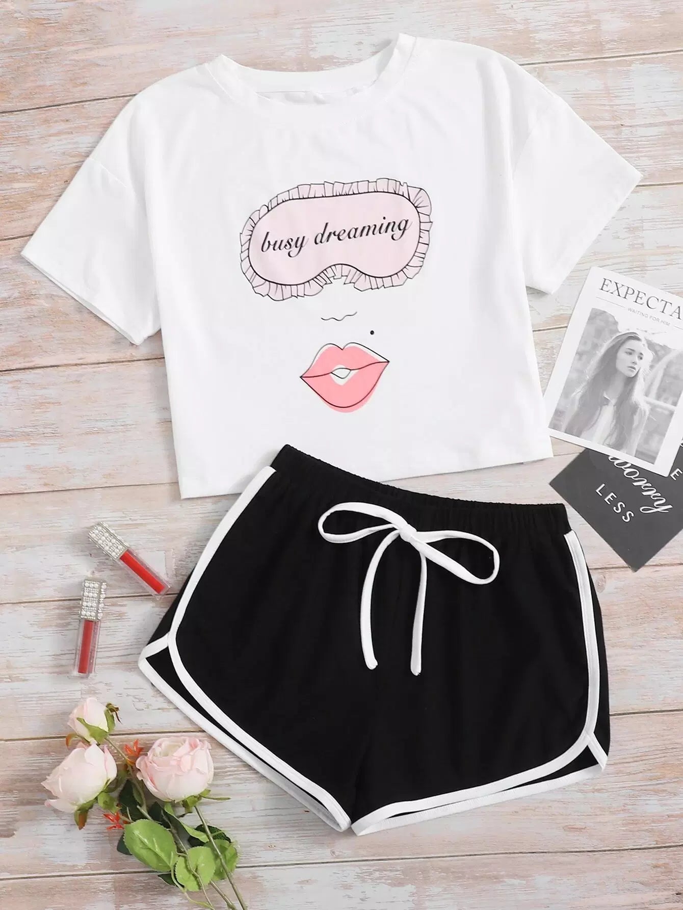 Letter Graphic Tee With Dolphin Shorts Pajama Set