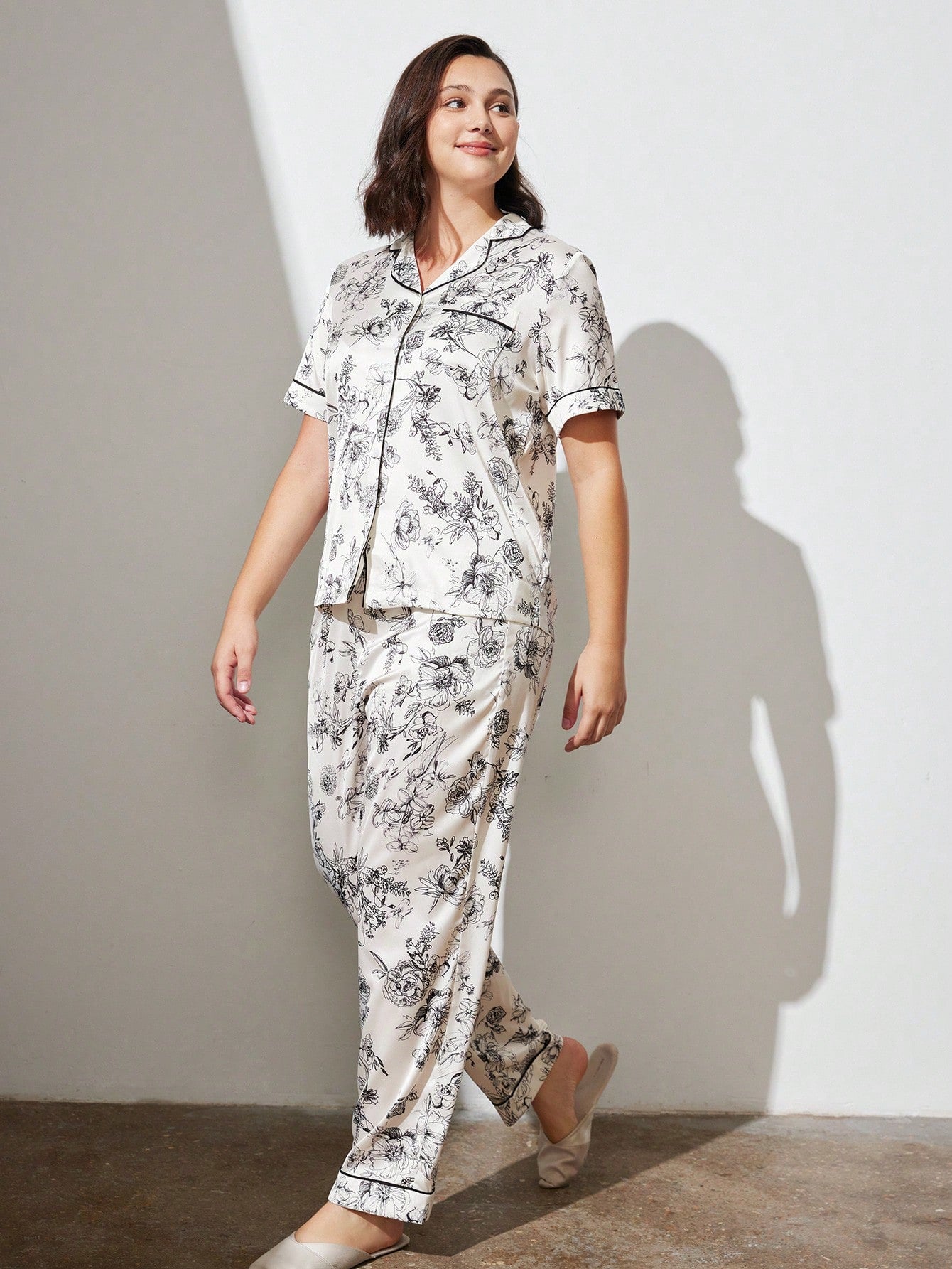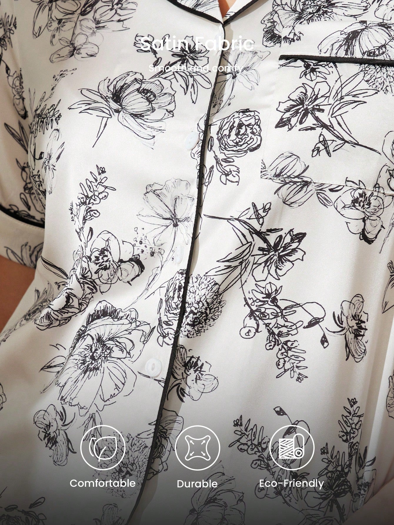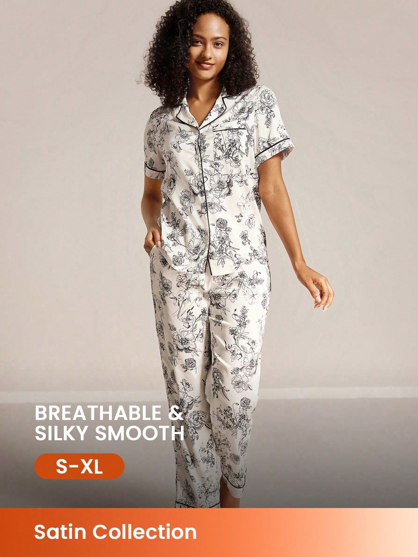 LUVLETTE Satin Floral Short-Sleeve Button-Up & Pants Women Pajama Set Lounge Sets Lingerie