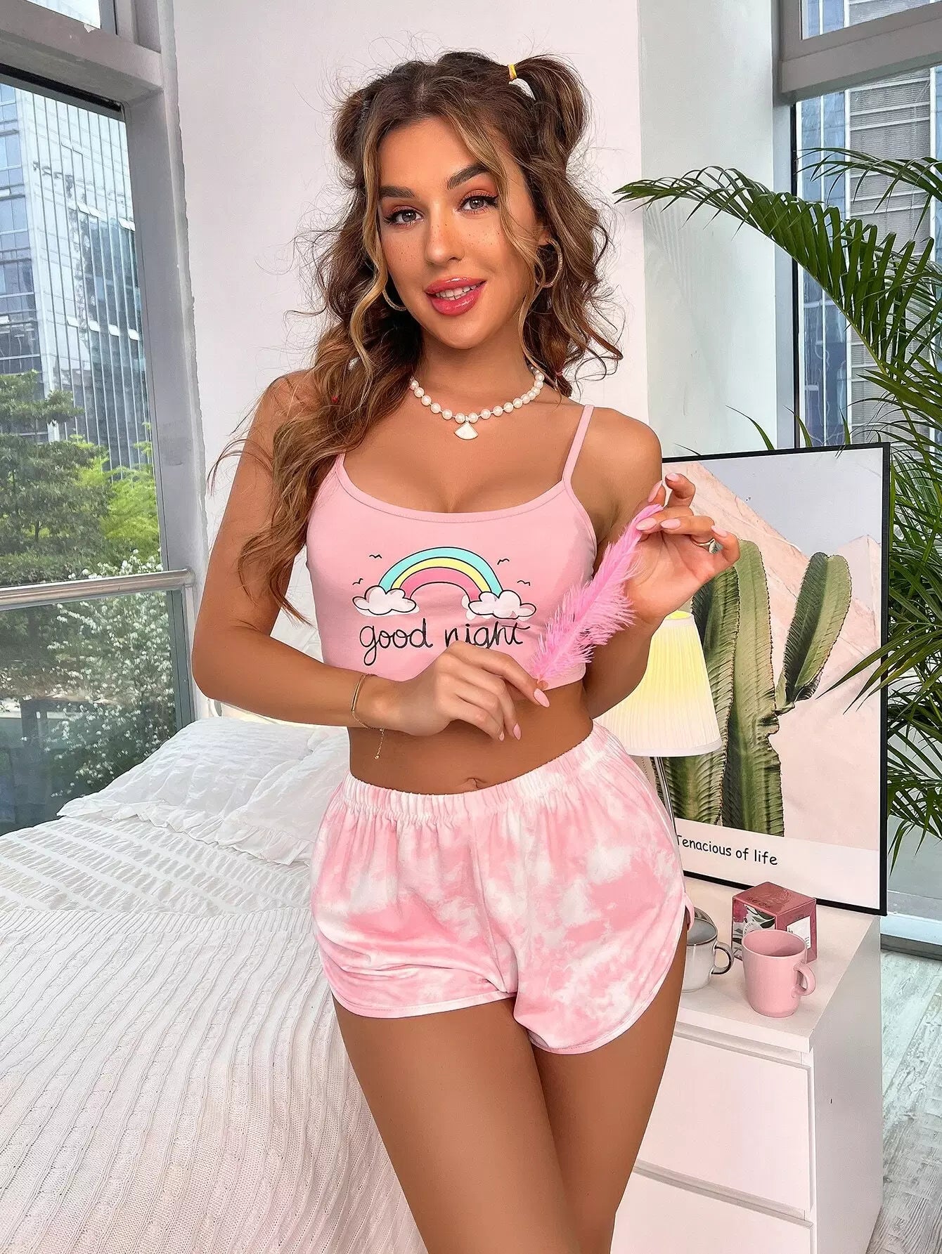 Rainbow & Slogan Graphic Crop Cami Top & Tie Dye Shorts PJ Set