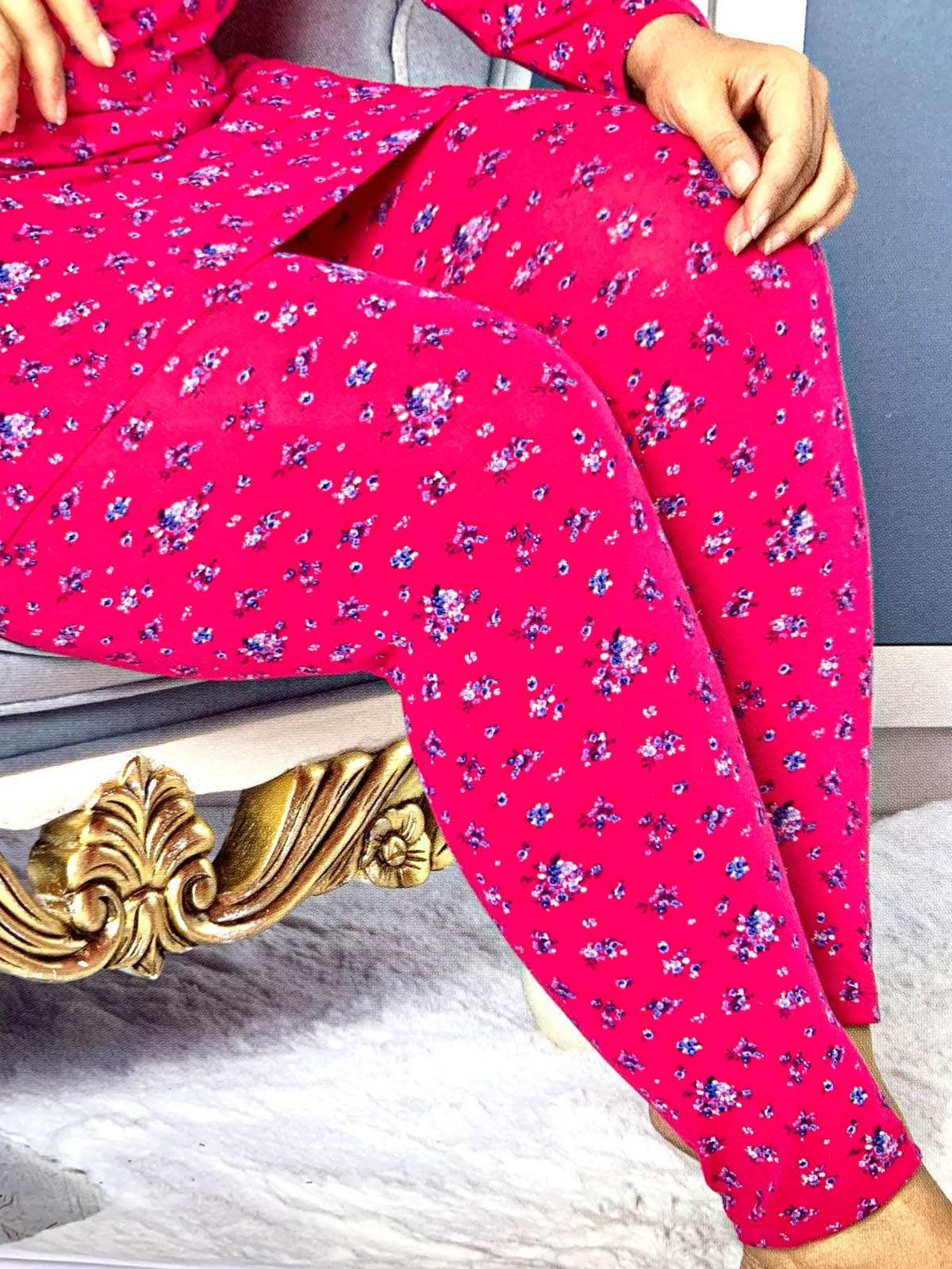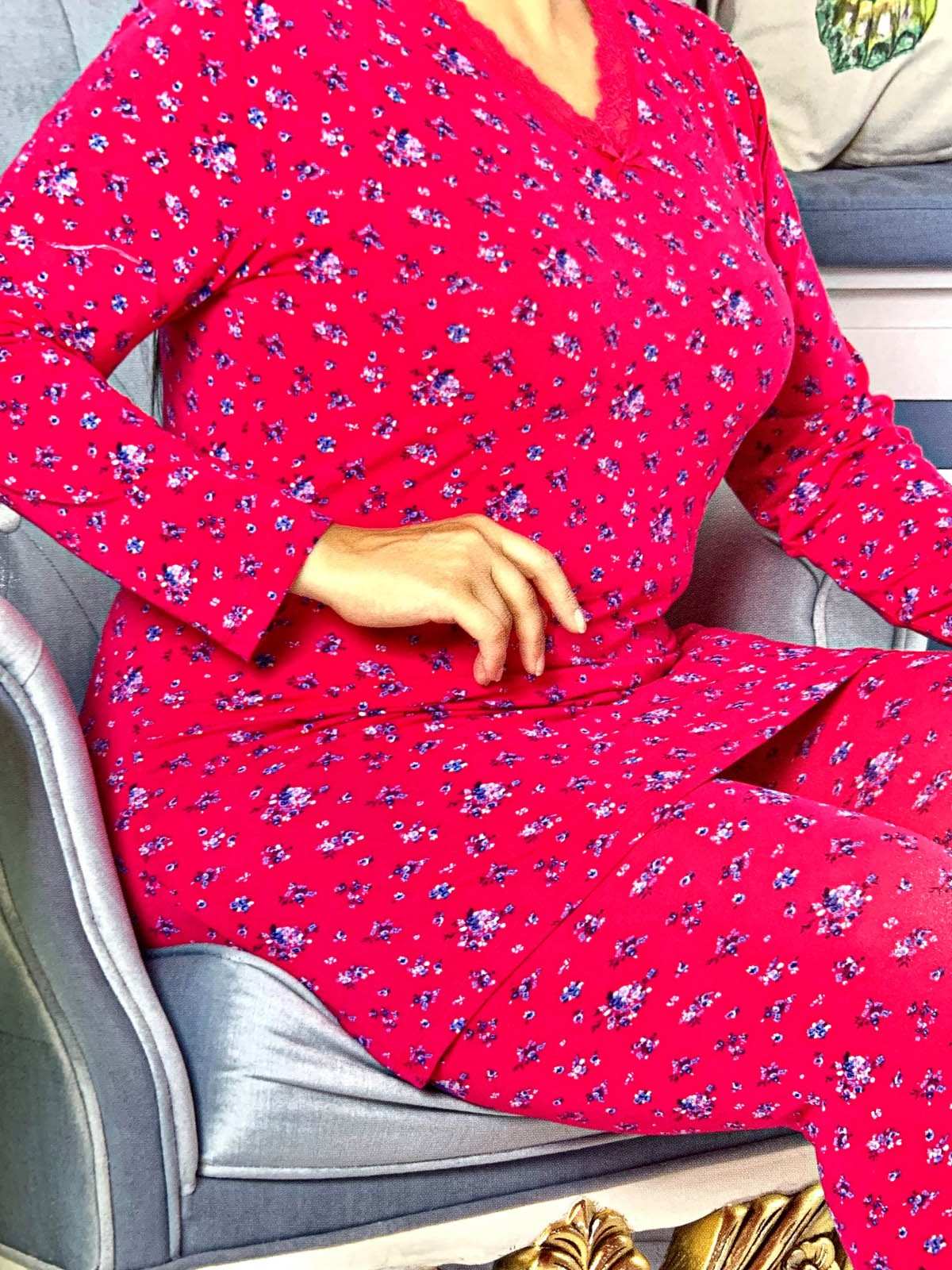 Red pajamas with white and blue floral print