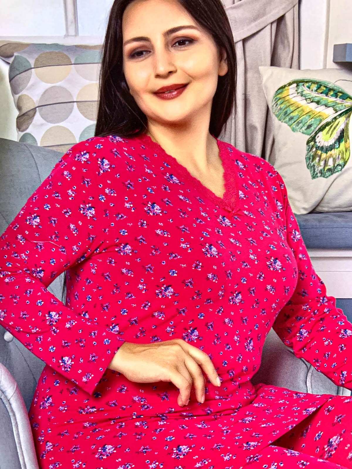 Women - Red pajamas with white and blue floral print