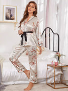 Satin Contrast Binding Floral Print Night Set Without Belt