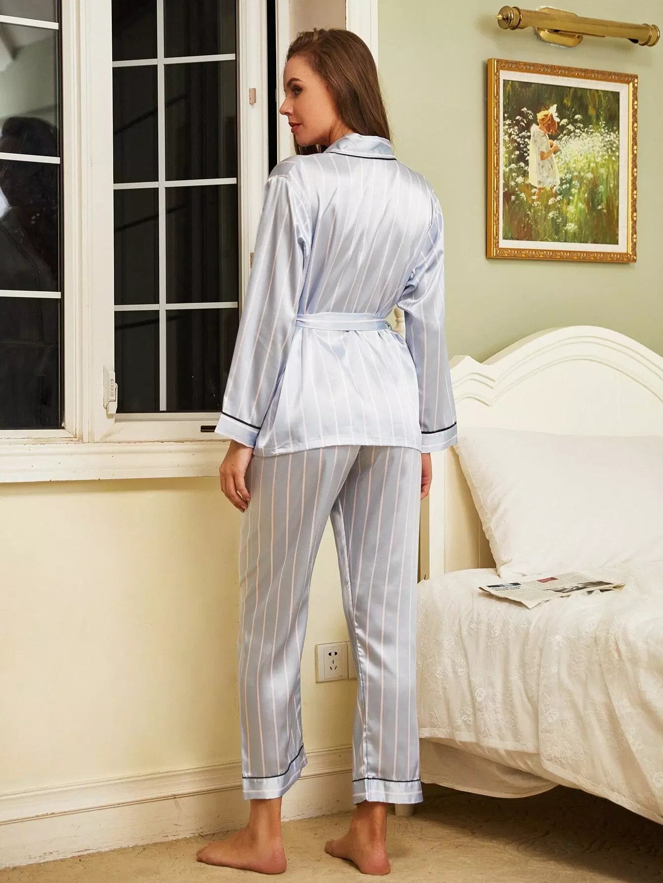 Shawl Collar Striped Satin Night Set Without Belt