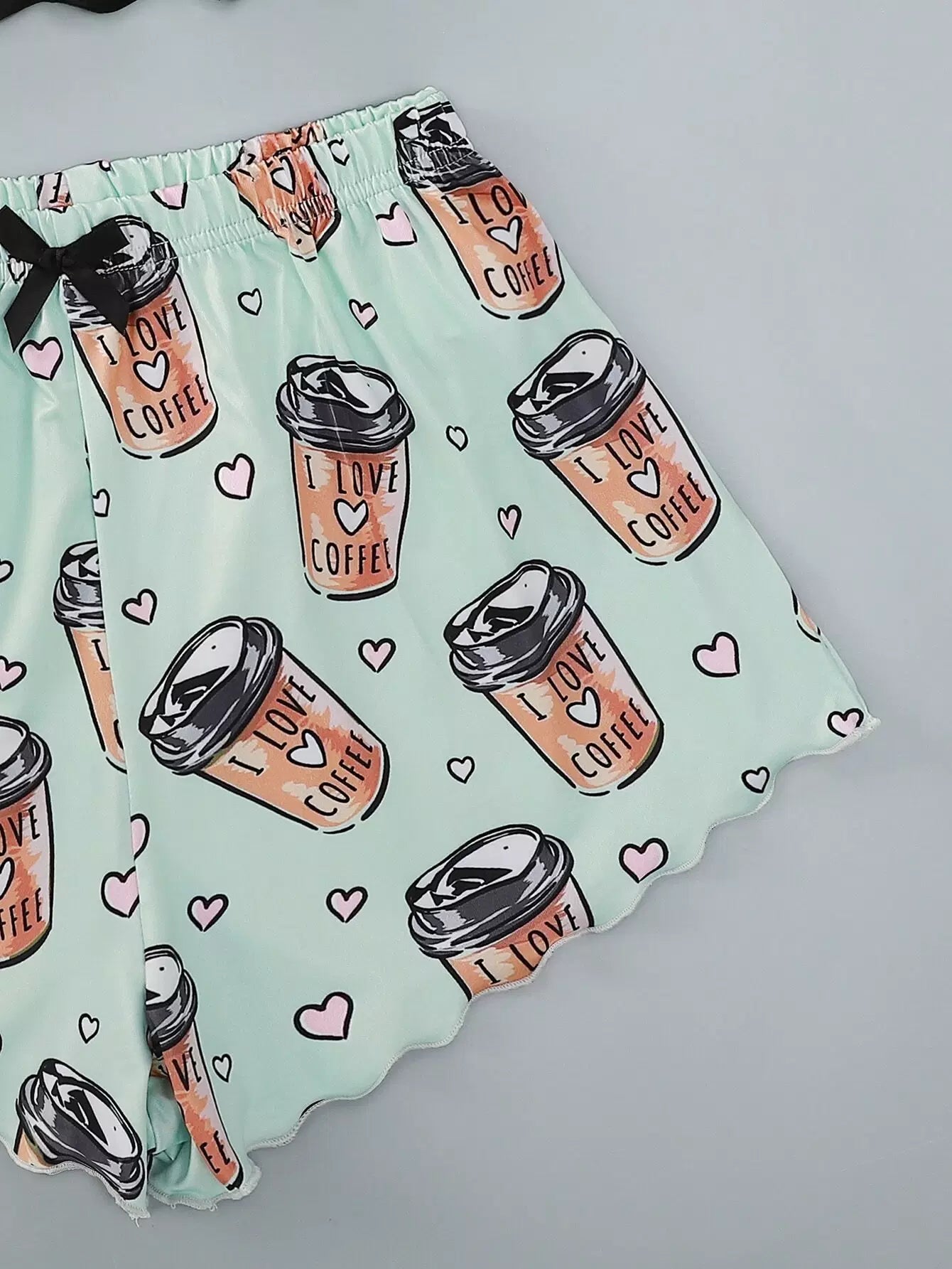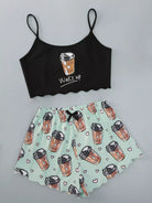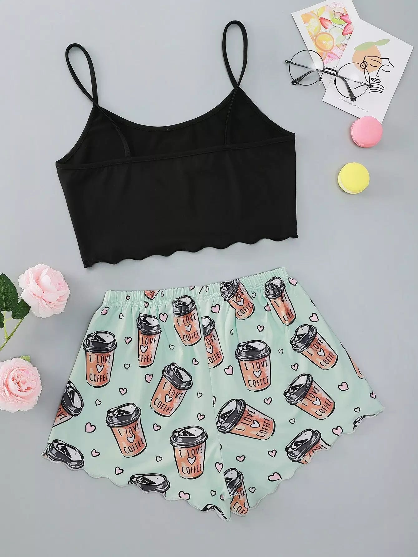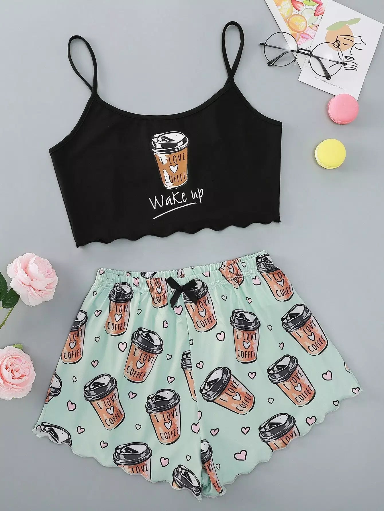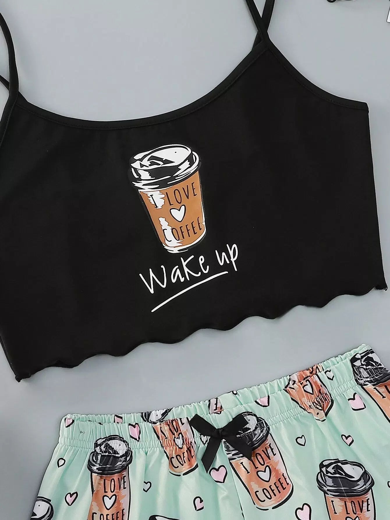 Slogan And Heart Print Scallop Trim Cami Pajama Set