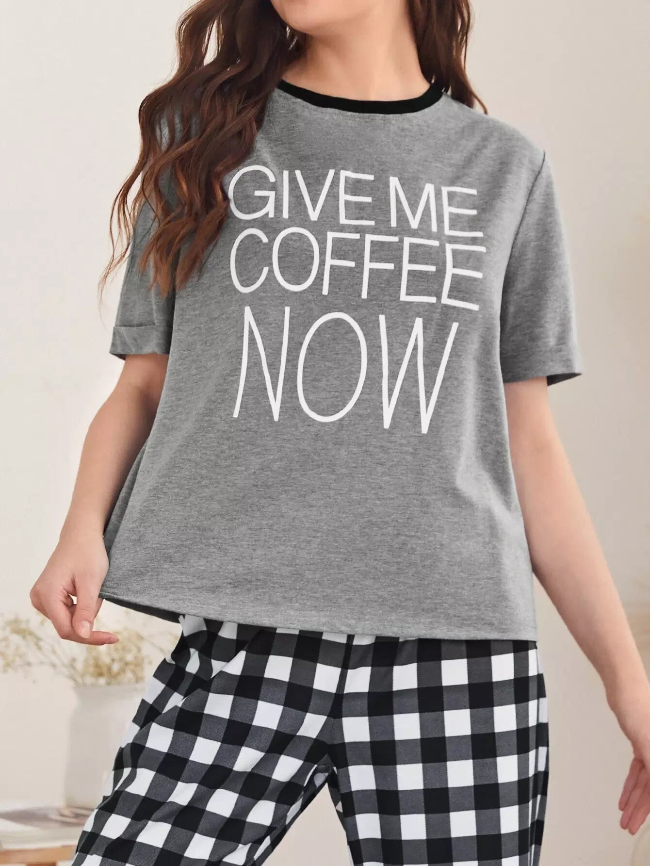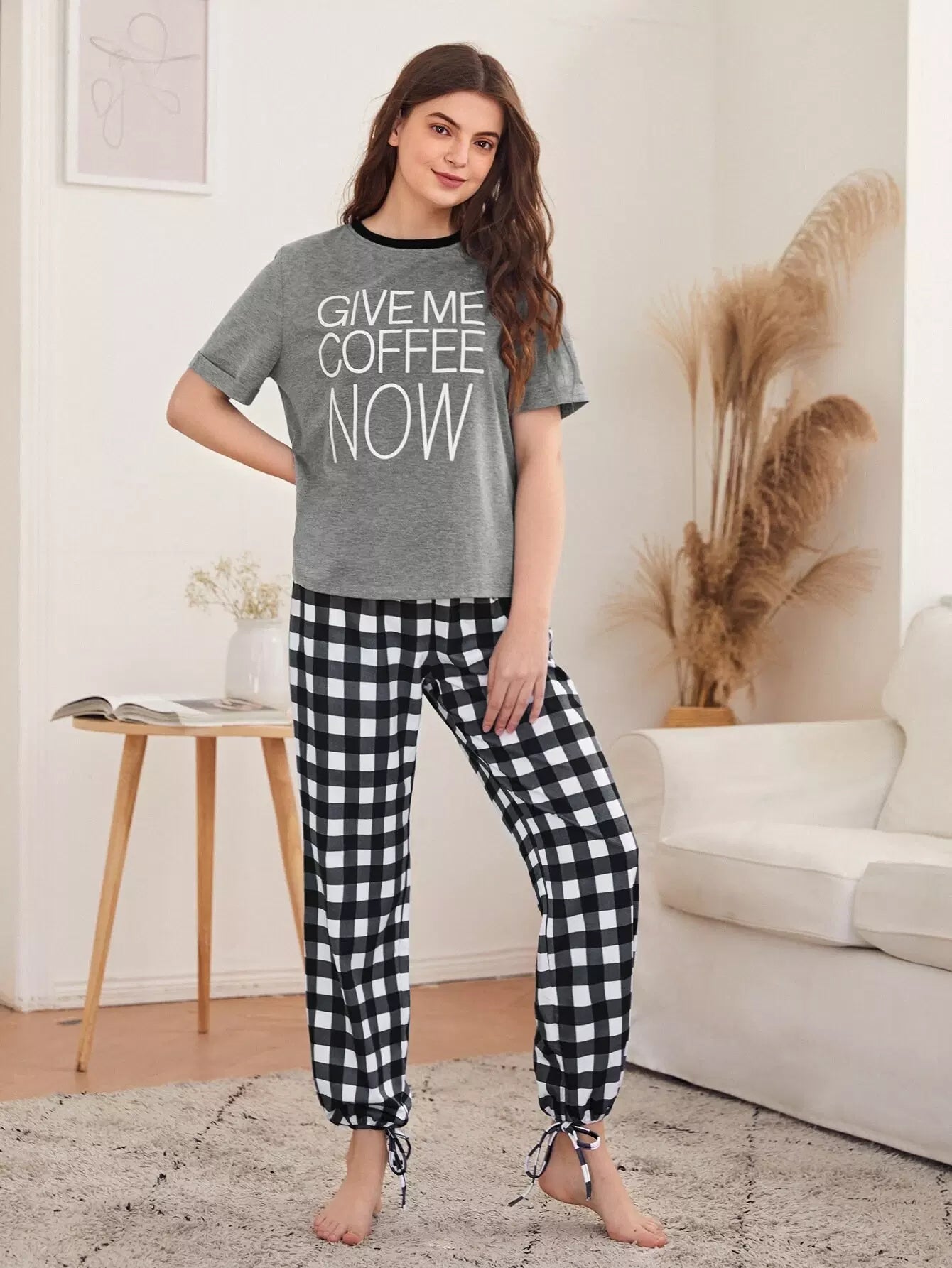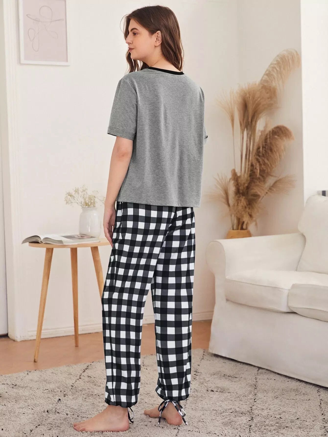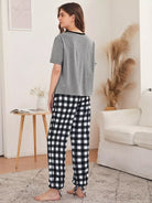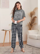 Slogan Graphic Tee & Knot Hem Gingham Pants PJ Set