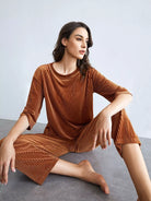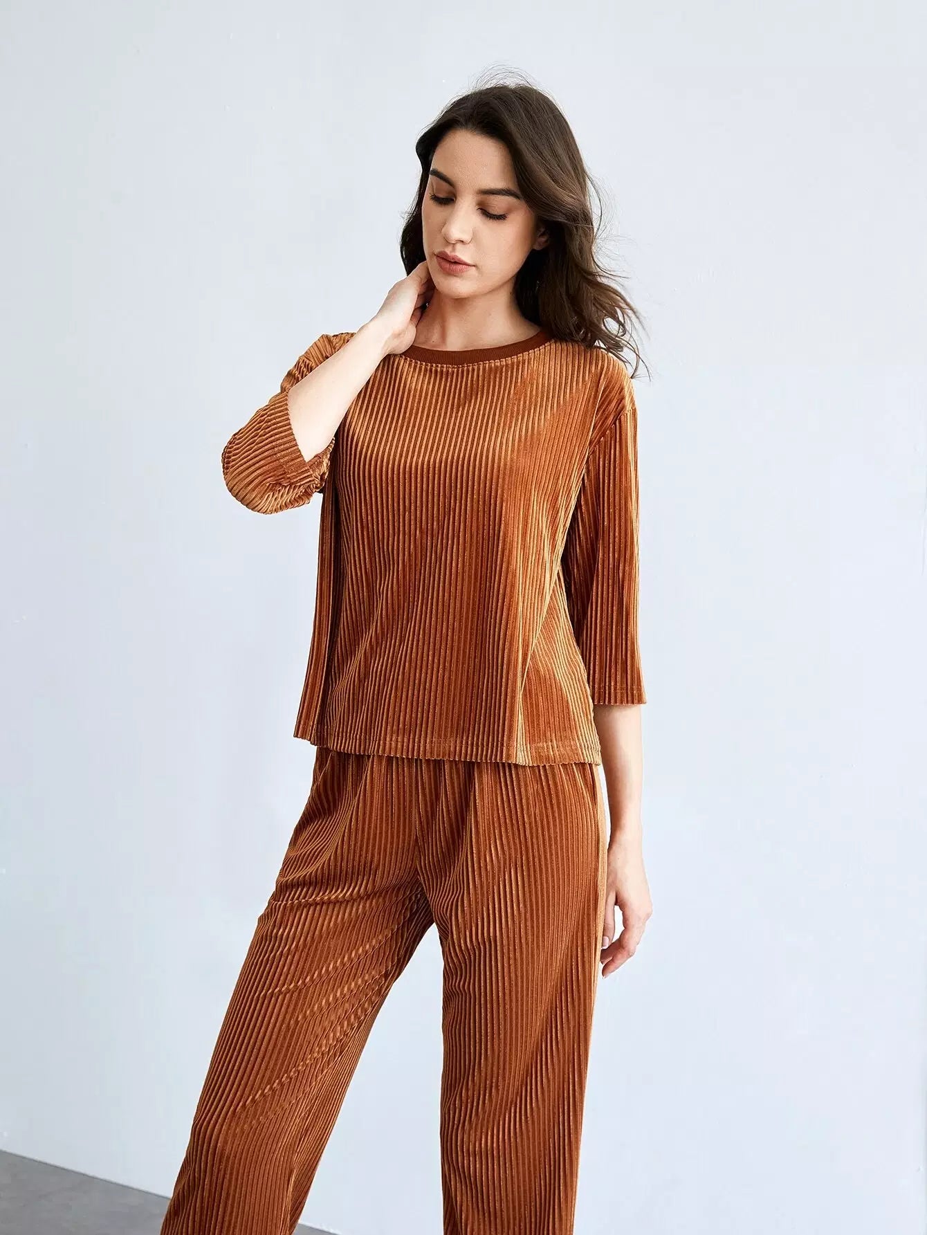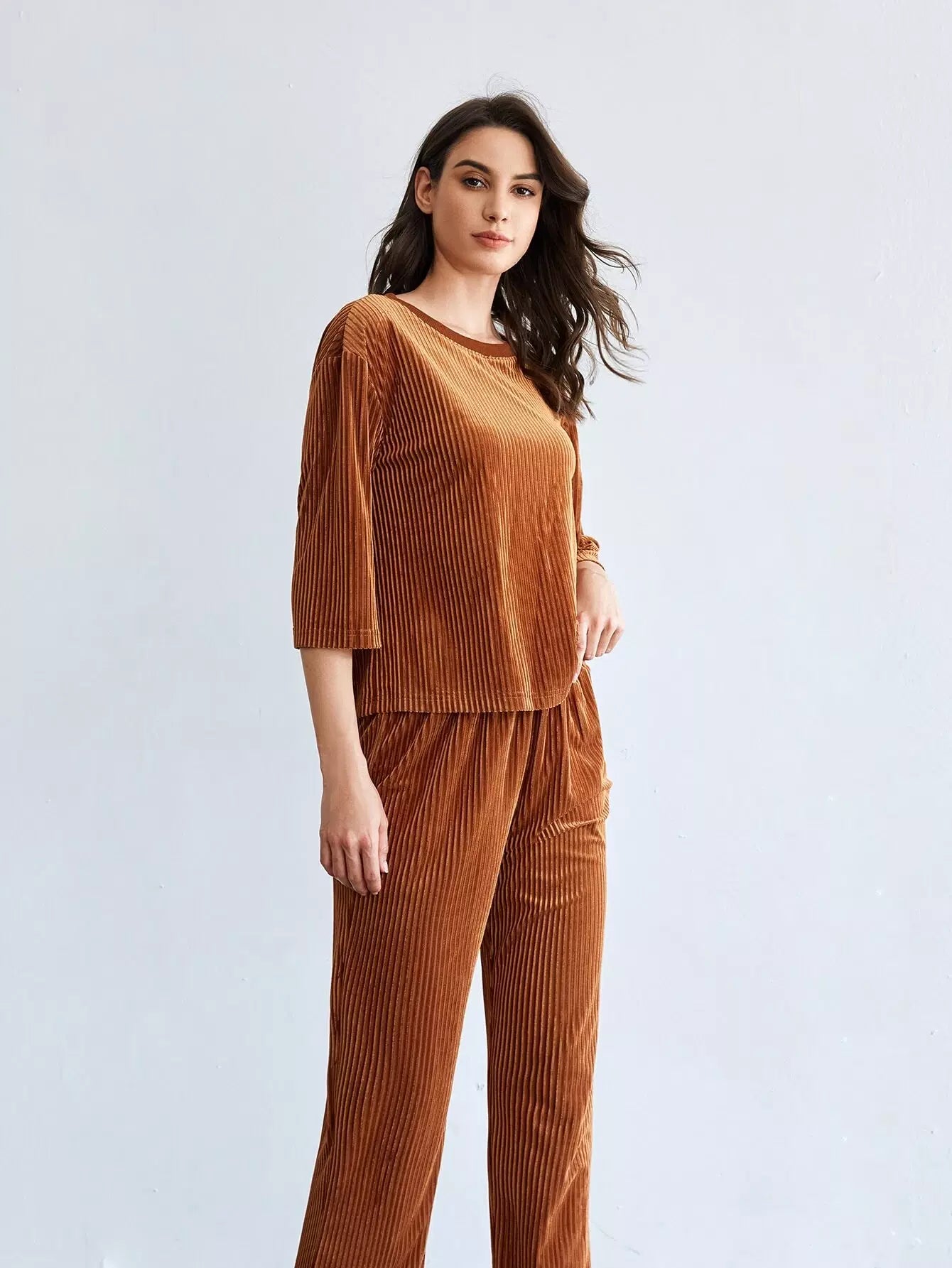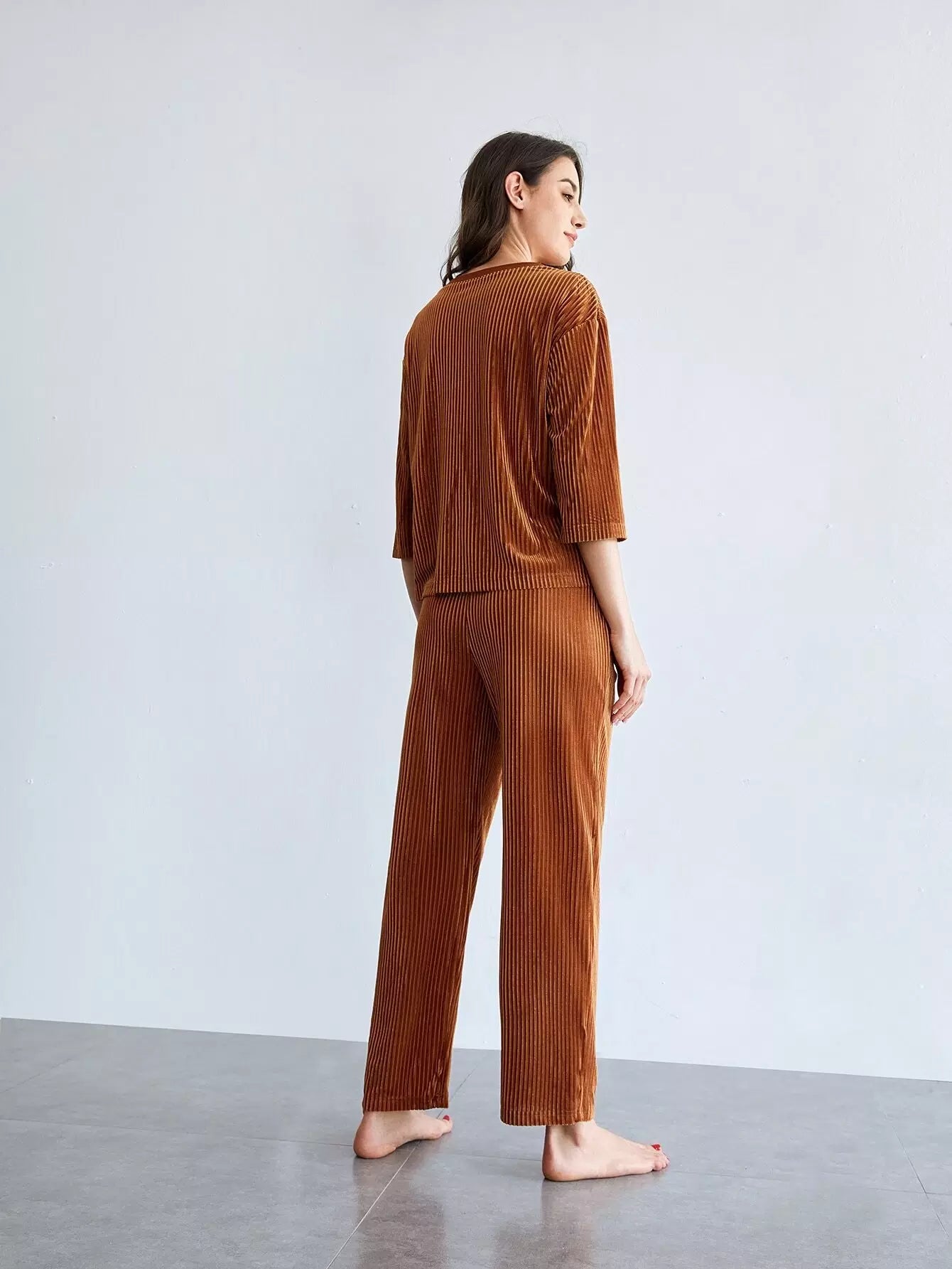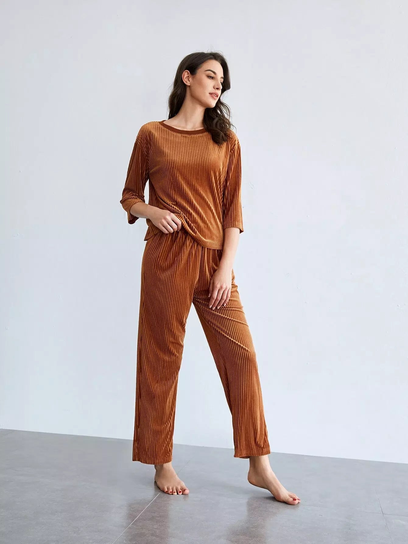 Solid Round Neck Drop Shoulder Tee & Pants Pajama Set