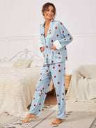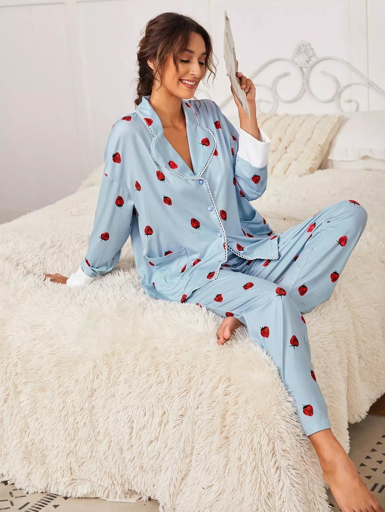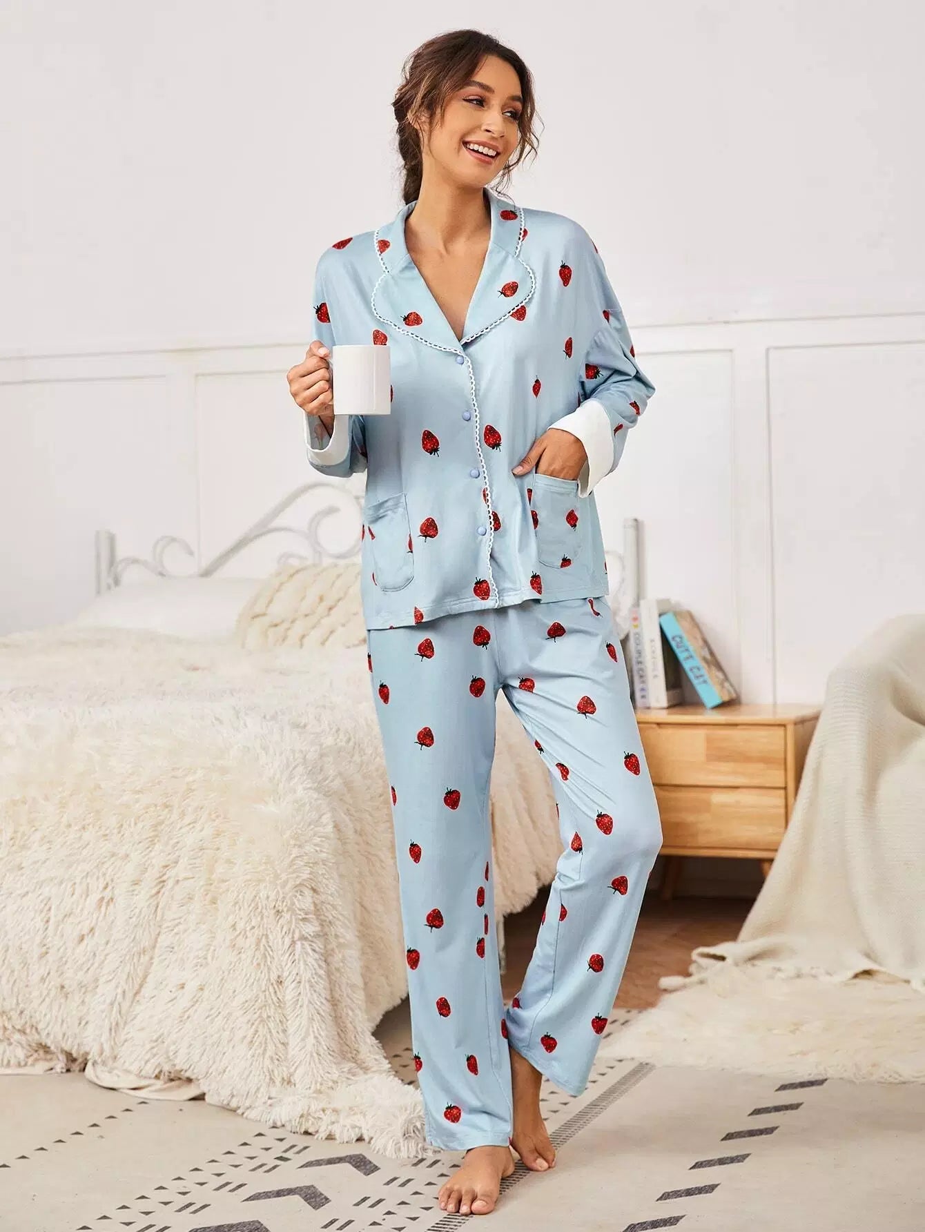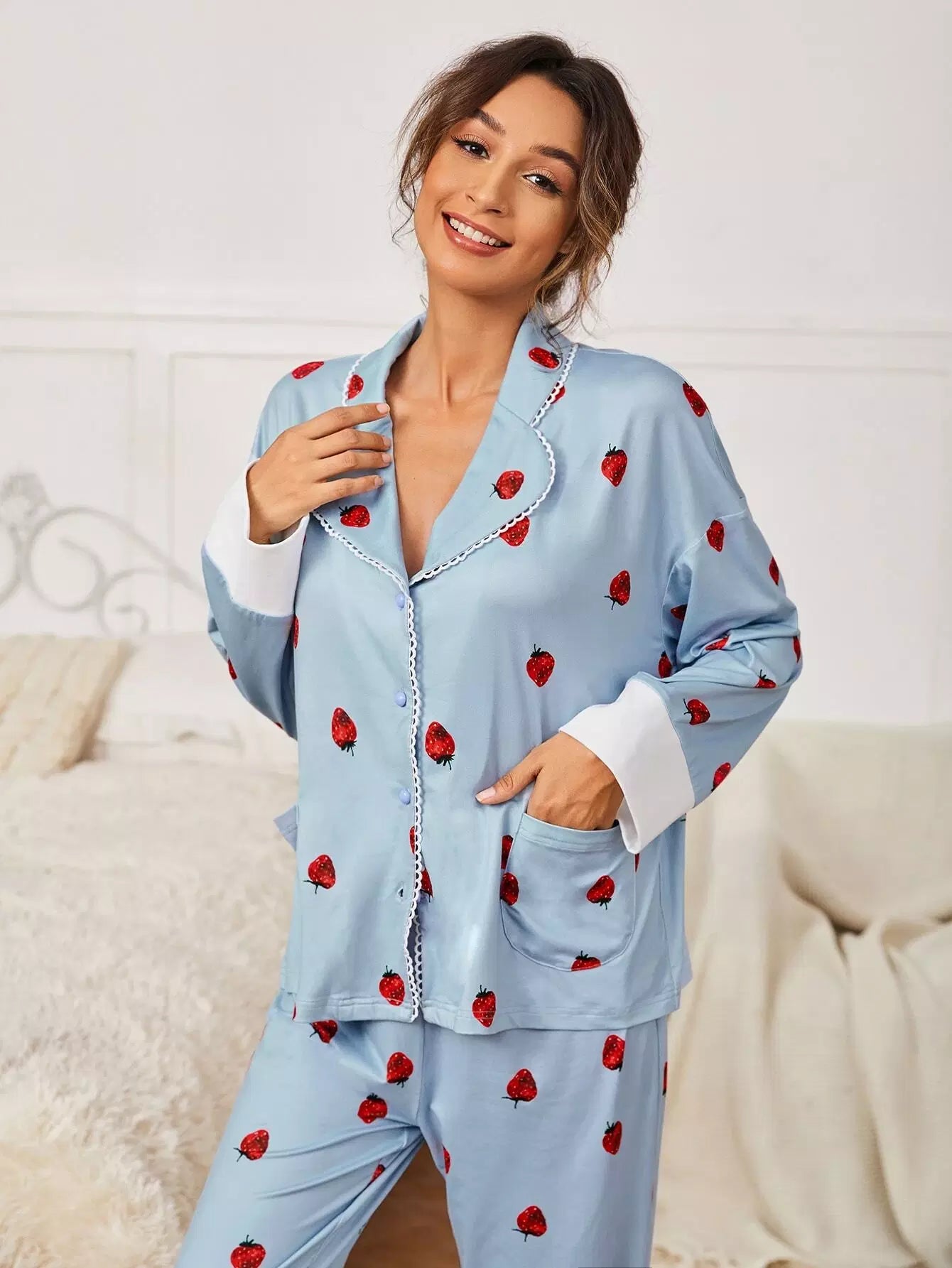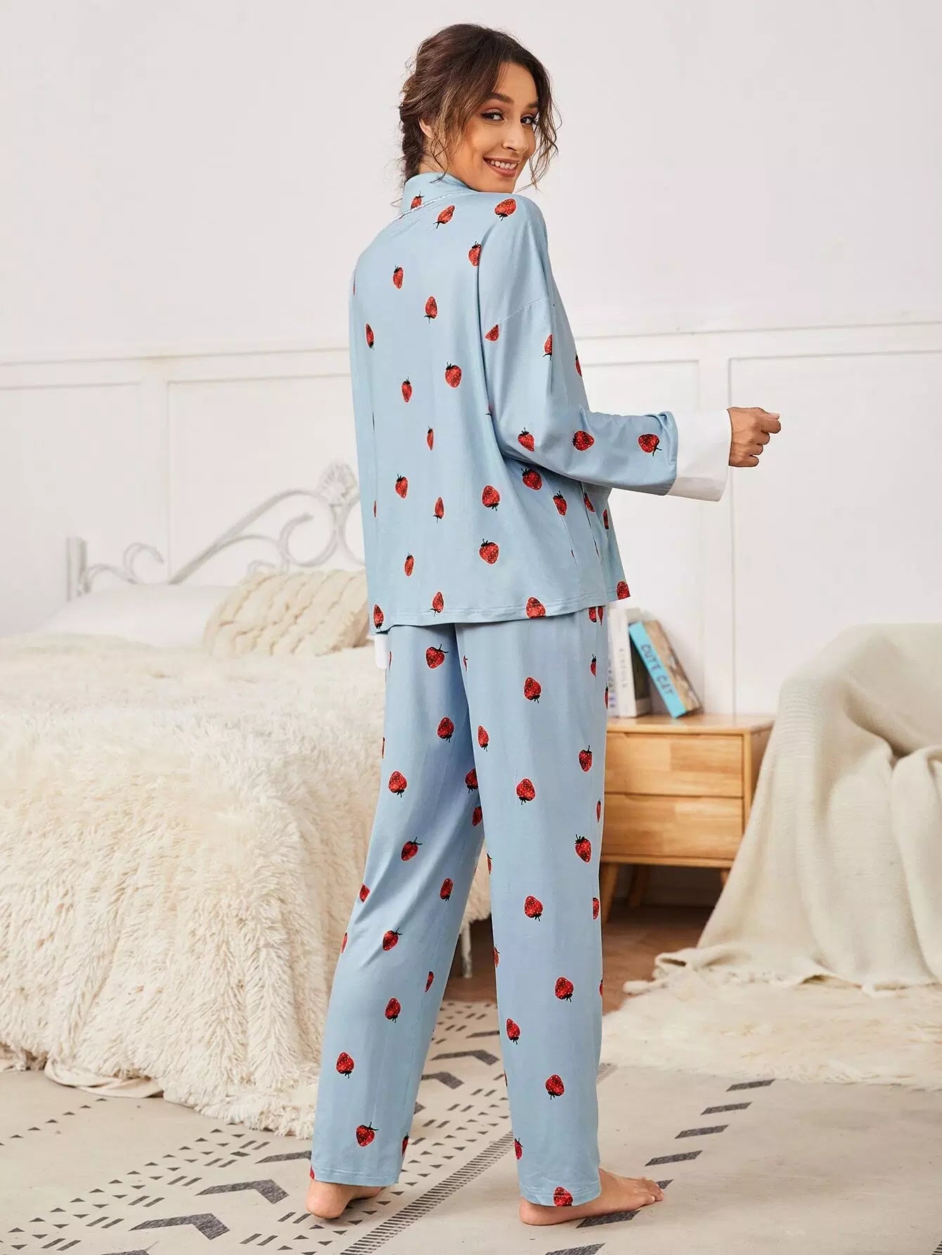 Strawberry Print Scallop Trim Drop Shoulder Blouse & Pants PJ Set