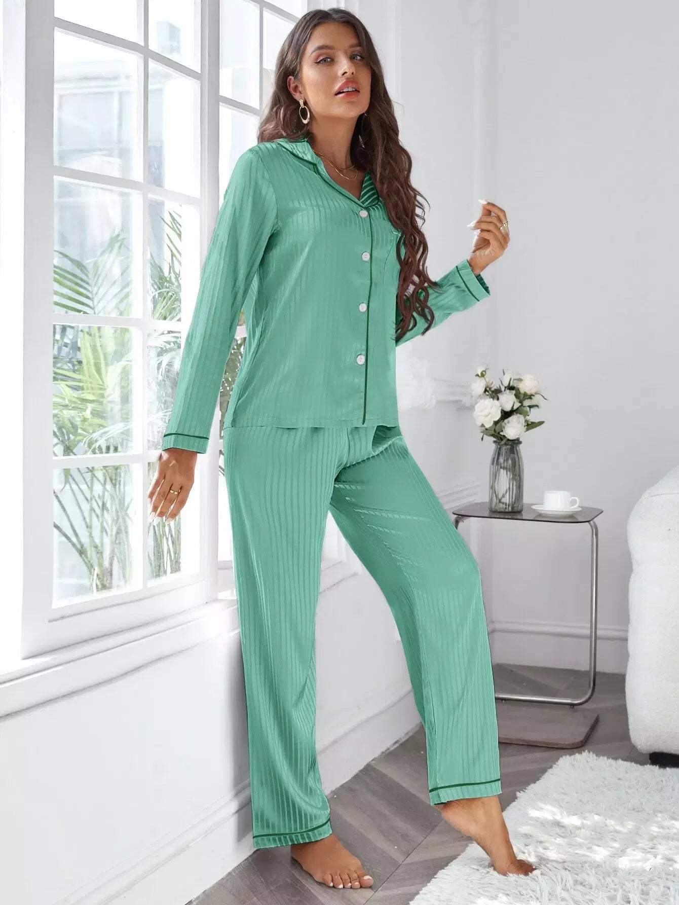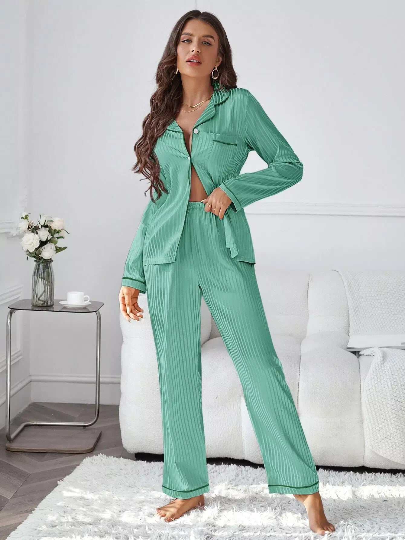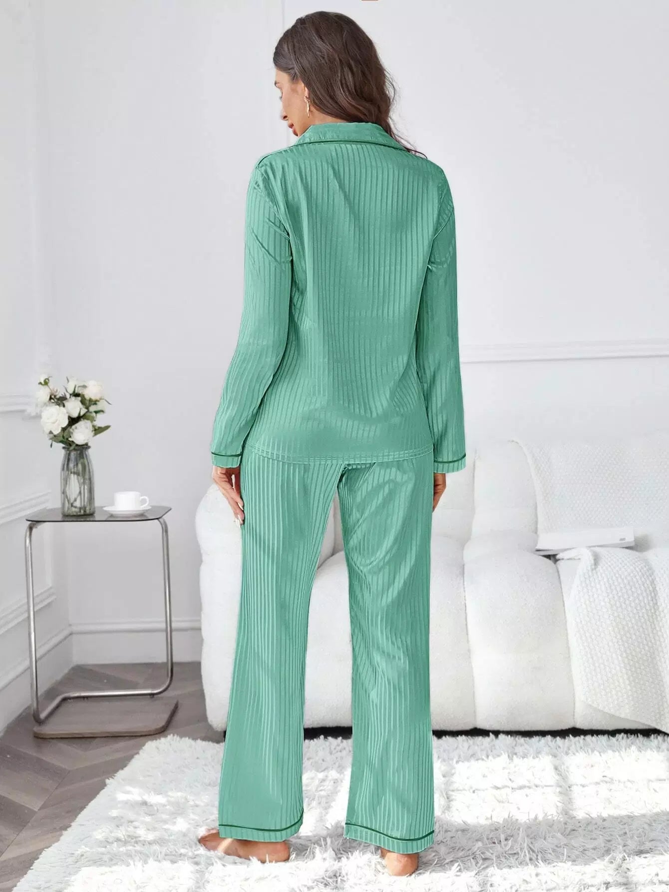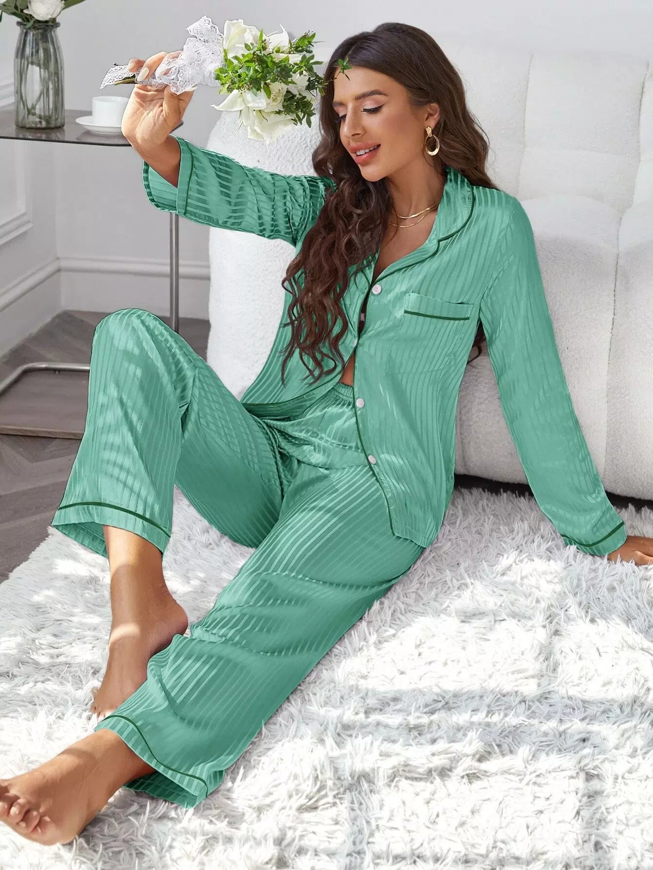Striped Jacquard Contrast Piping Satin Blouse & Pants PJ Set