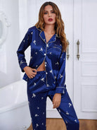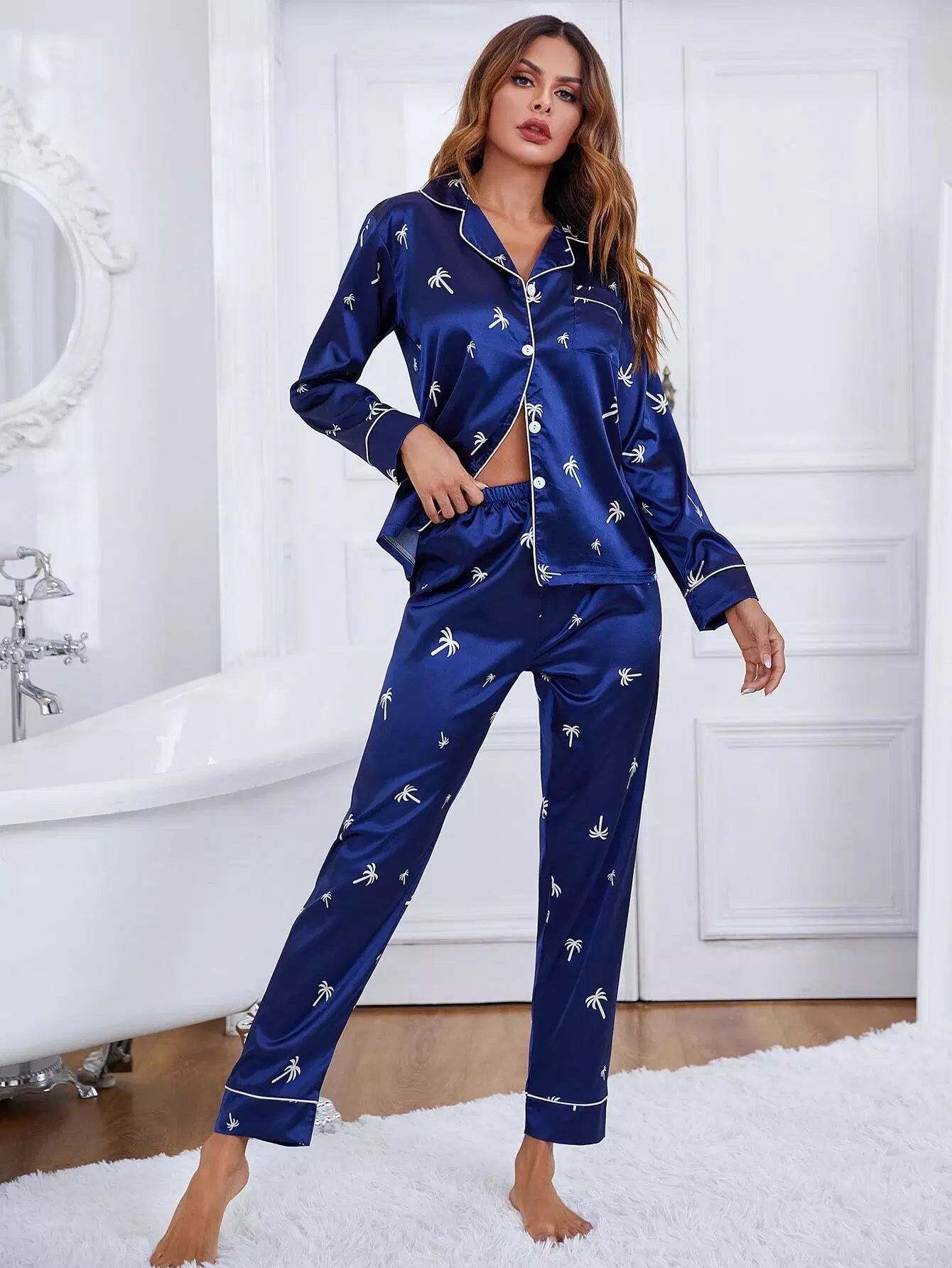 Tree Print Contrast Binding Satin Blouse & Pants Night Set