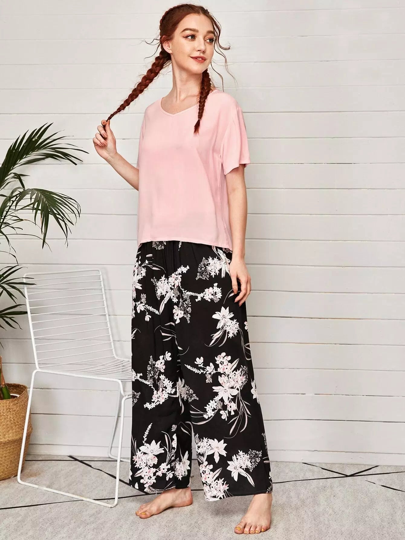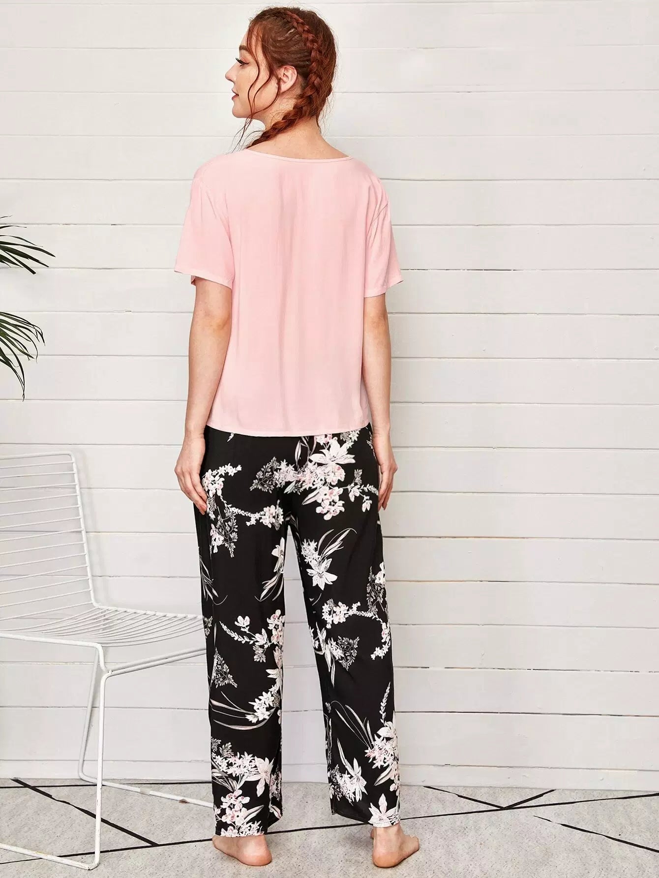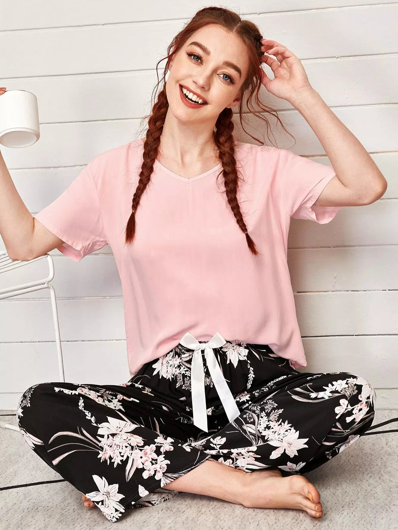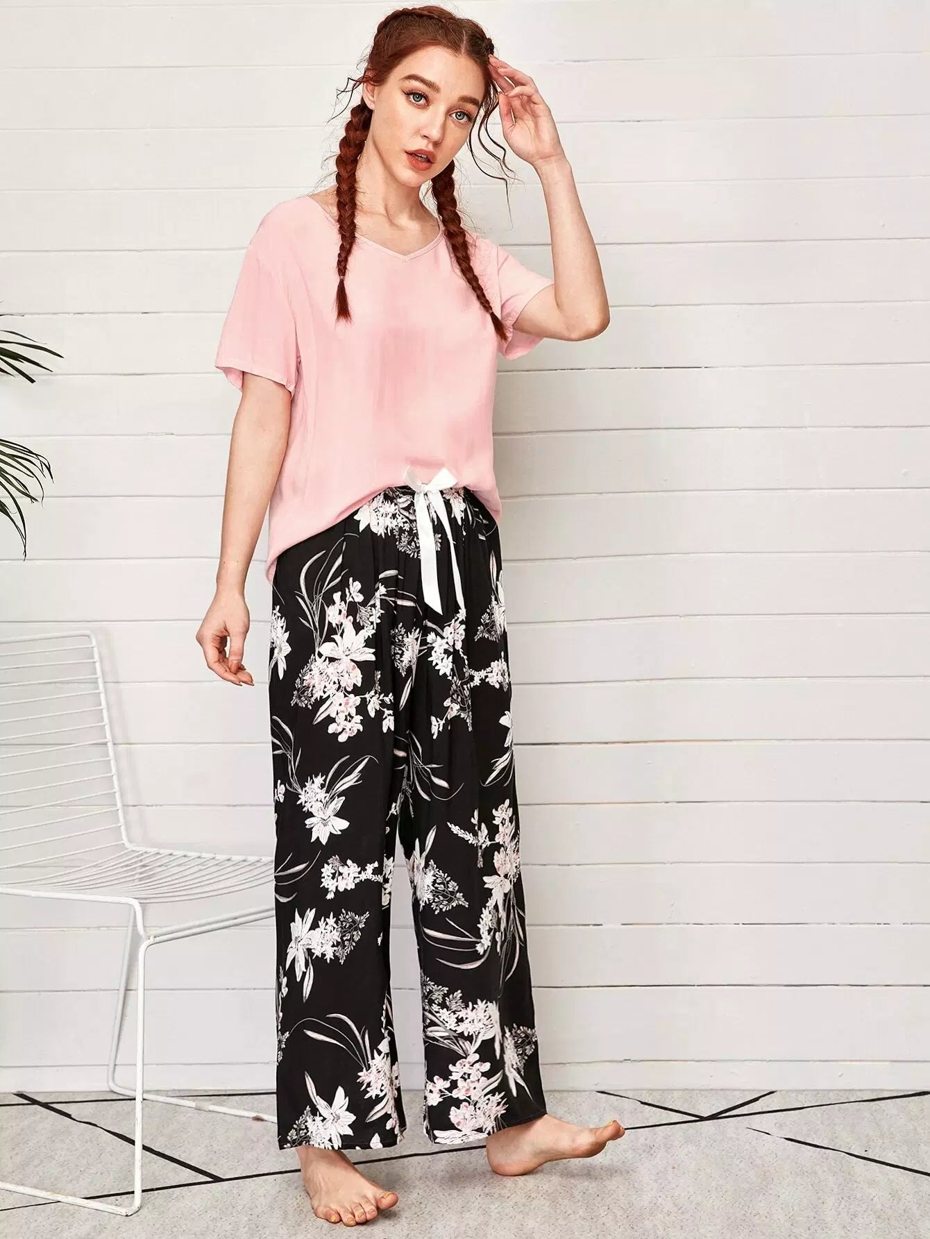 V-neck Tee & Tie Front Floral Pants PJ Set