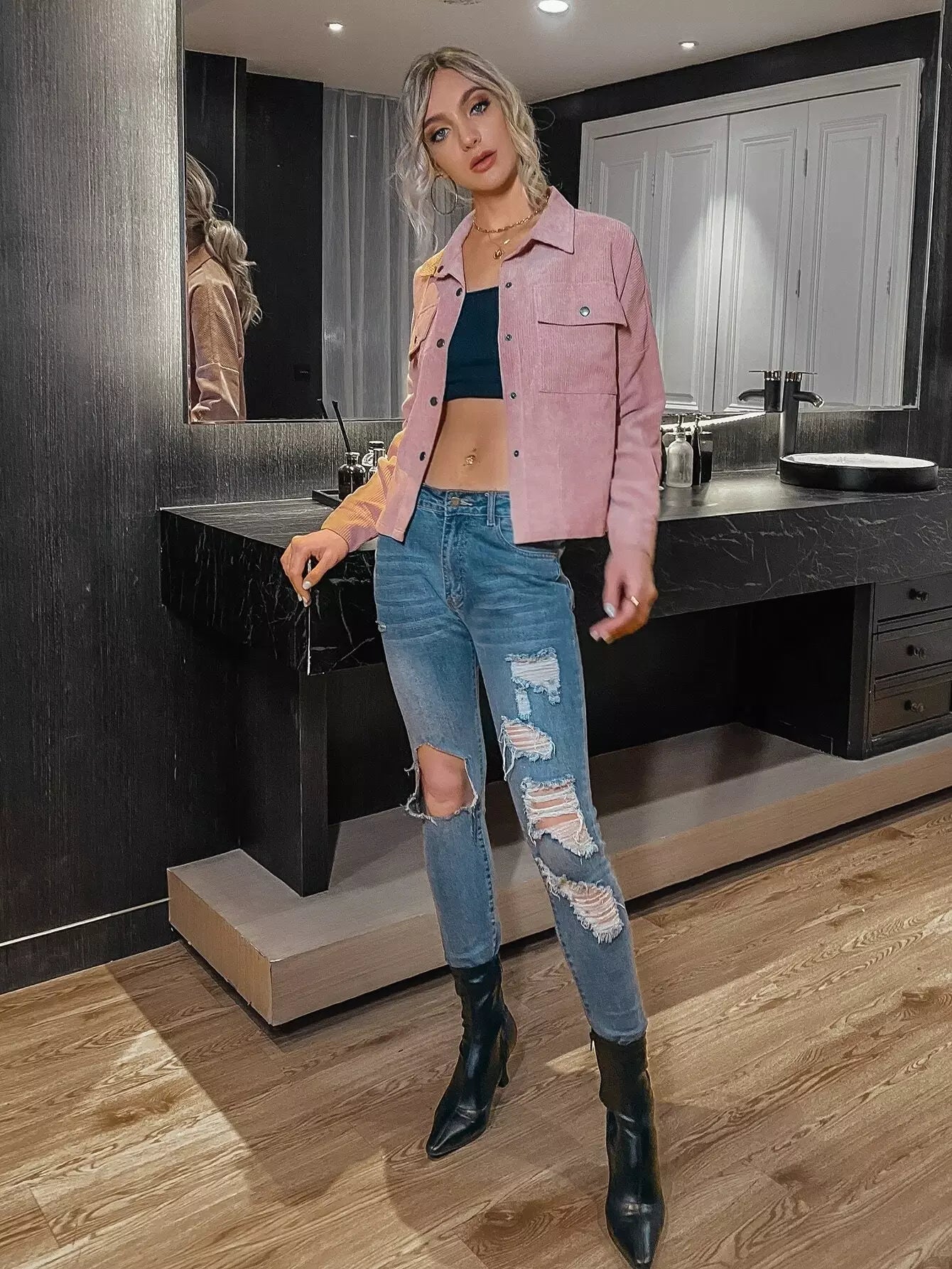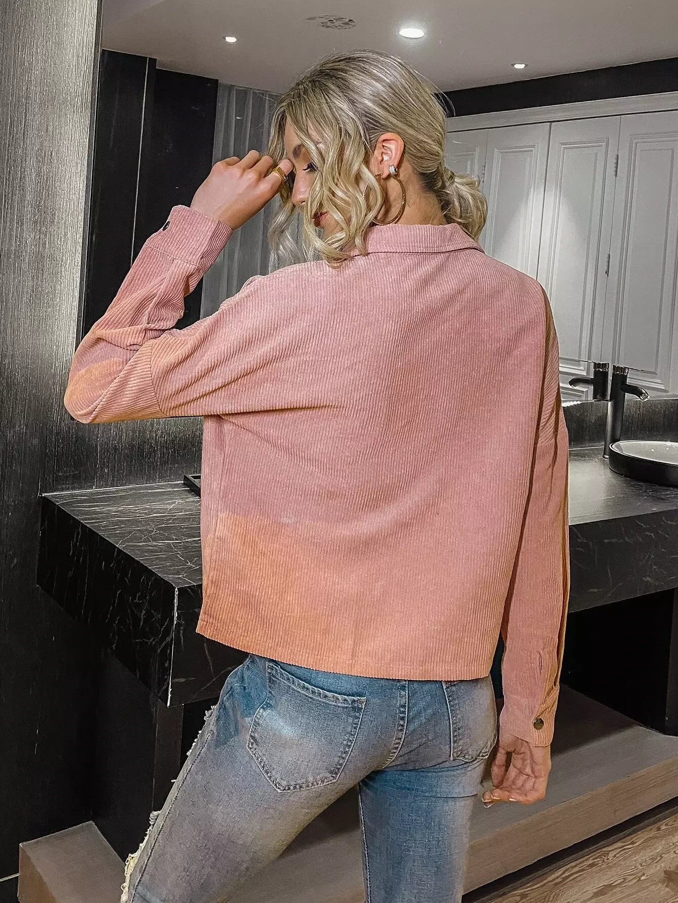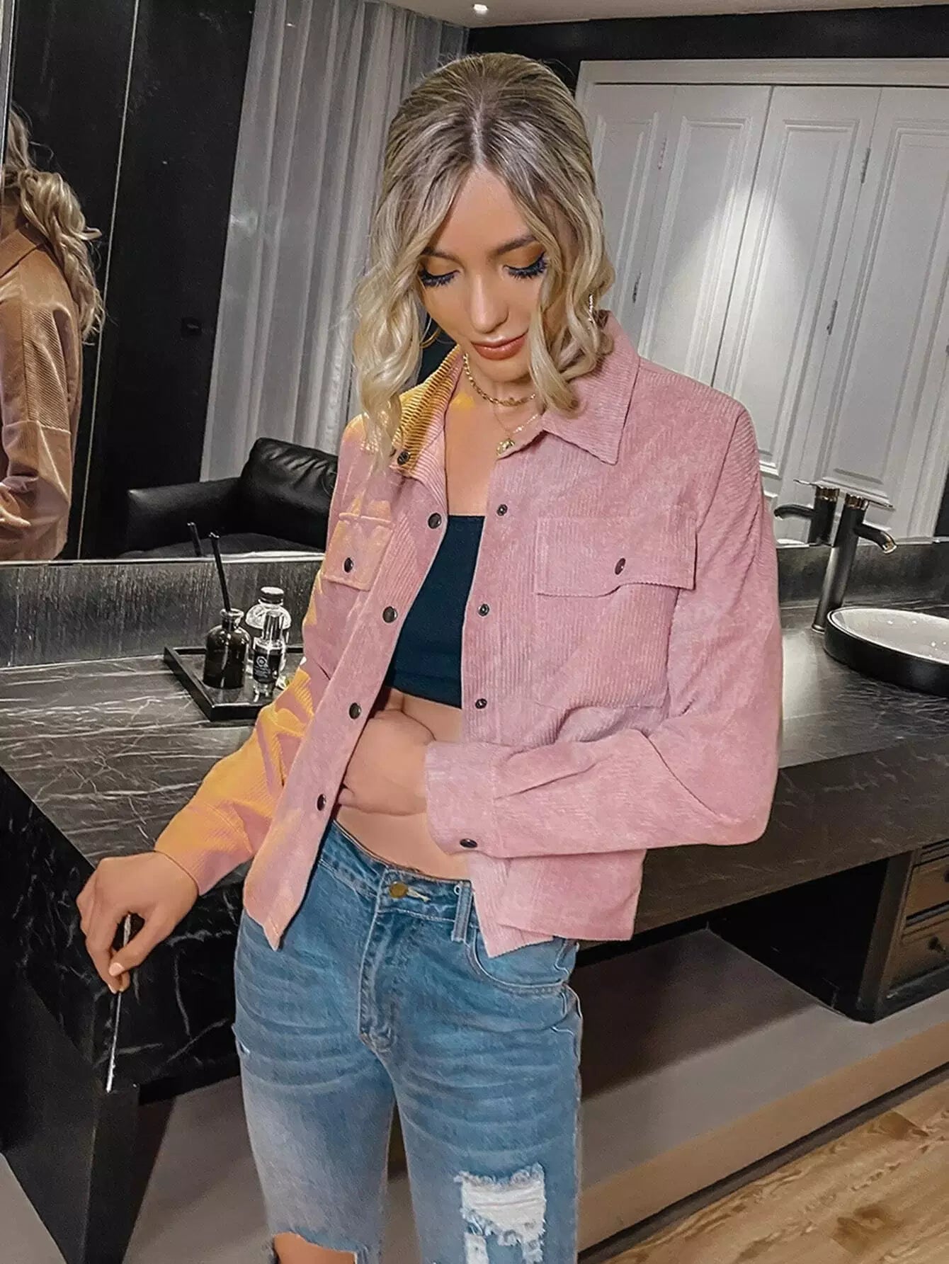Popper Button Front Drop Shoulder Corduroy Jacket