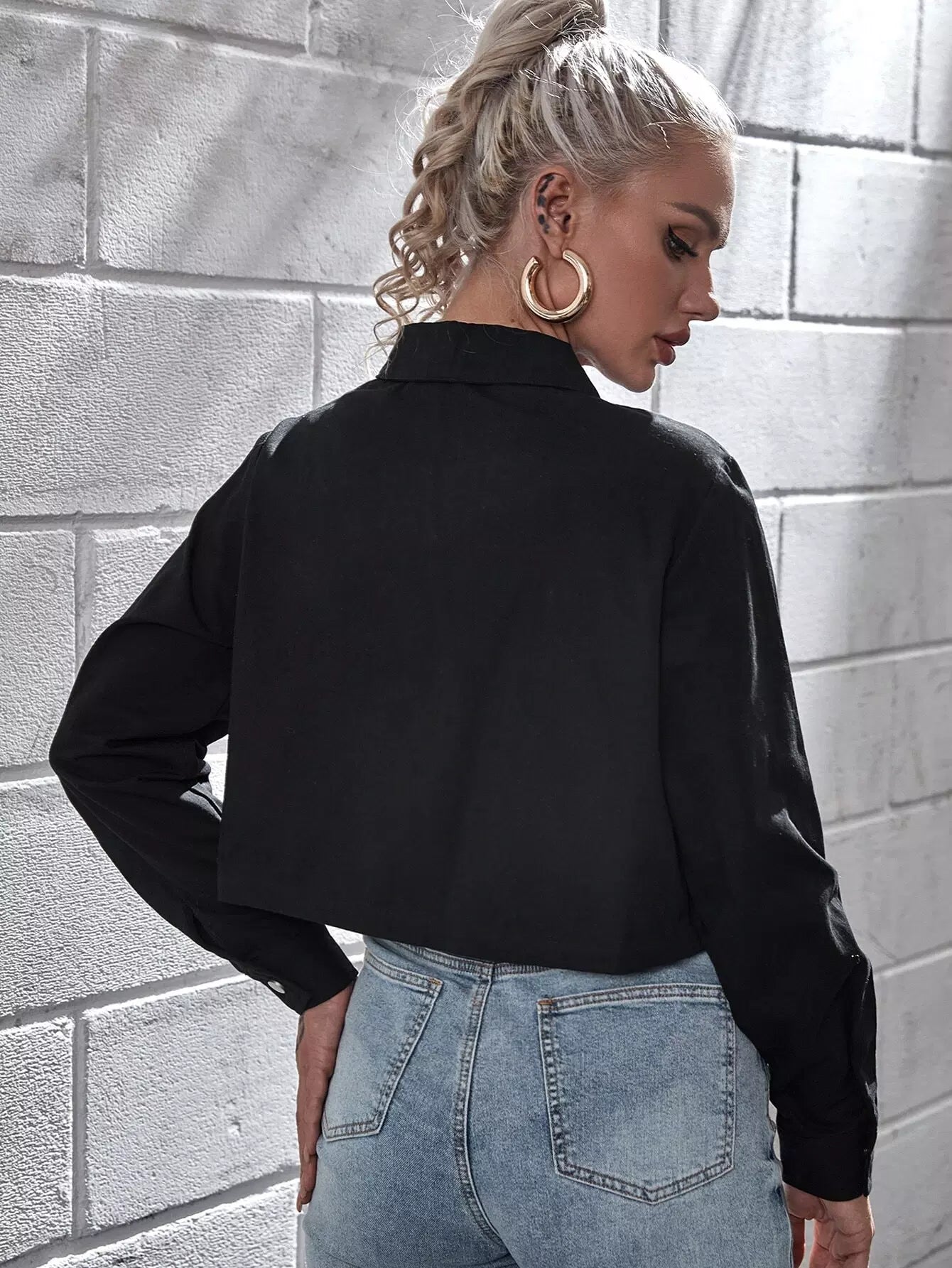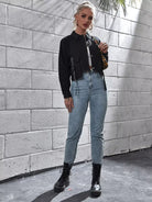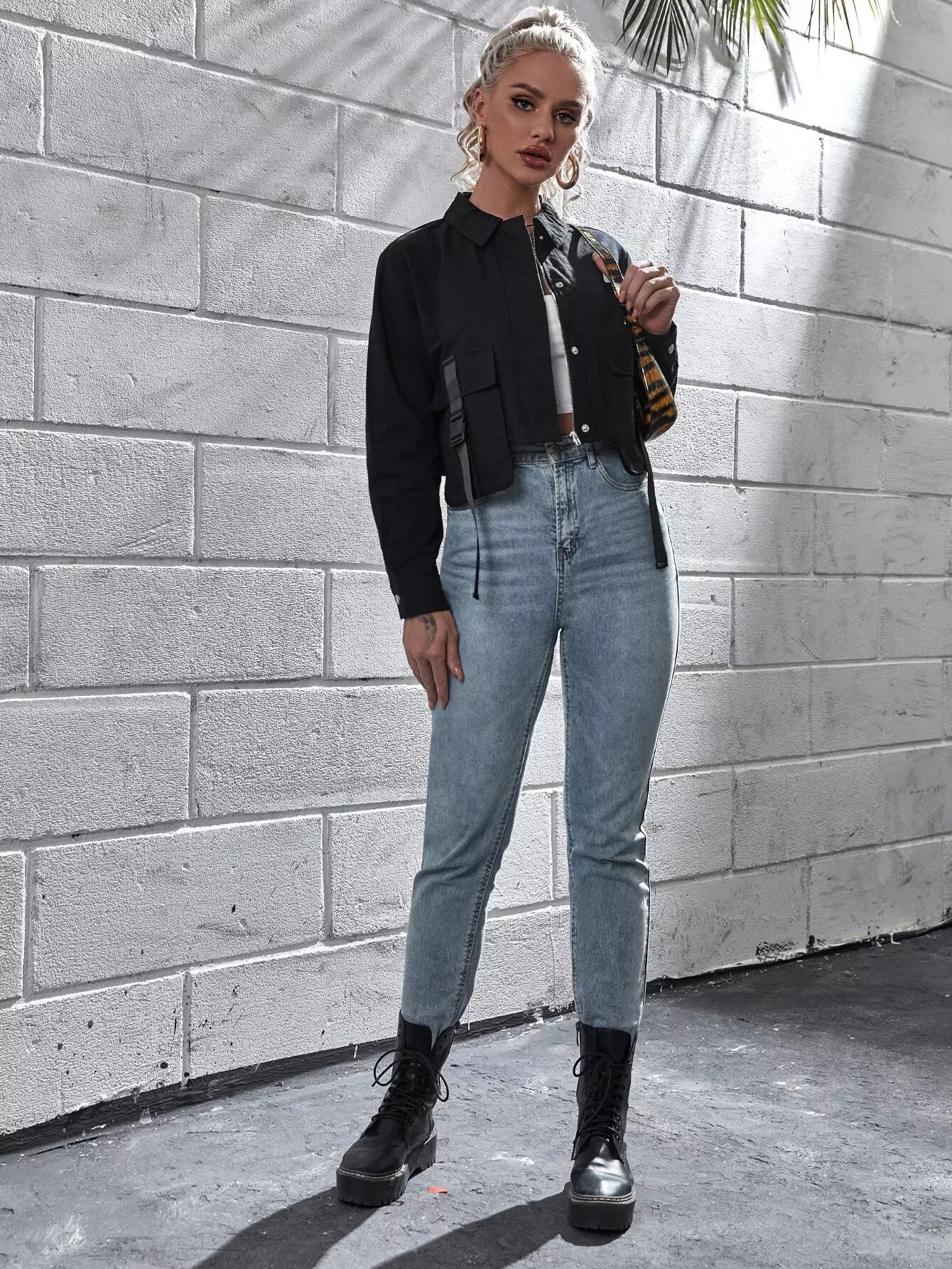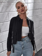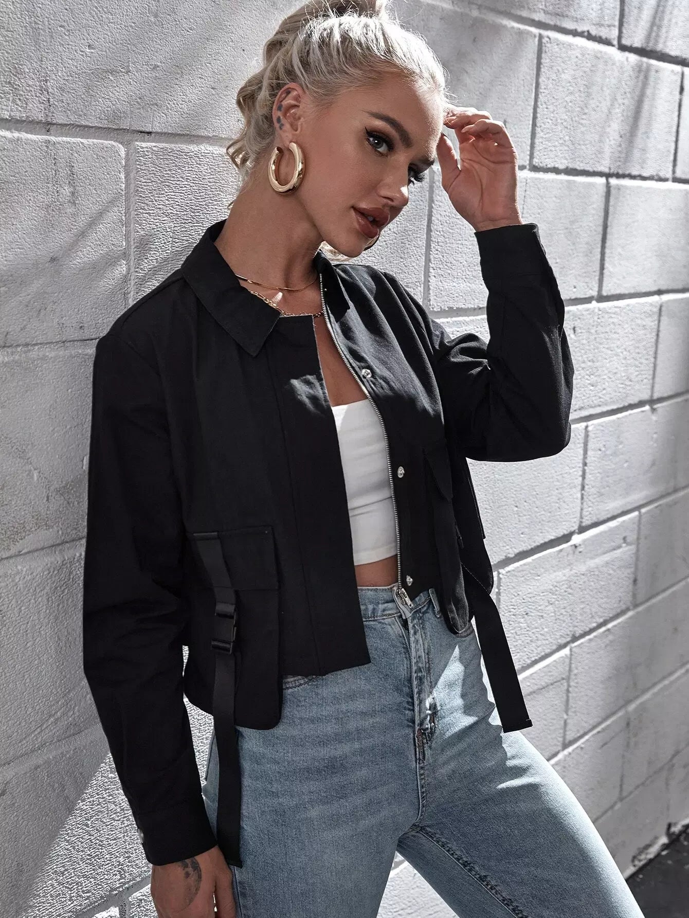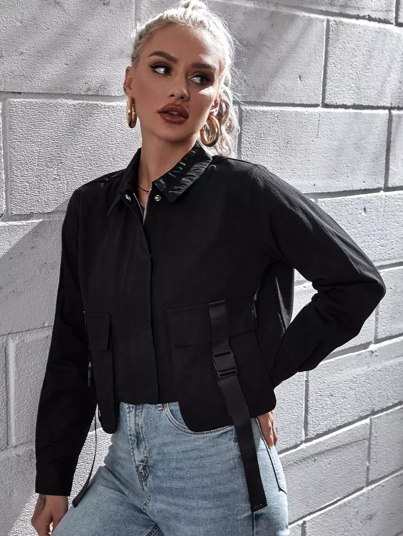 Push Buckle Flap Pocket Zipper Placket Jacket Without Belt
