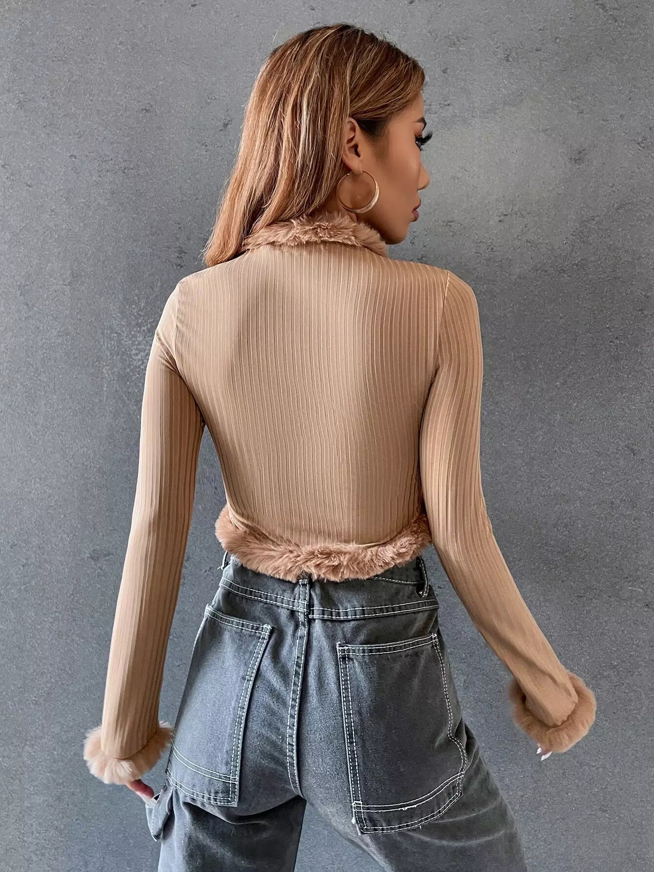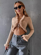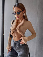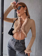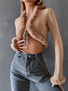 Ribbed Knit Fuzzy Trim Knot Front Crop Jacket