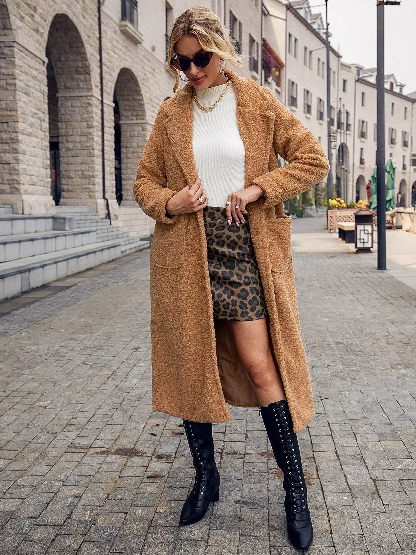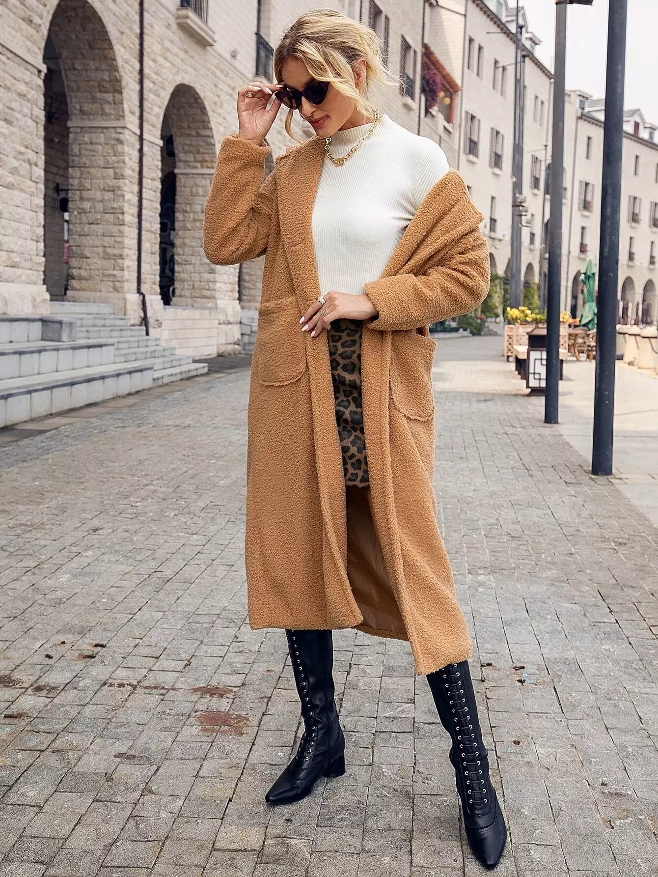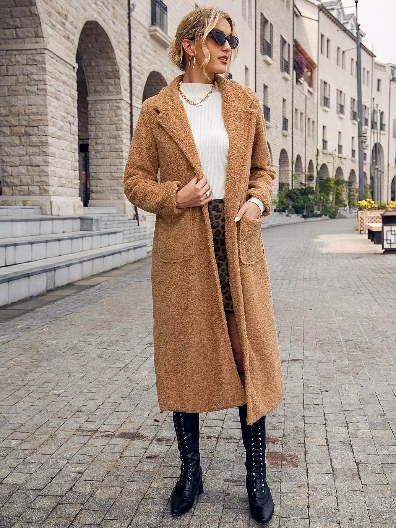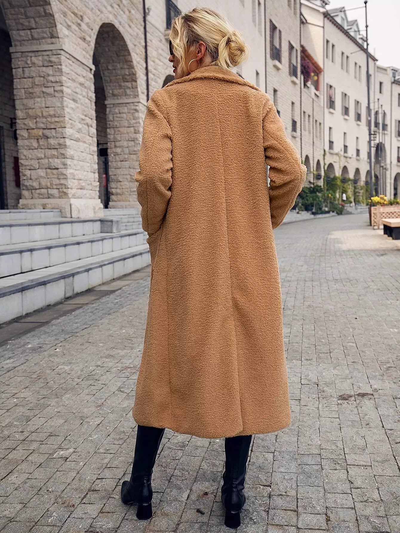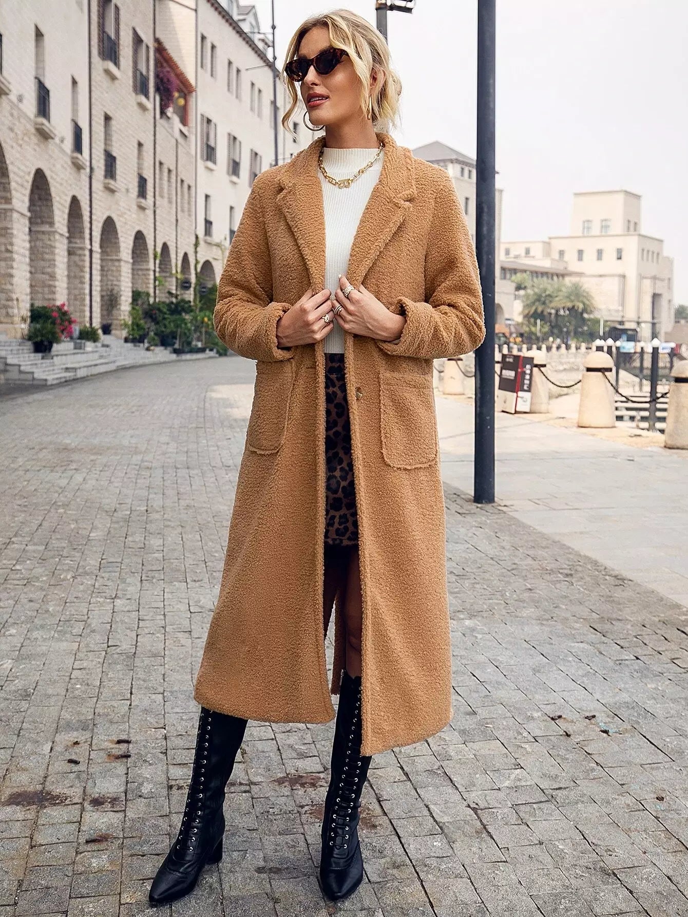 Button Front Dual Pockets Lapel Collar Teddy Coat