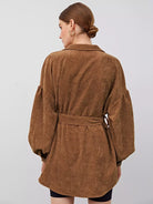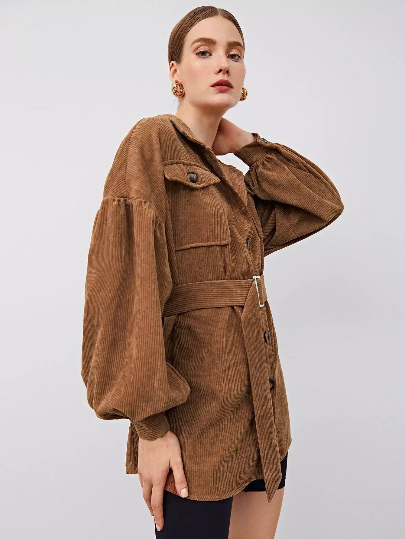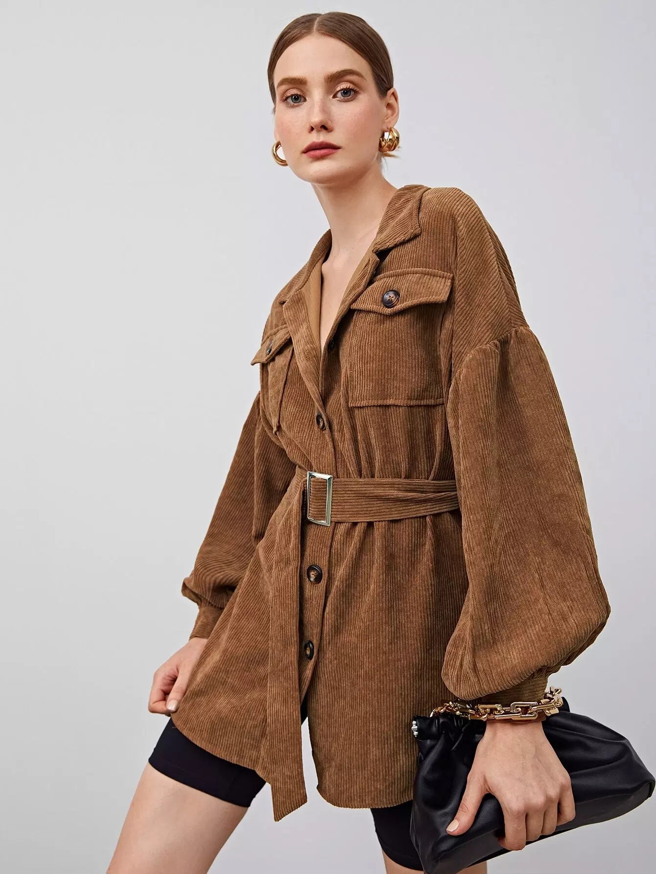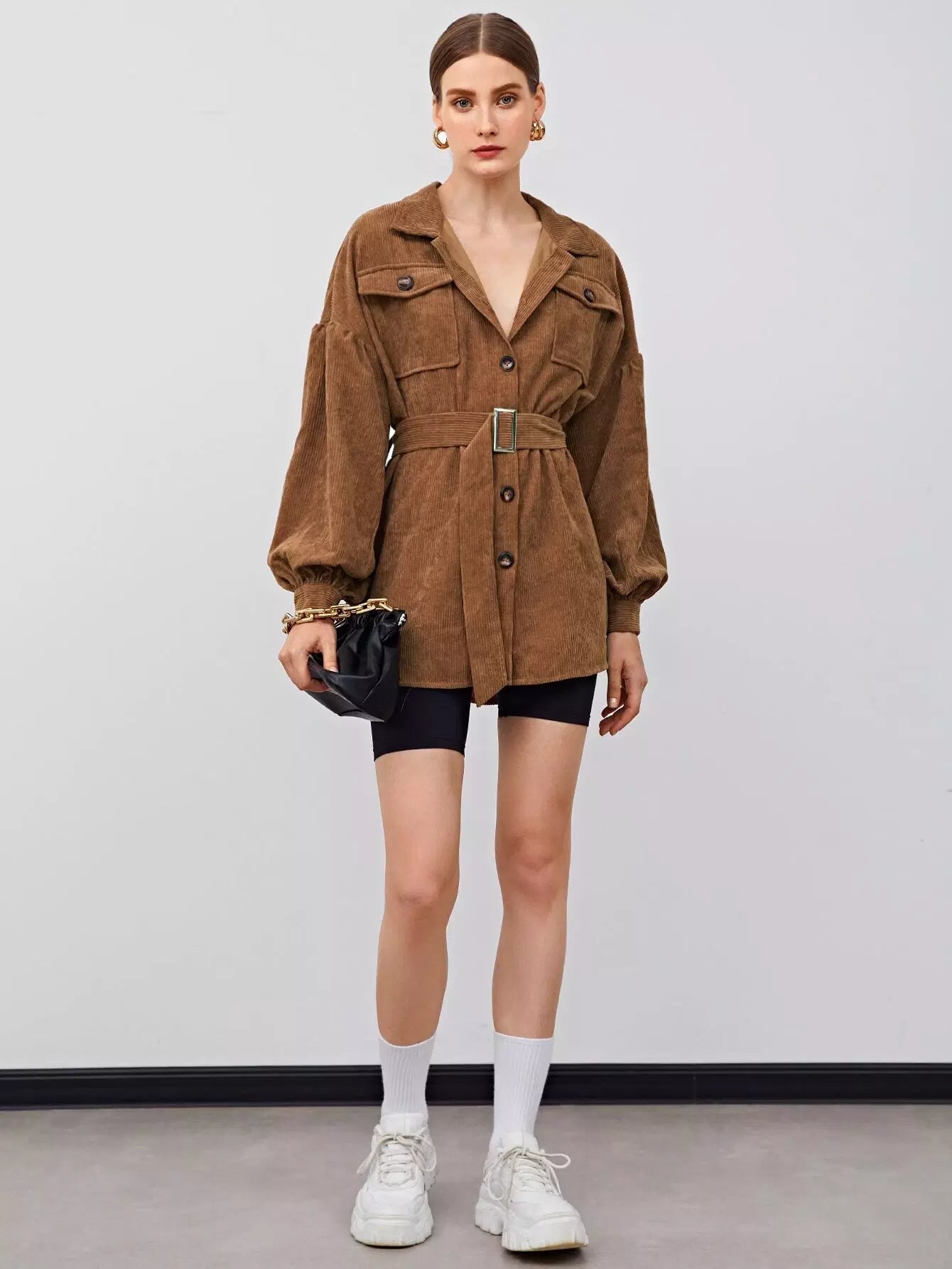 Collared Flap Pocket Front Buckle Cord Coat Without Belt