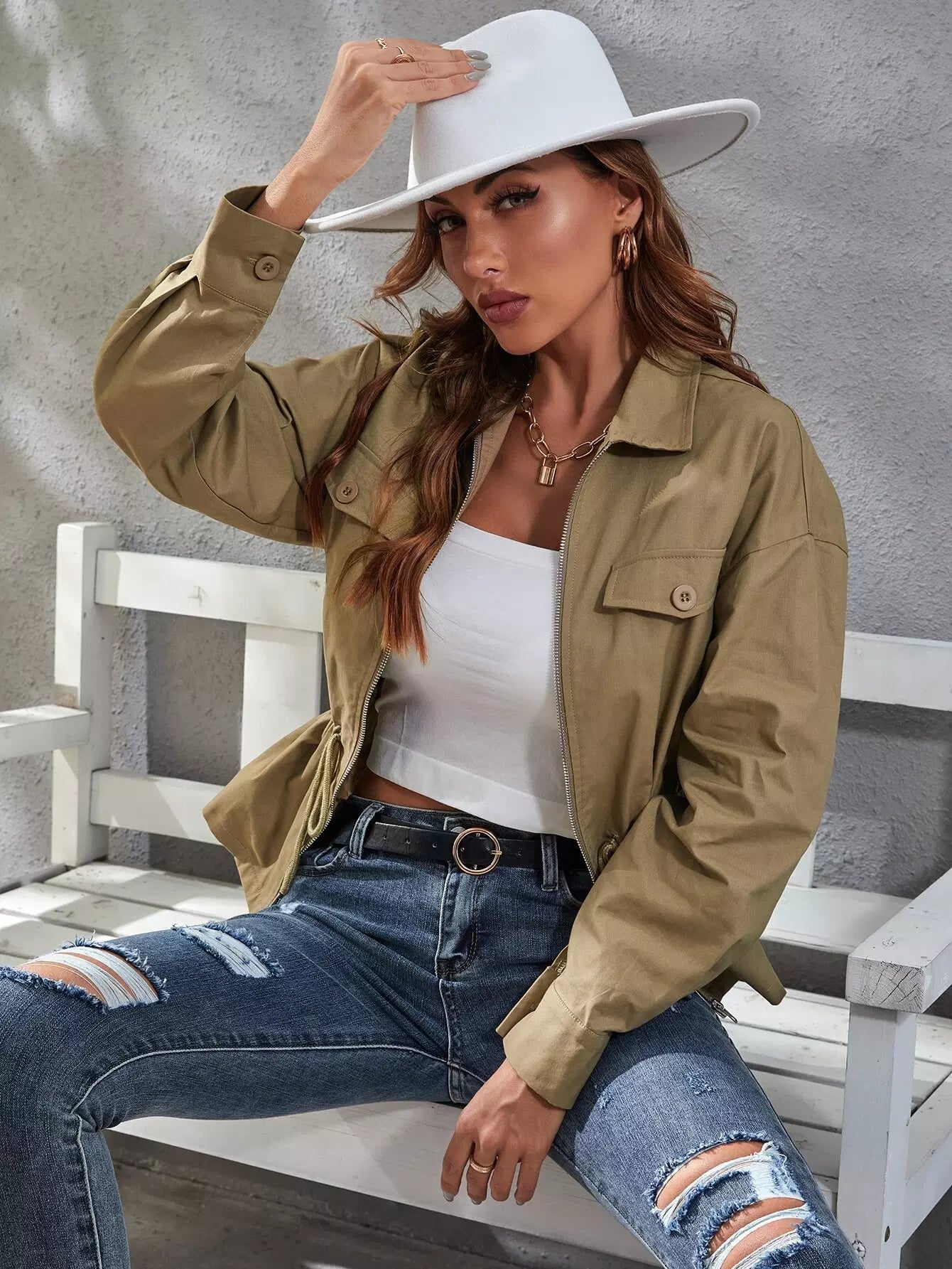 Flap Detail Drawstring Waist Drop Shoulder Zipper Coat