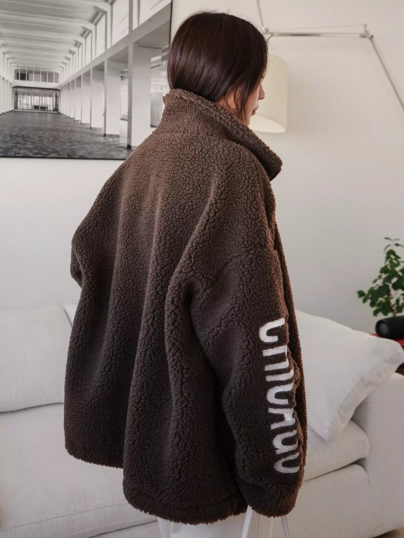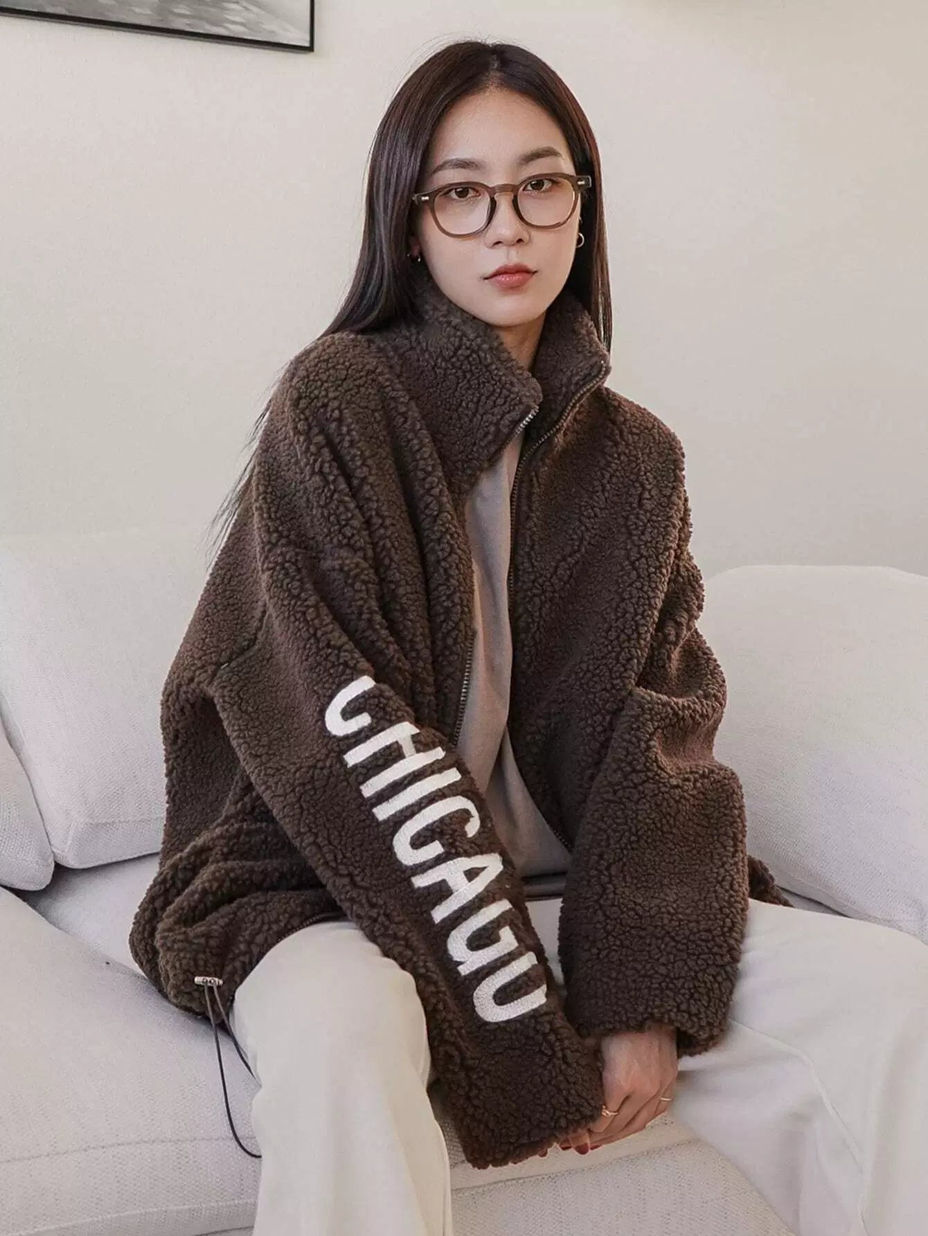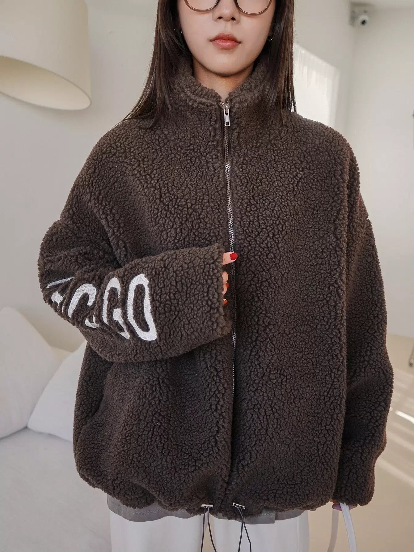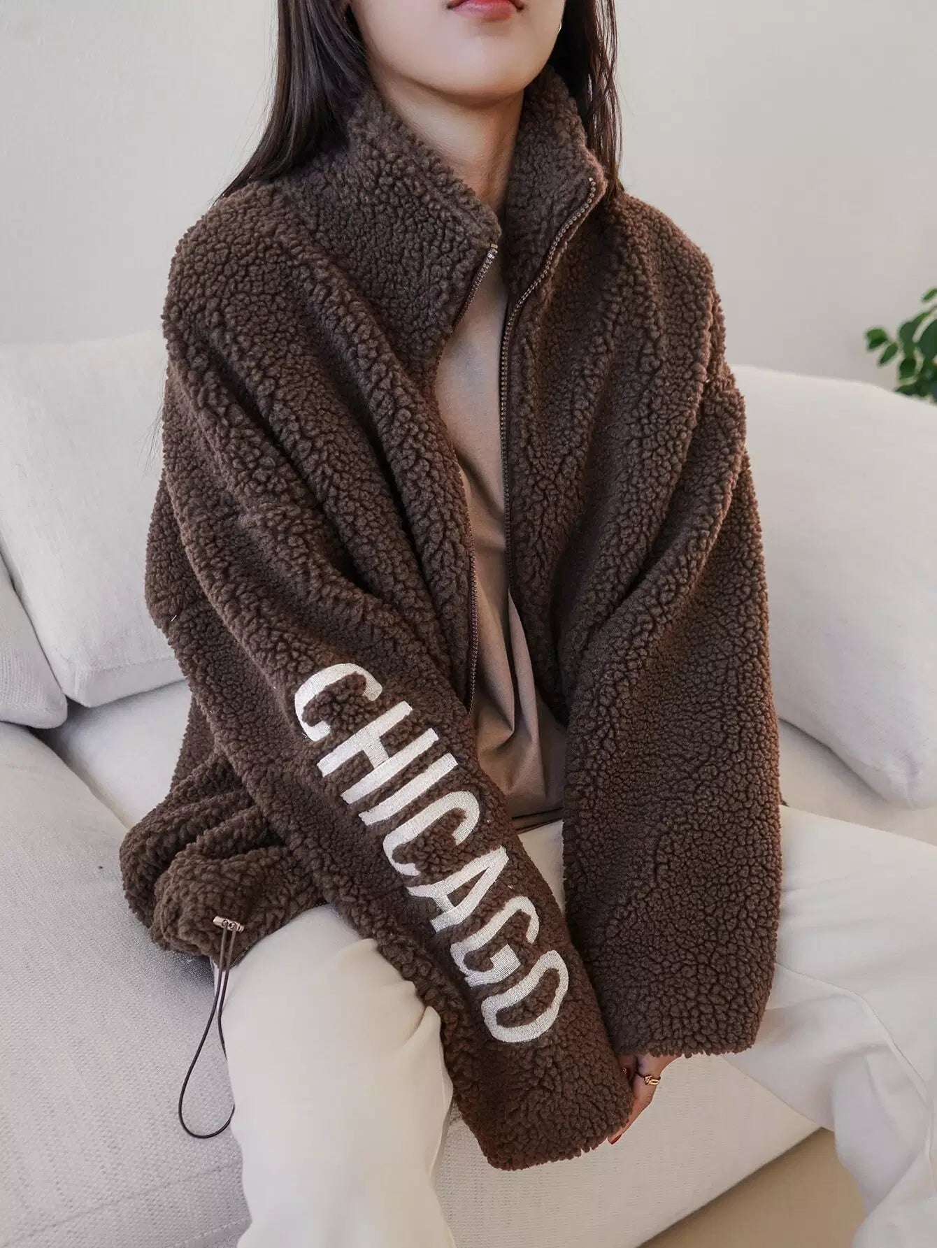Letter Embroidery Drop Shoulder Drawstring Hem Teddy Coat