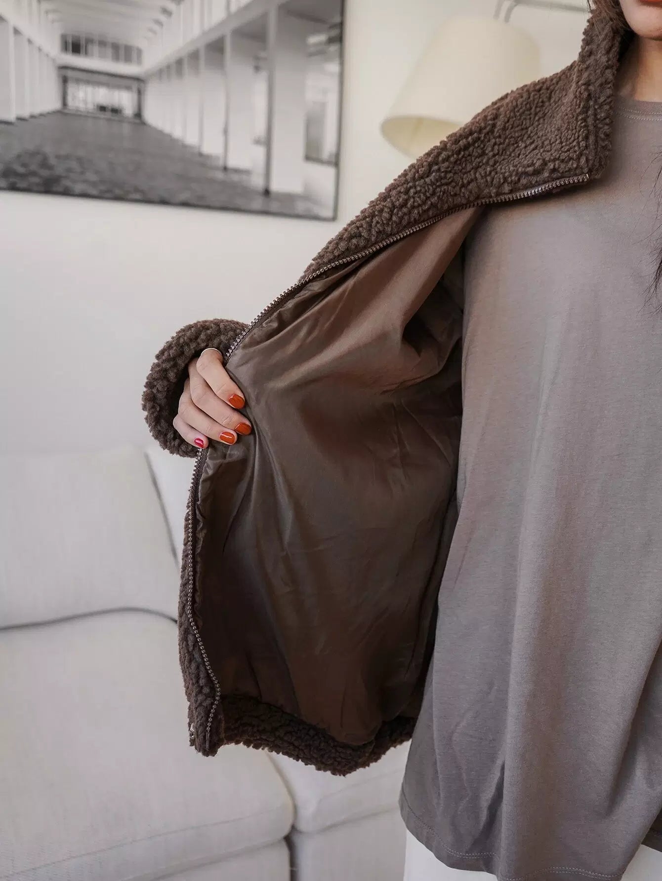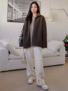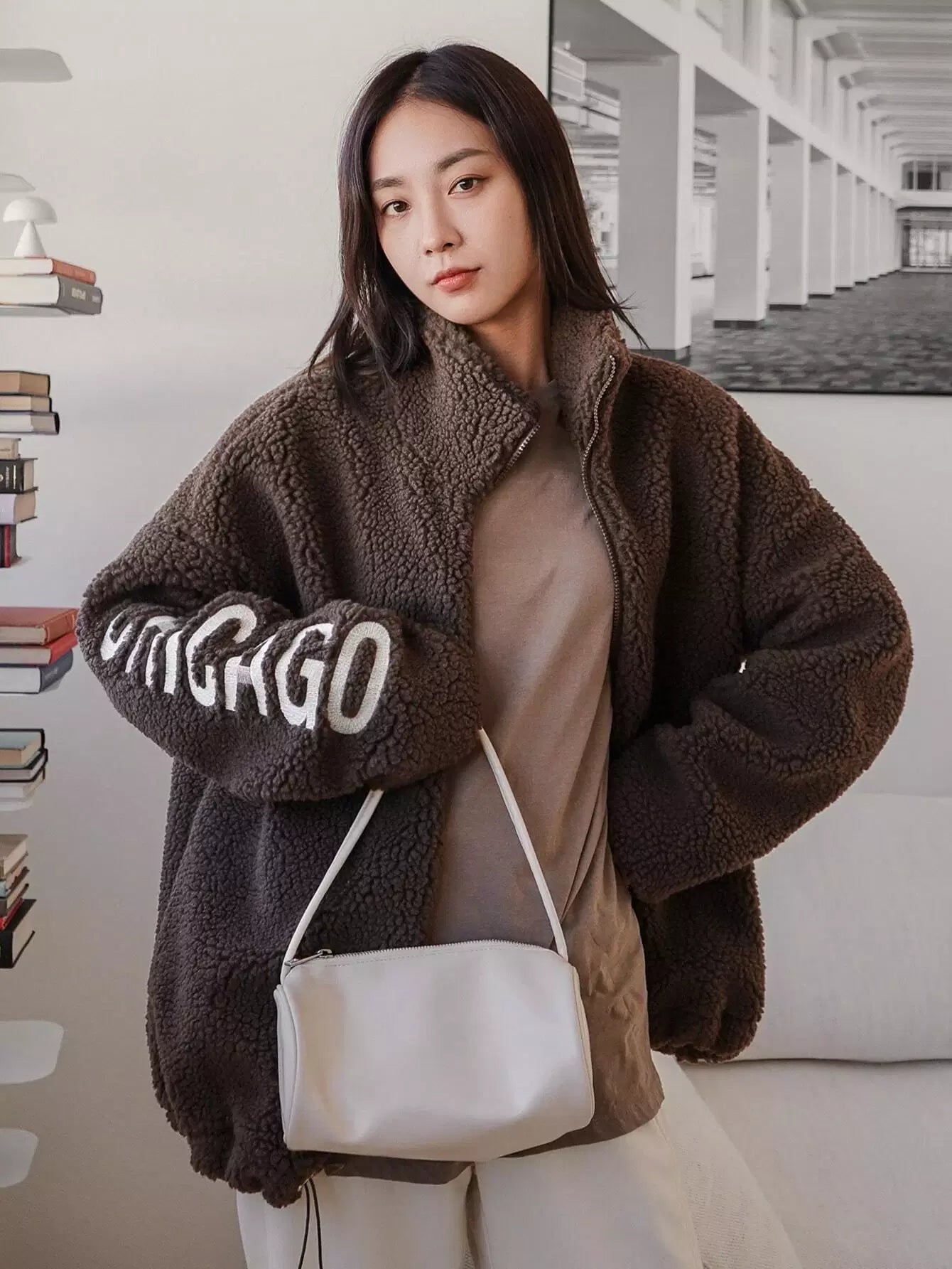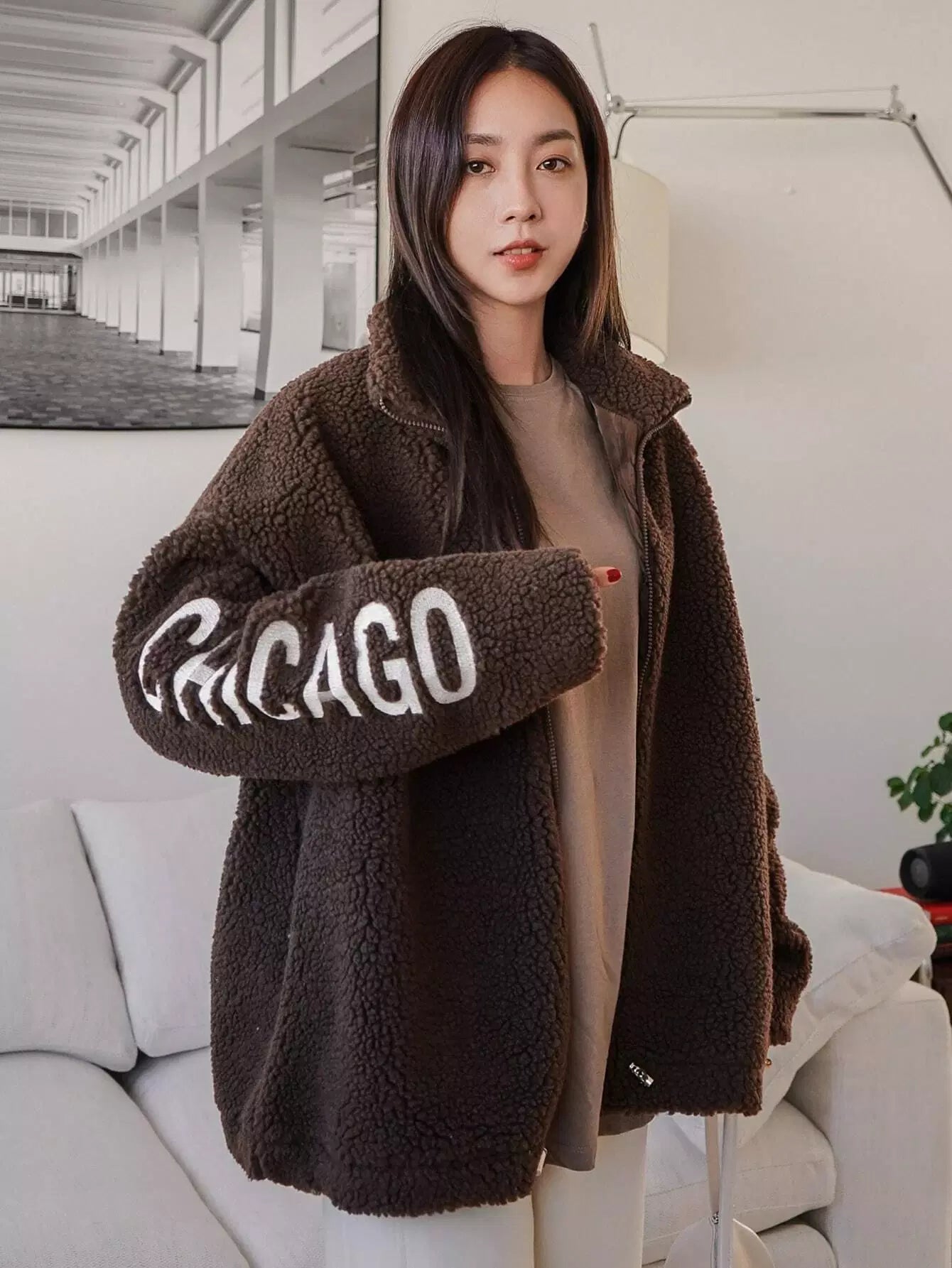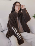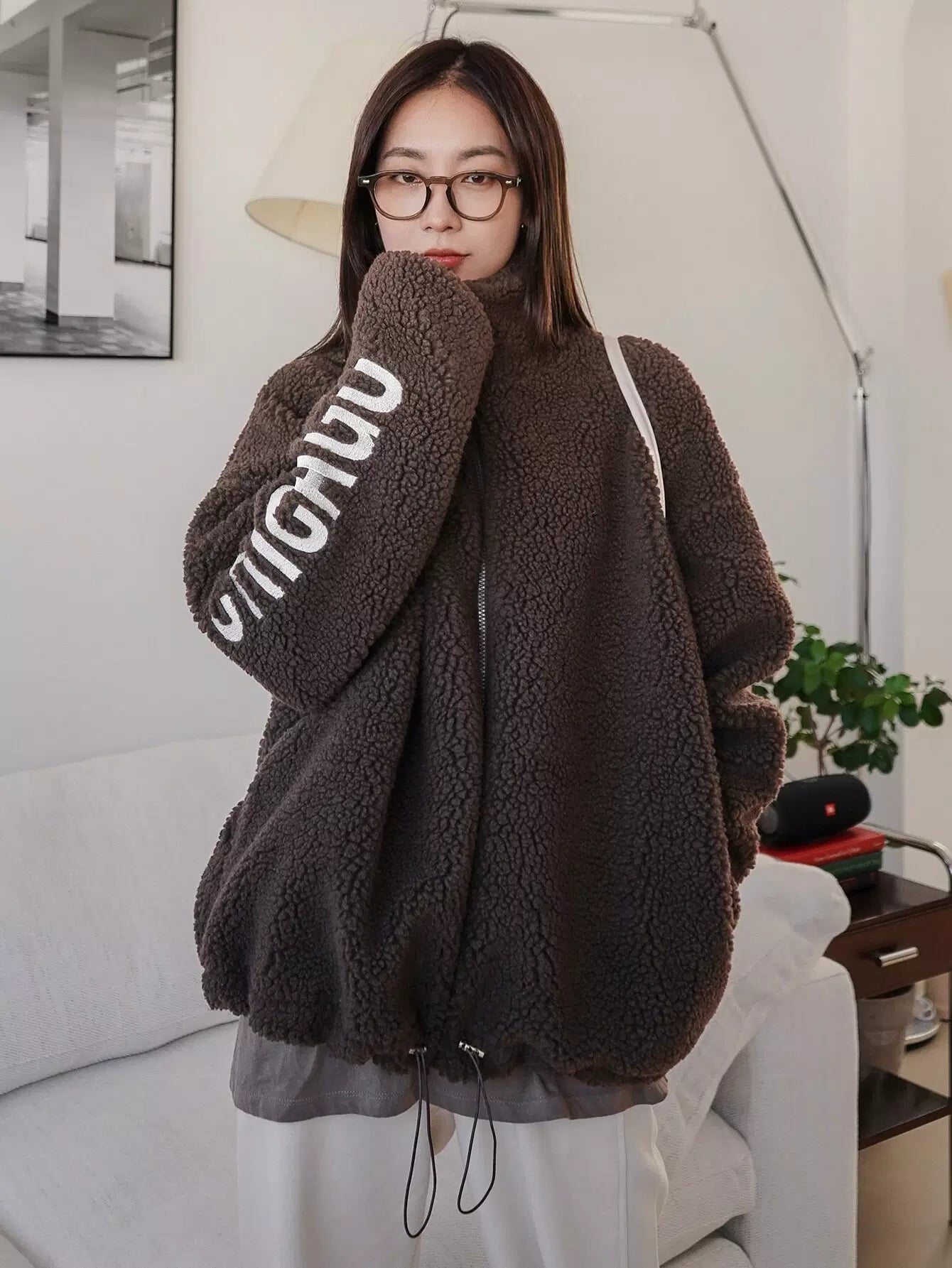Letter Embroidery Drop Shoulder Drawstring Hem Teddy Coat