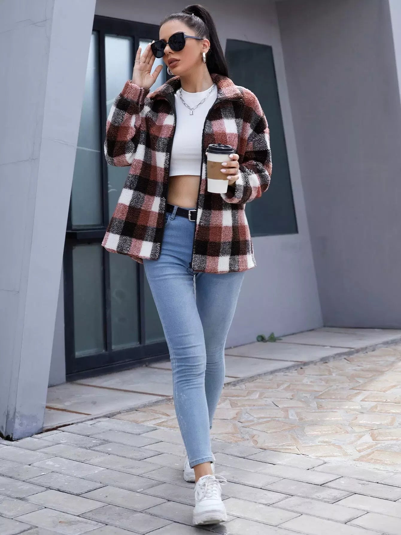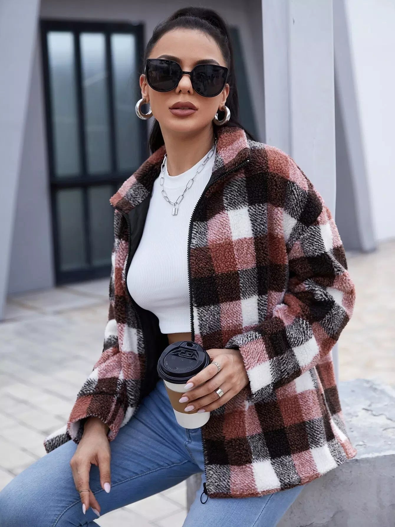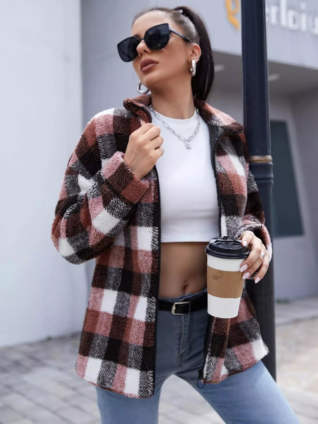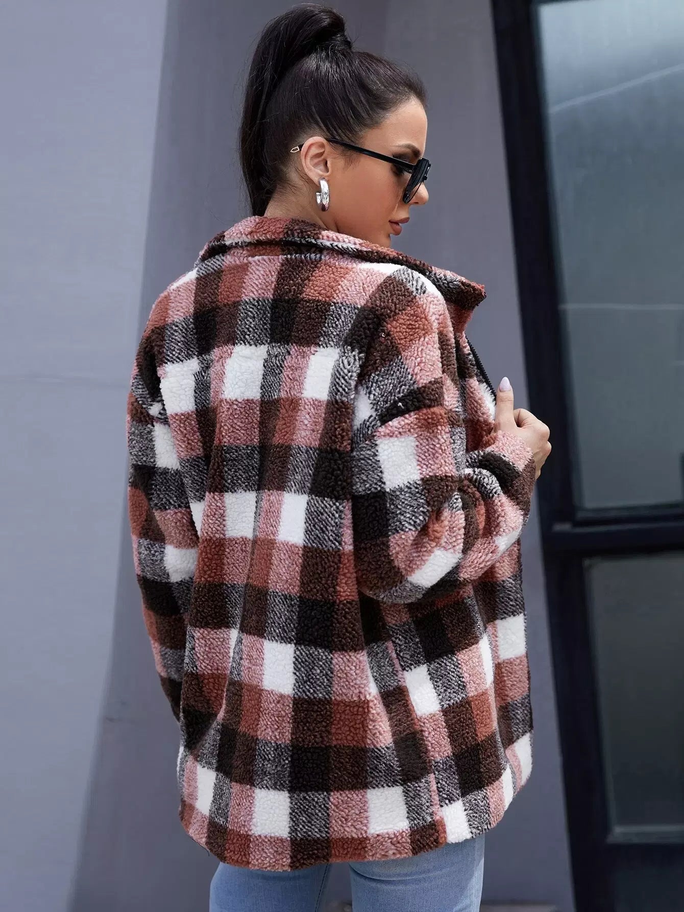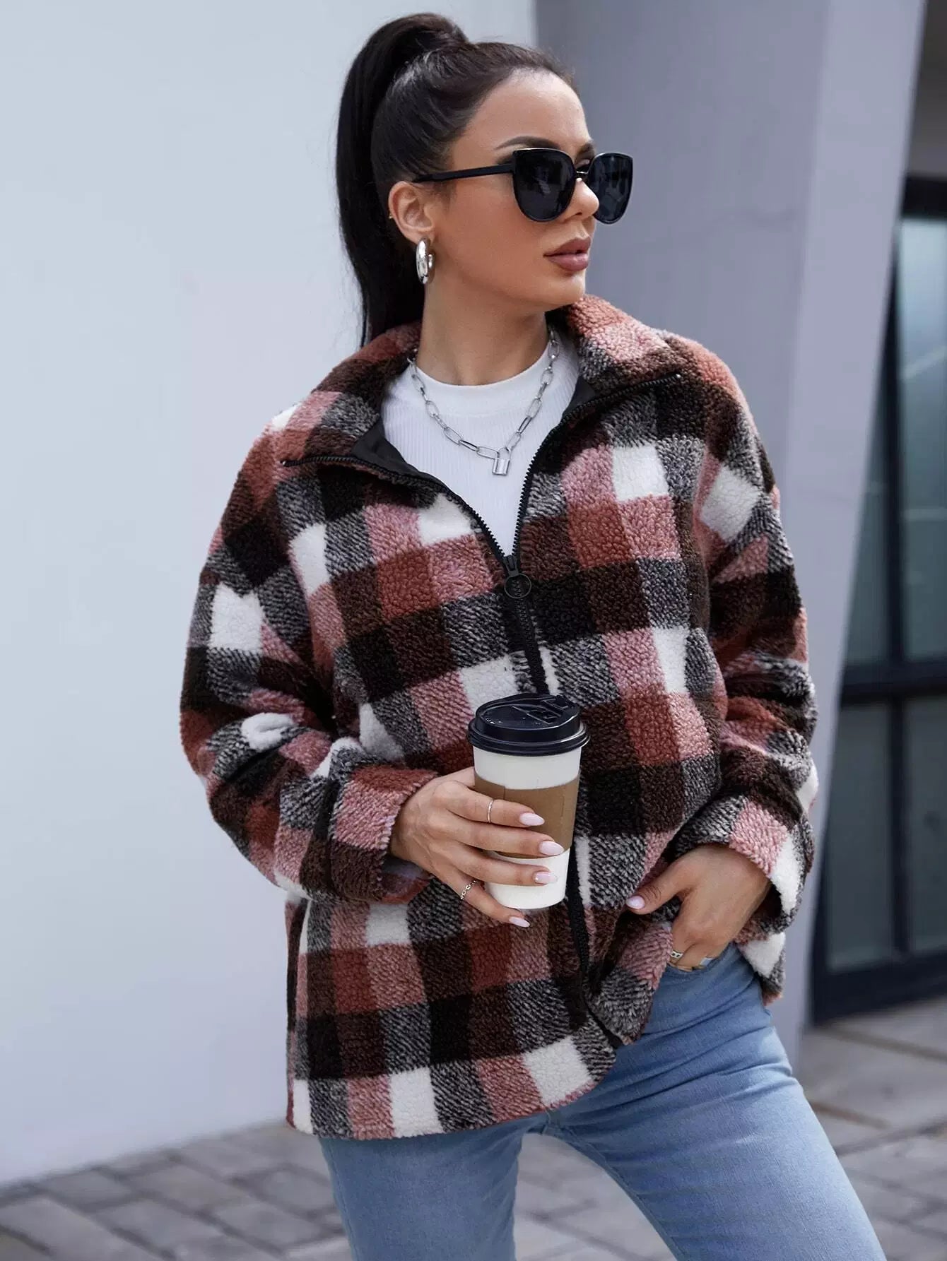Shearling Plaid Zip Up Teddy Coat