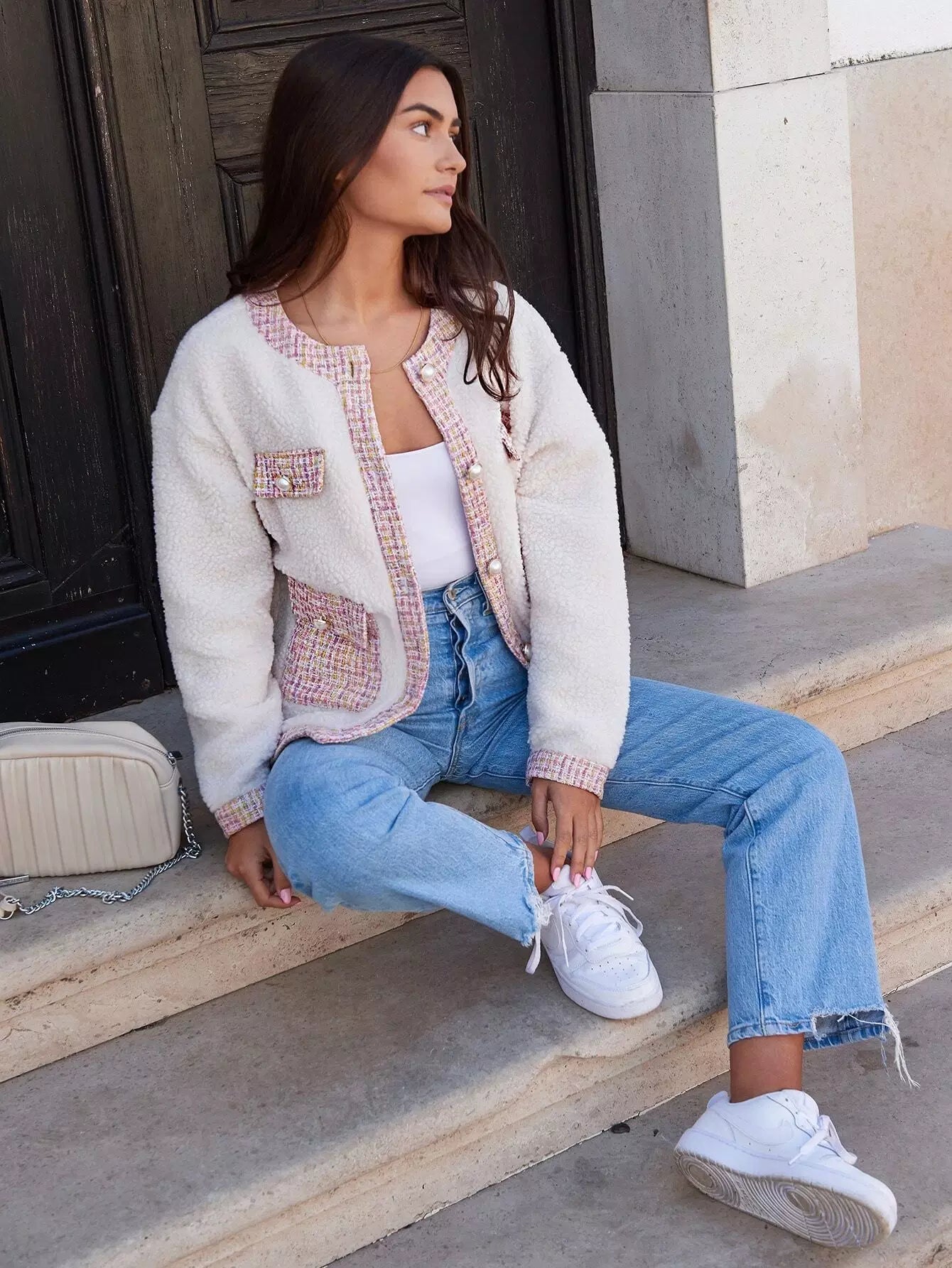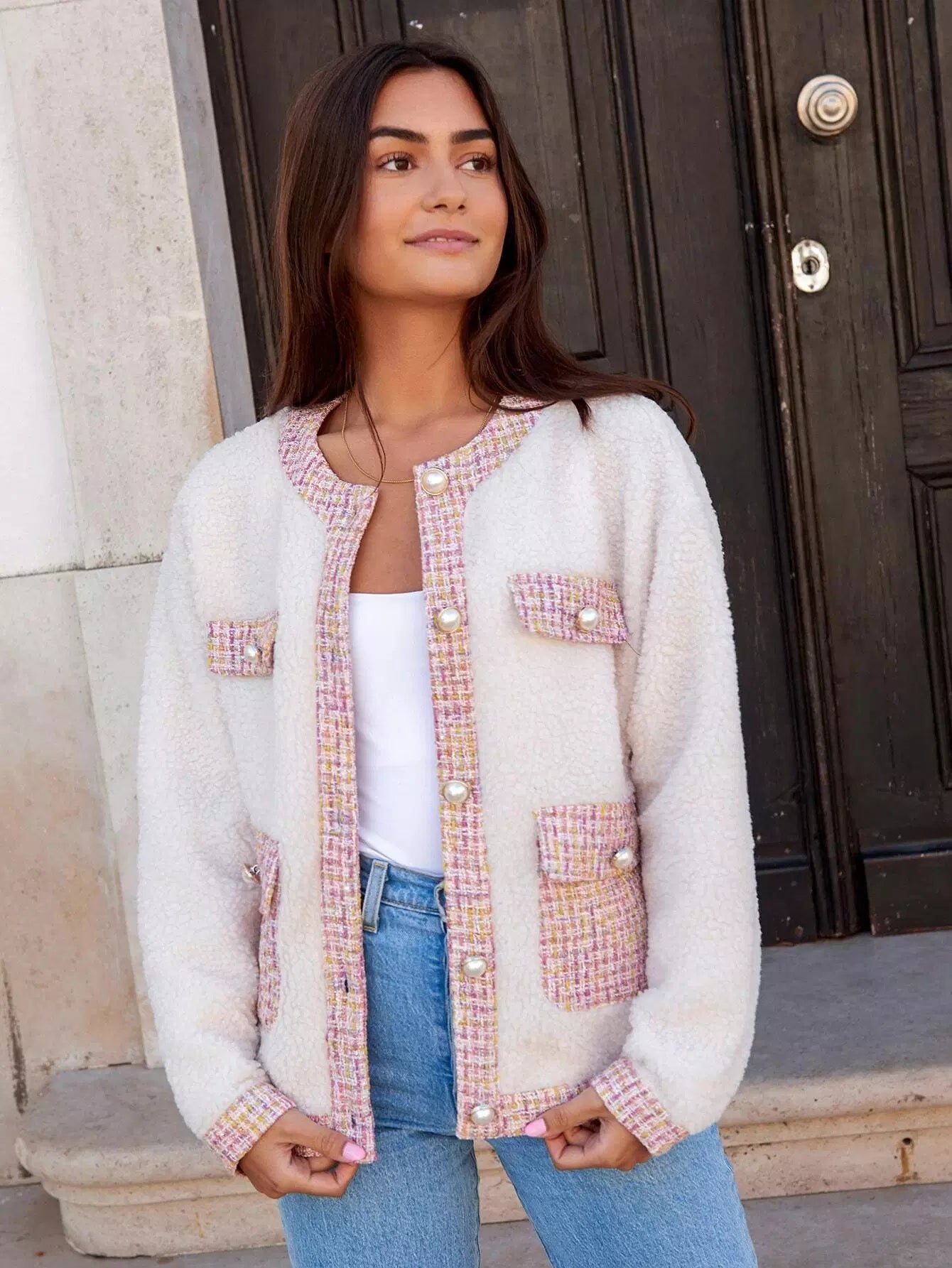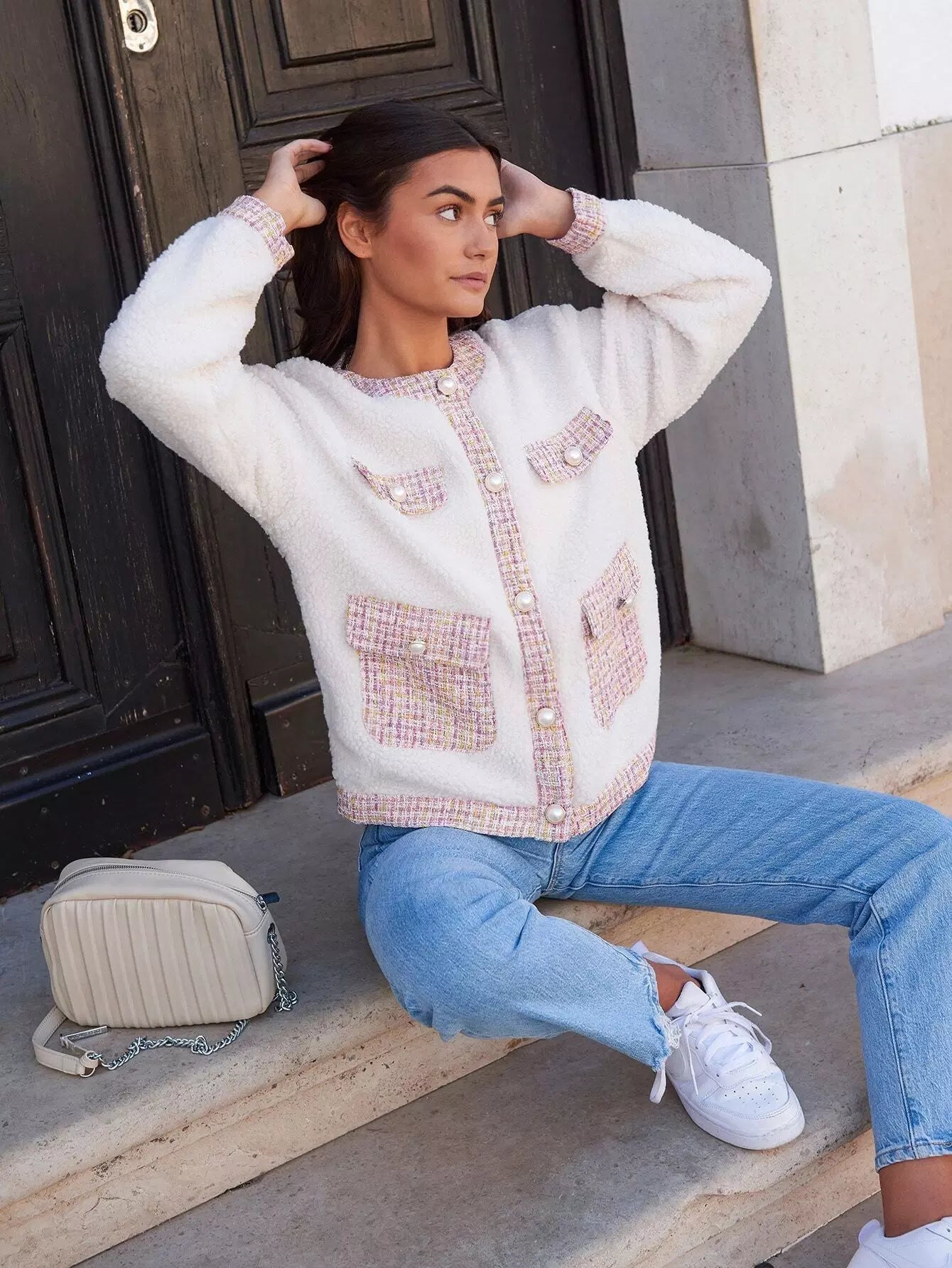 Buttoned Front Tweed Flap Pocket Front Teddy Jacket