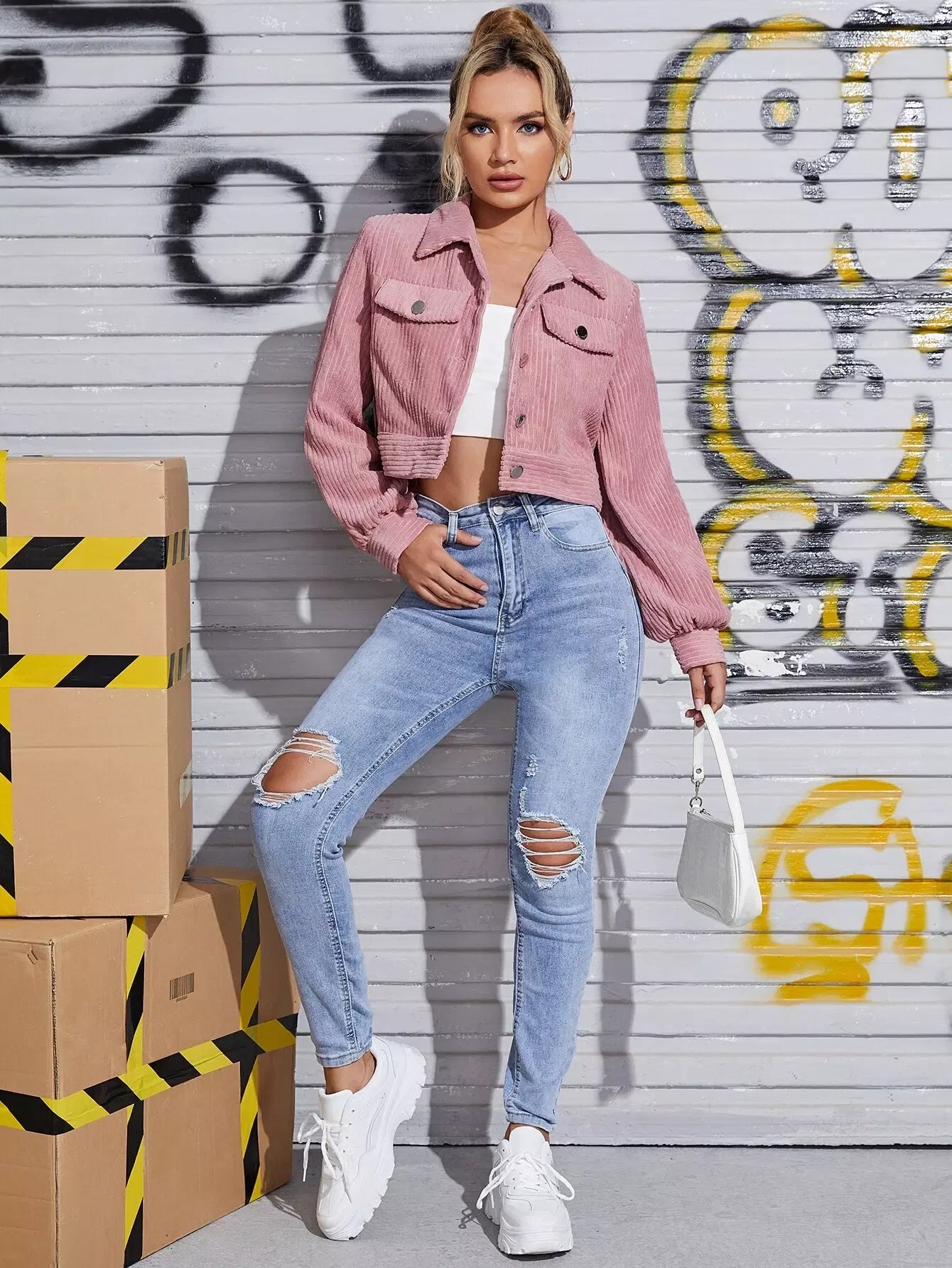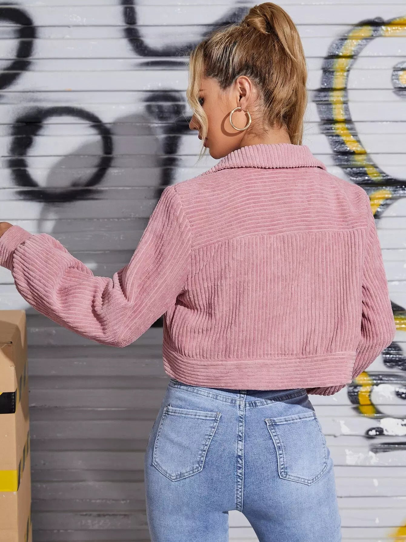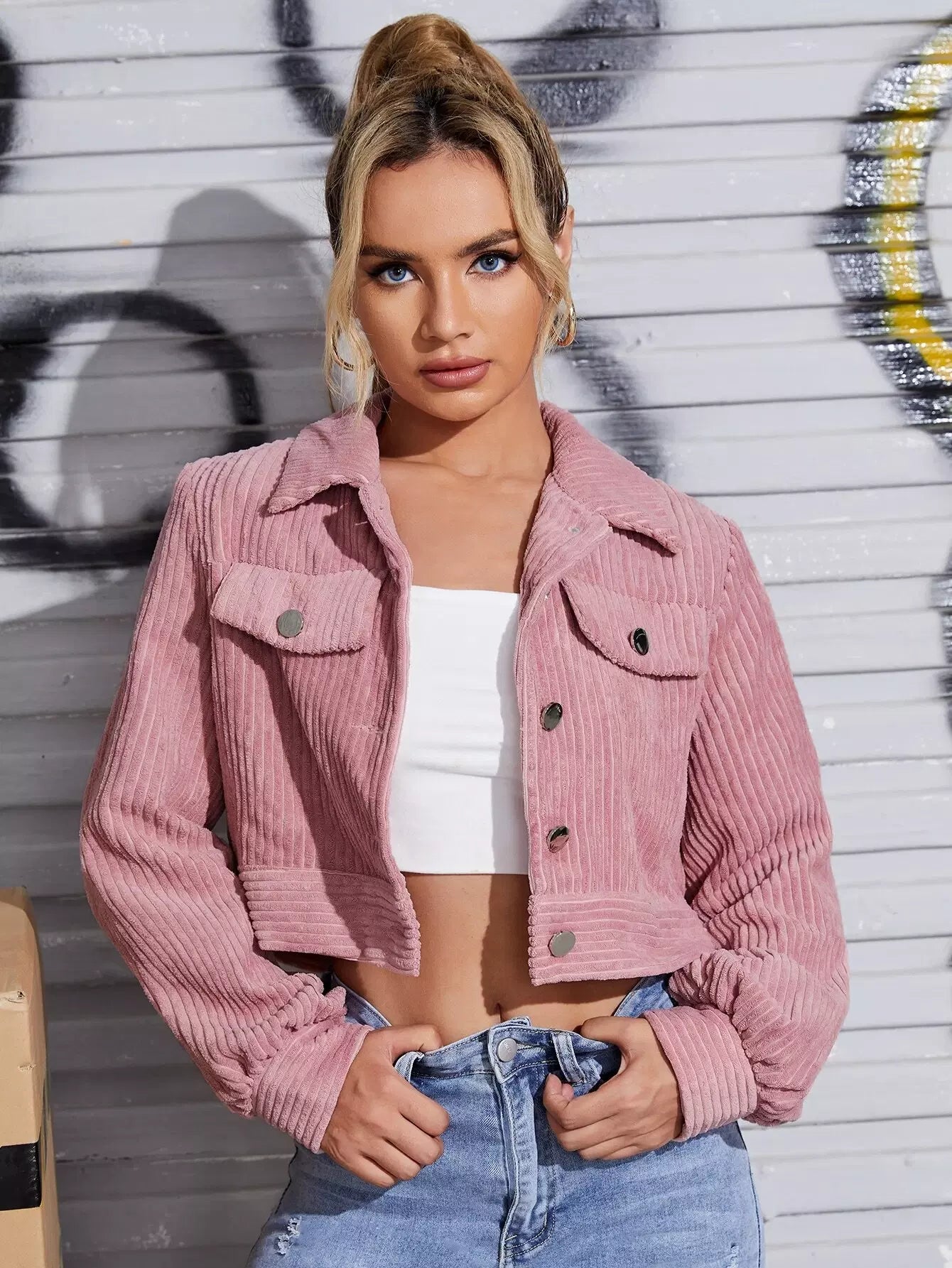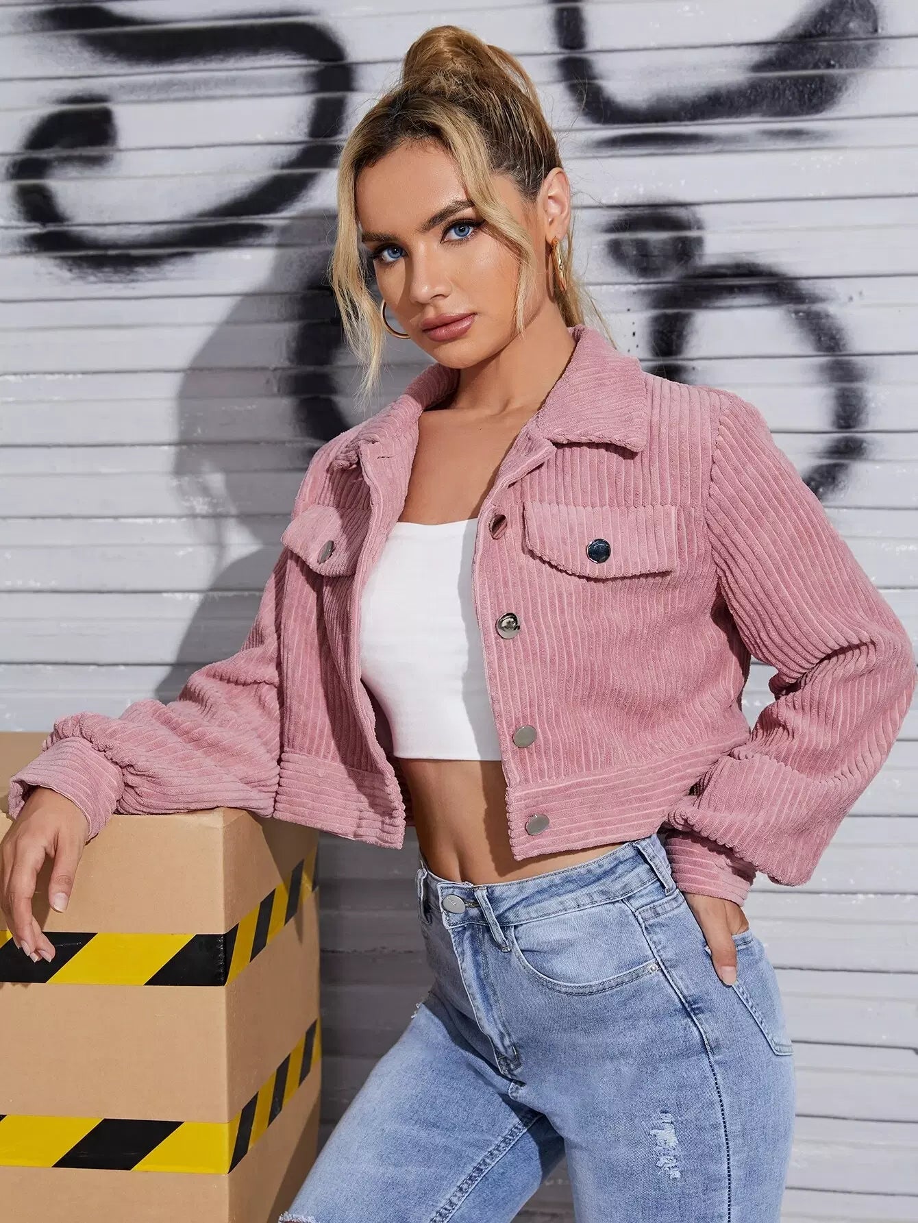 Drop Shoulder Buttoned Front Flap Pocket Patched Cord Jacket