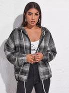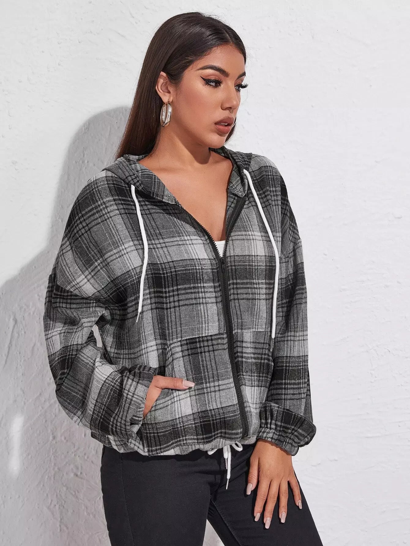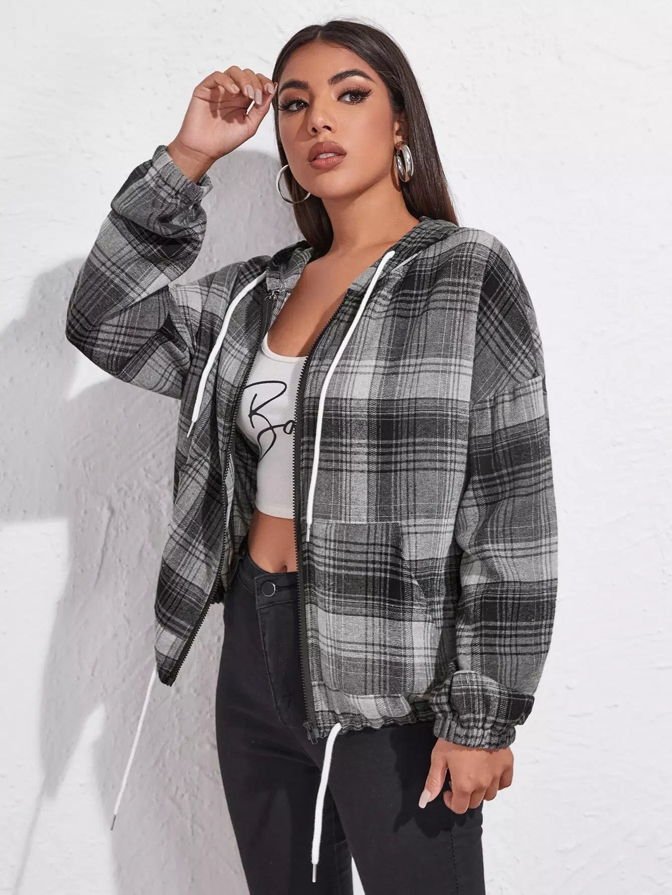 Drop Shoulder Zip Up Drawstring Tartan Hoodie