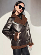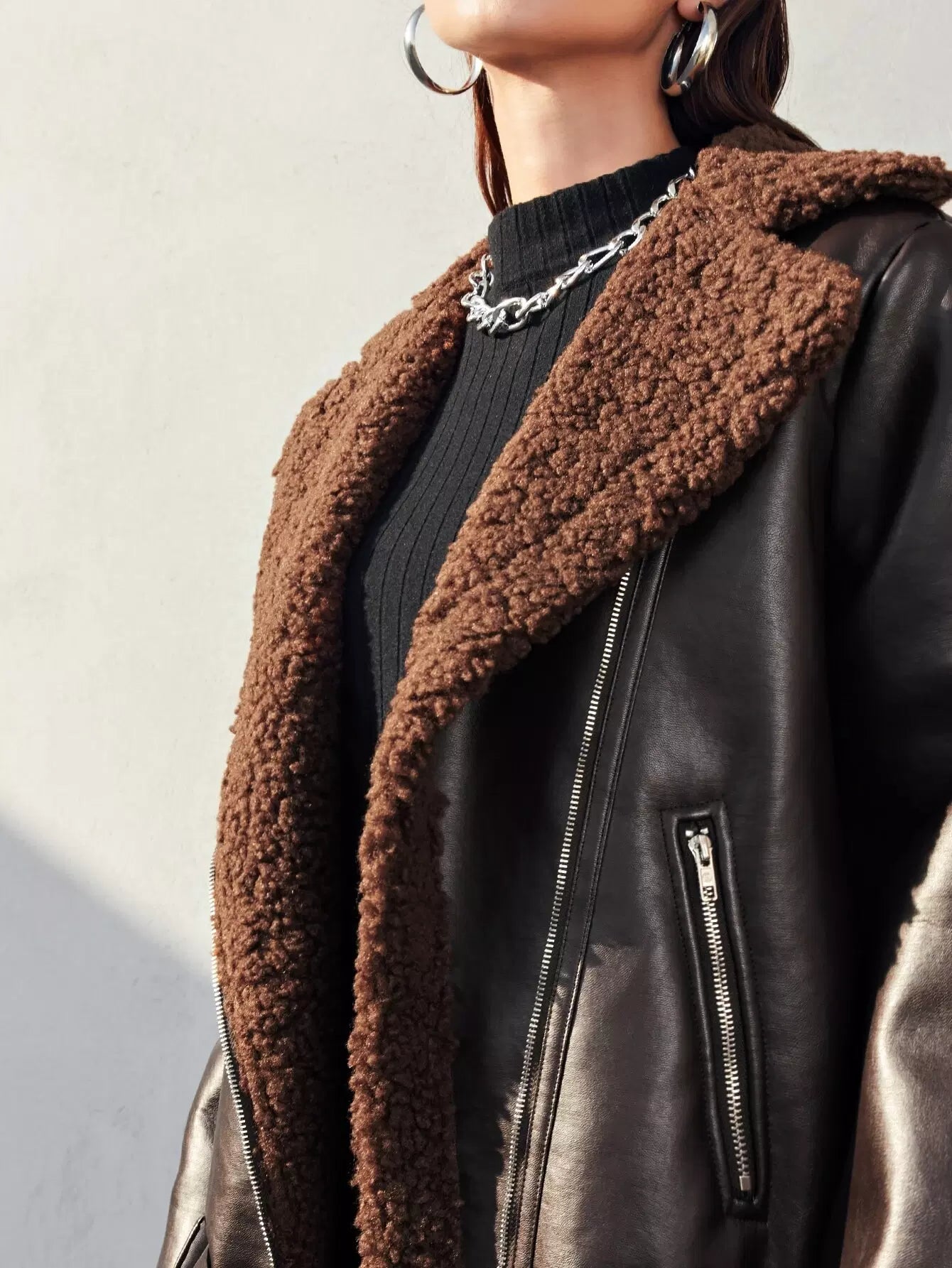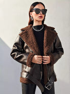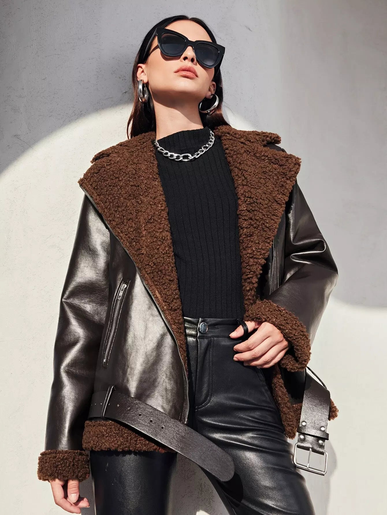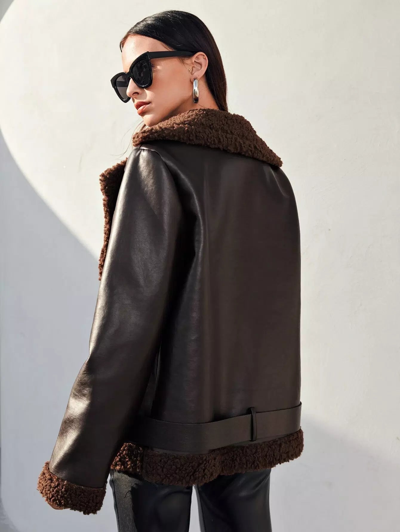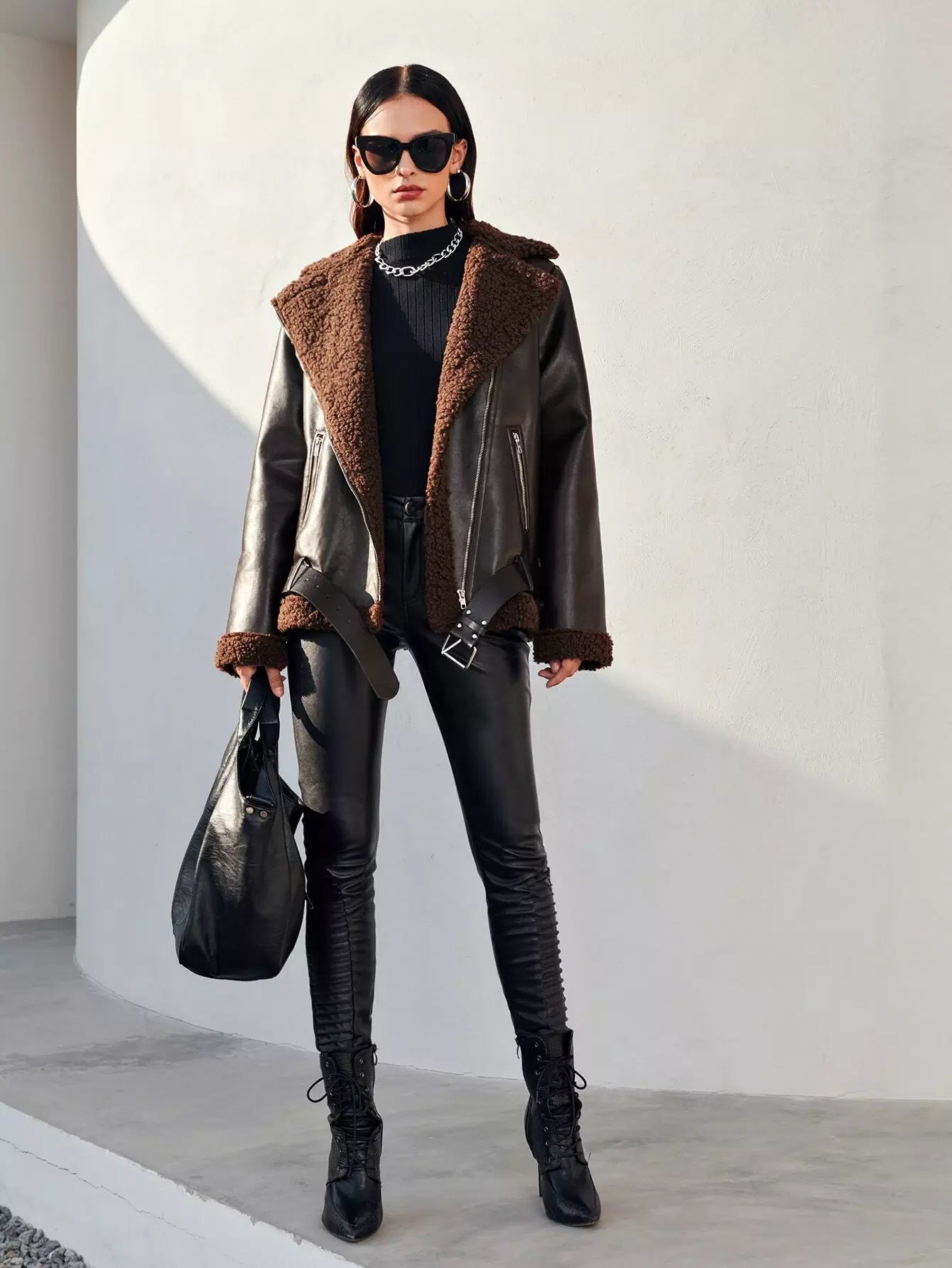 Faux Shearling Lining Zip Up PU Leather Biker Jacket Without Belt
