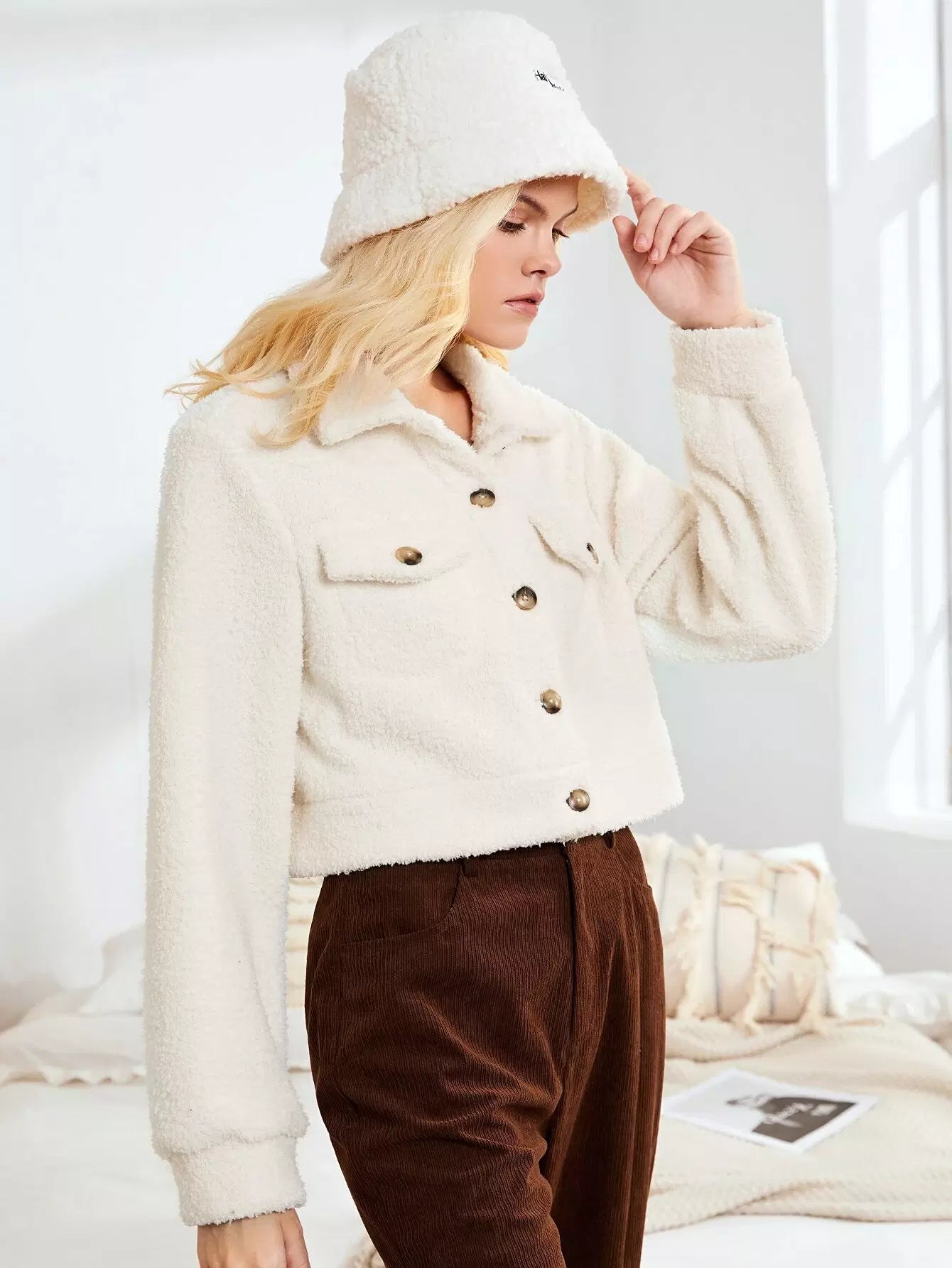 Flap Pocket Drop Shoulder Crop Teddy Jacket