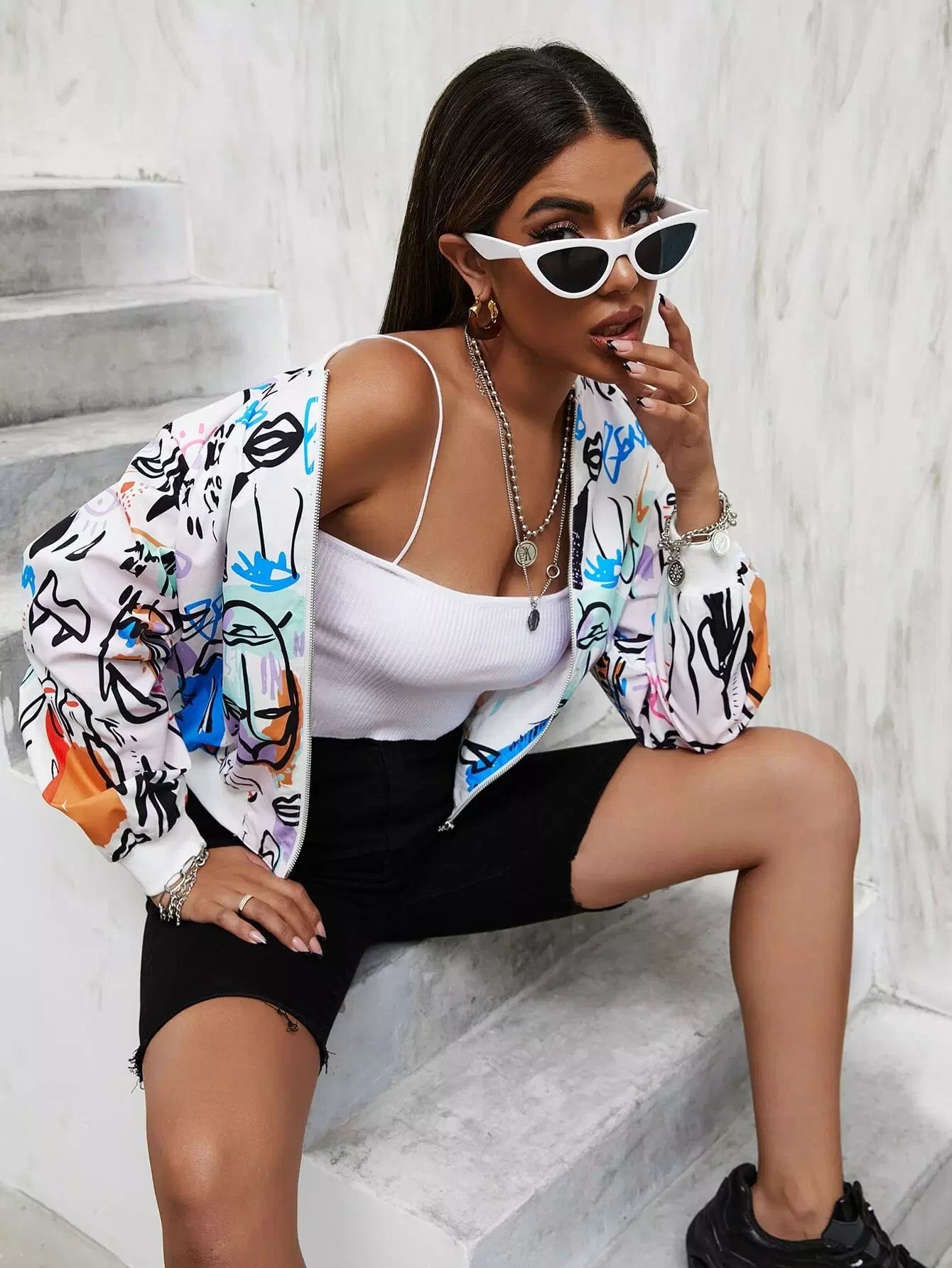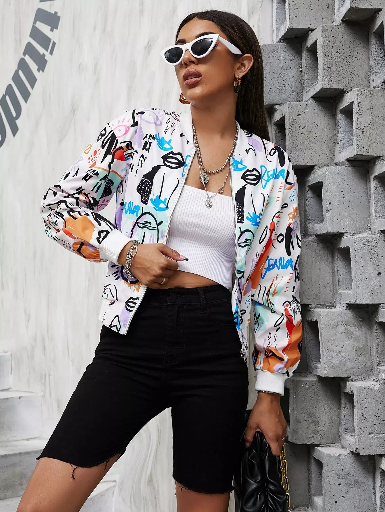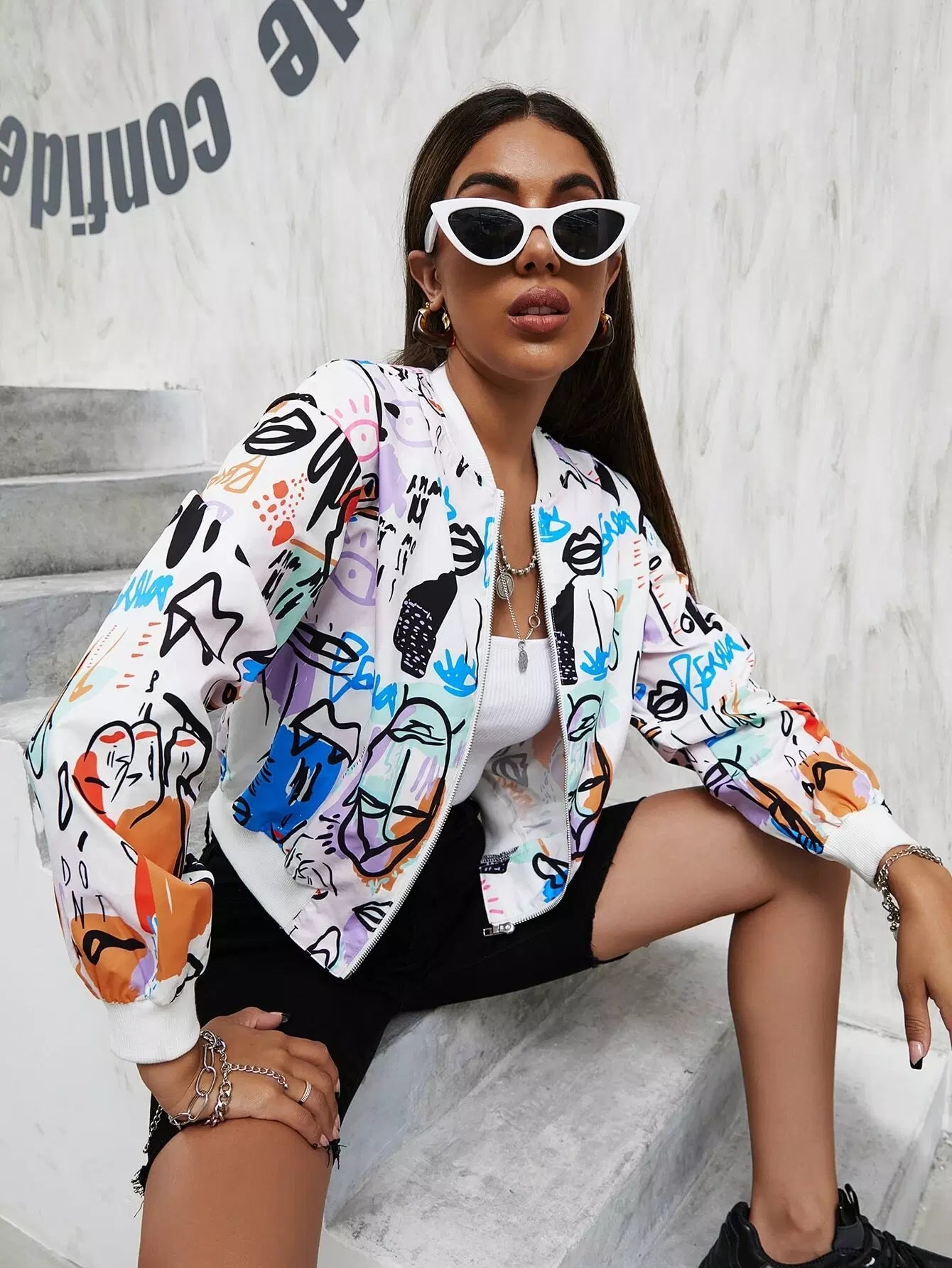 Women - Graffiti Print Zip Up Drop Shoulder Bomber Jacket